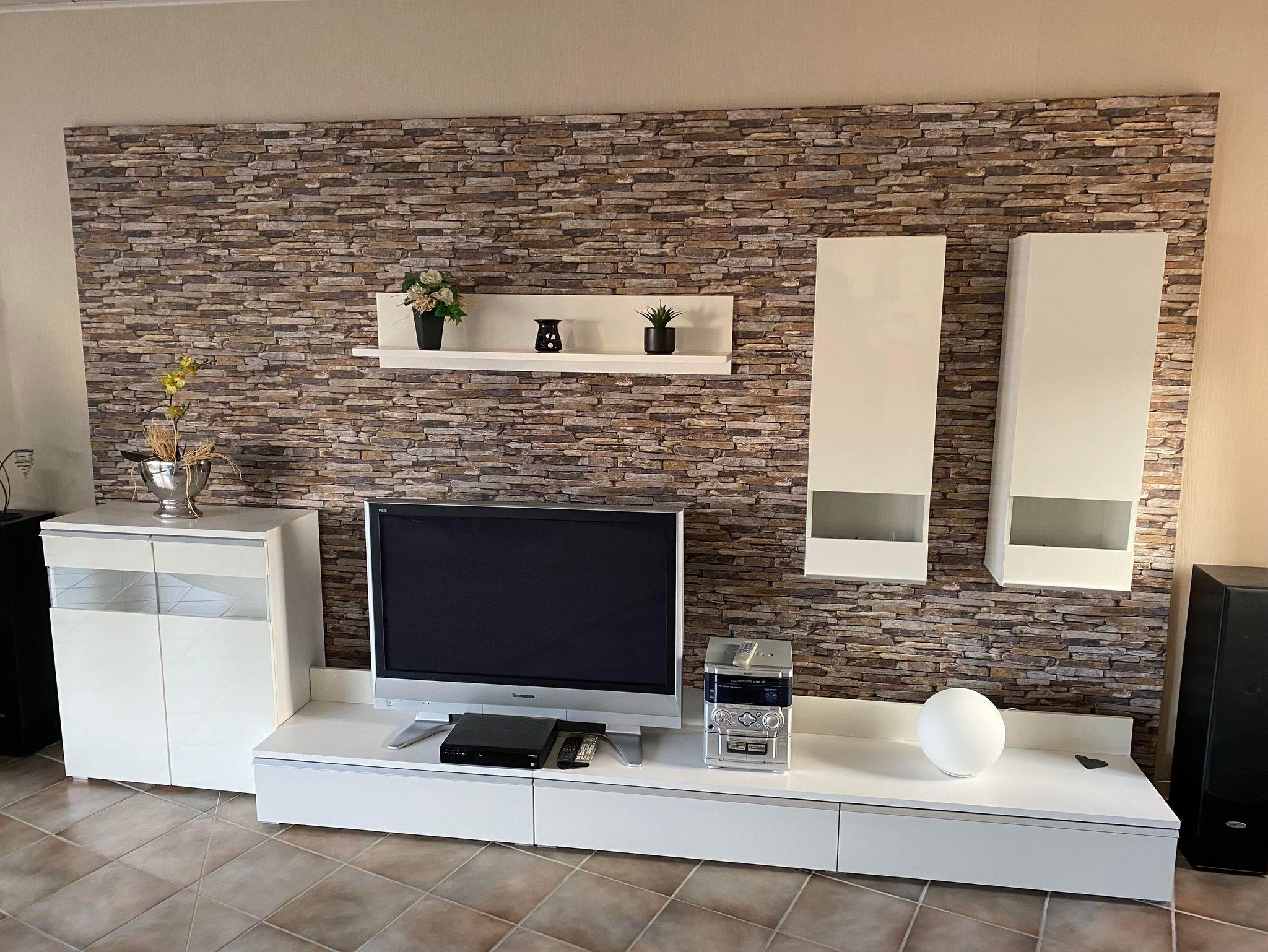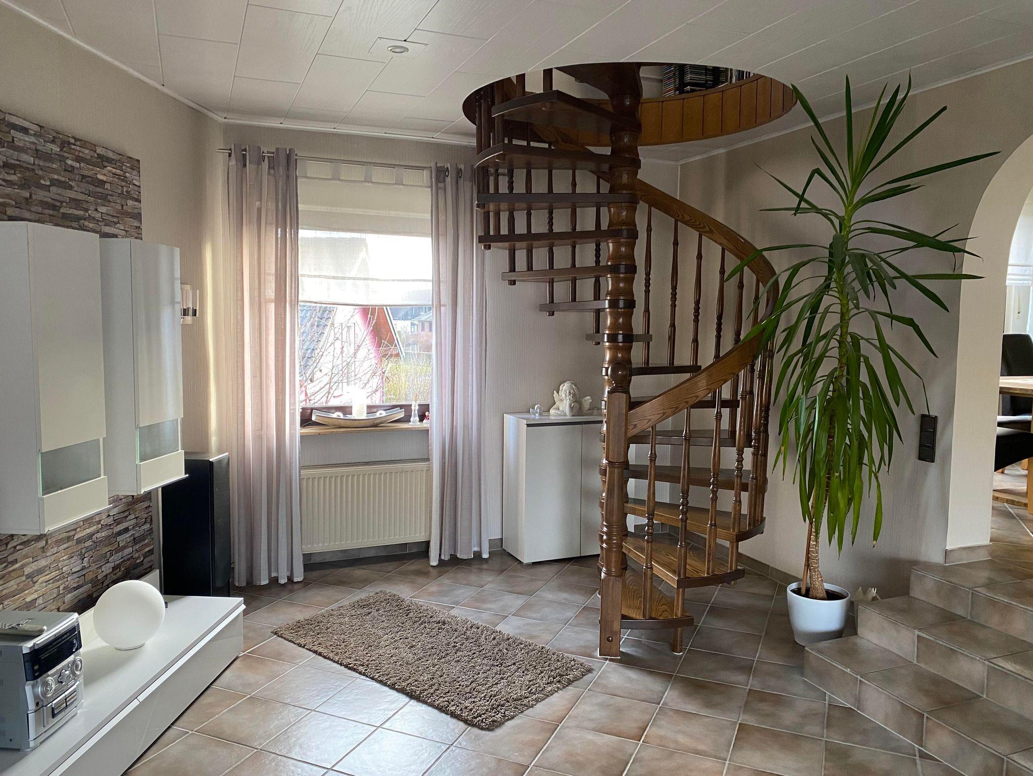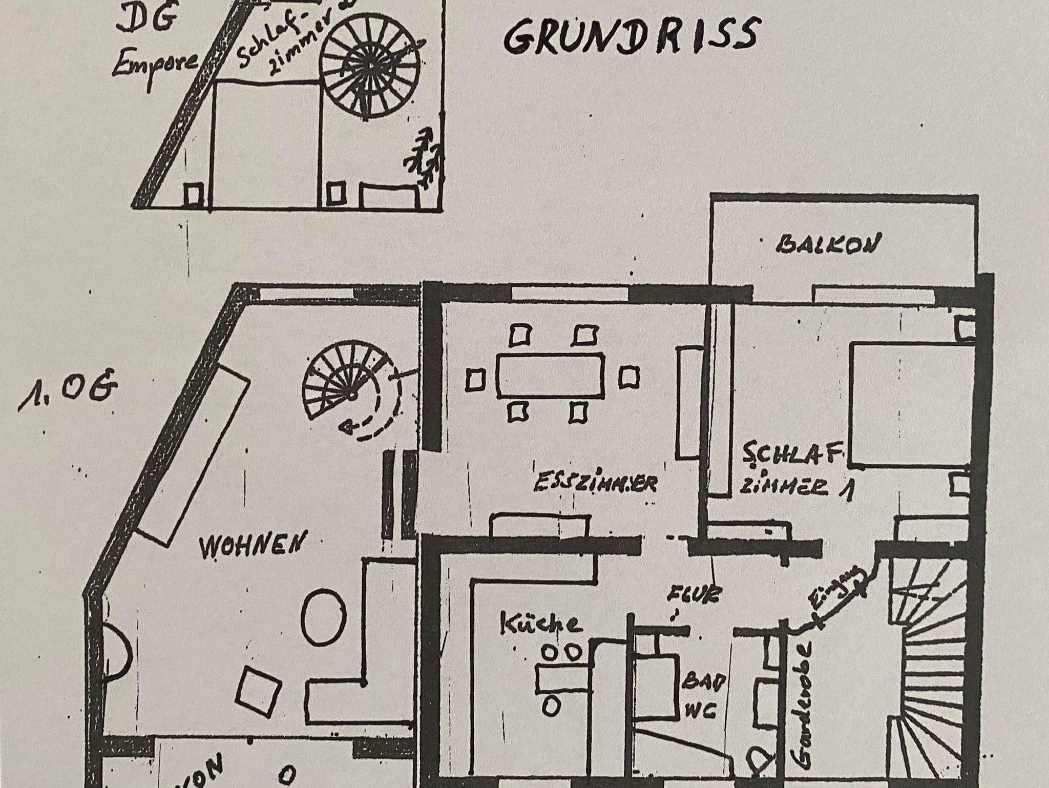 Wohnzimmer 37 qm: Wohnlandschaft mit Bettfunktion (Liegefläche 2,20 x 1,40 m), bequemer Fernsehsessel mit elektr. Motor, Wohnwand mit Flachbild-TV 42 Zoll, Kaminofen, Zimmerbrunnen, Wendeltreppe zur Empore, angrenzender großer Südwestbalkon 12 qm mit Balkonmöbeln und elektrischer Markise