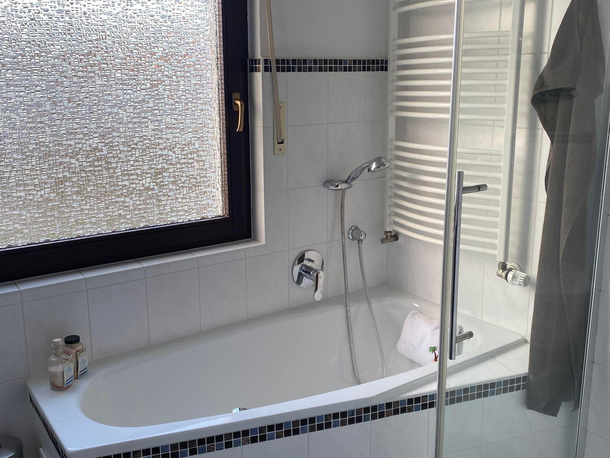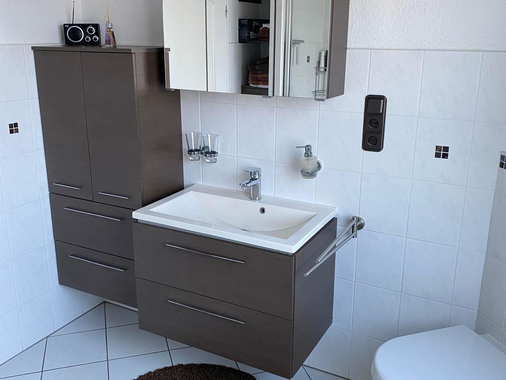 Badezimmer 7 qm: ebenerdige Regendusche, Badewanne, wandhängendes WC, Waschtisch mit Unterschrank, wandhängende Badmöbel, Badheizkörper - Handtuchwärmer, Fußbodenheizung