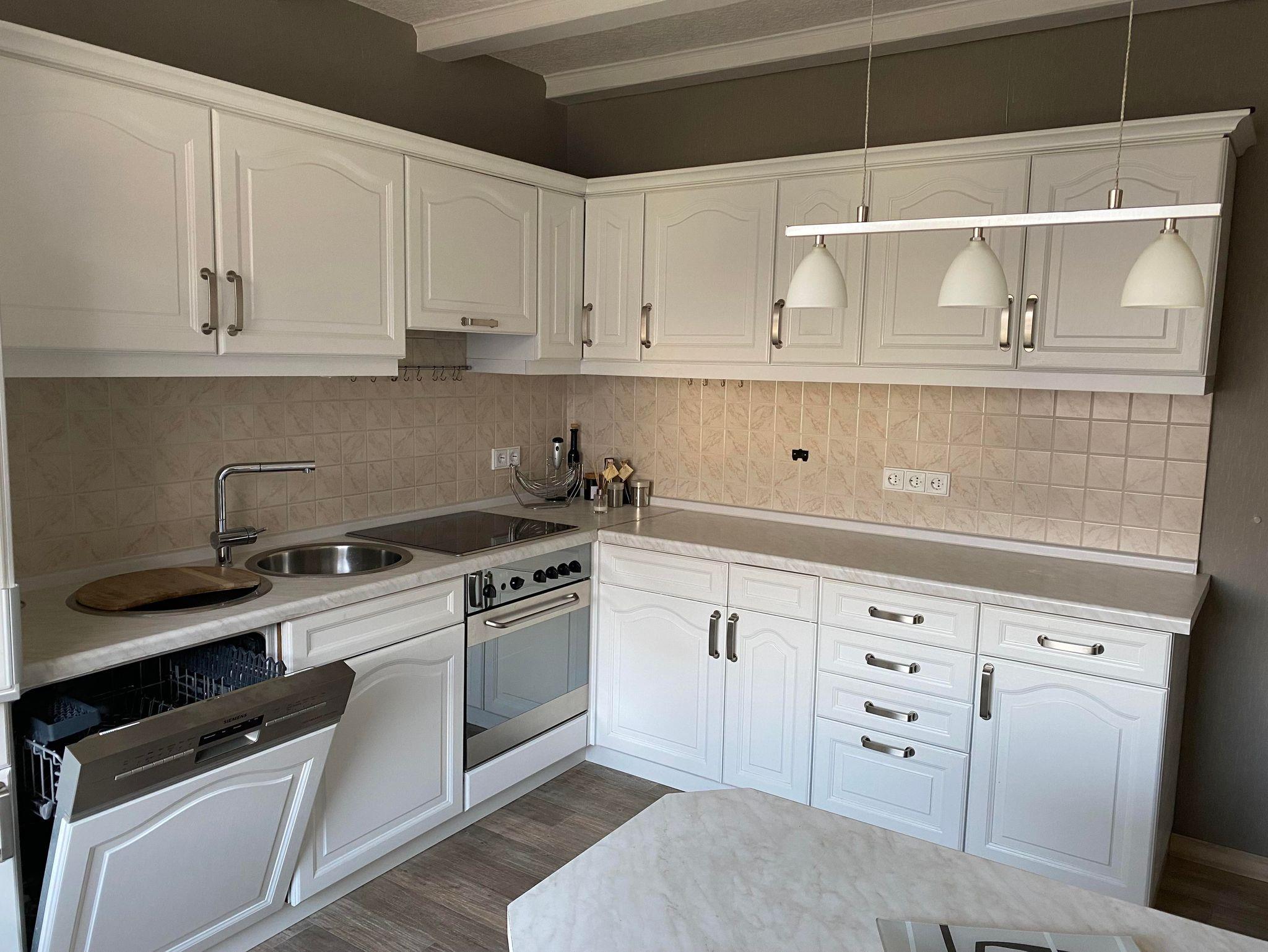Einbauküche 13 qm: moderner Landhausstil in weiß, mit viel Stauraum und voll ausgestattet mit allen Küchenutensilien, Töpfen, Pfannen, Geschirr, Gläser, Besteck, Kaffeemaschine, Toaster, Eierkocher, Wasserkocher, Kühlschrank, Gefrierschrank, Geschirrspüler, Backofen mit Ceranfeld, Tisch mit Platz für 2 Personen