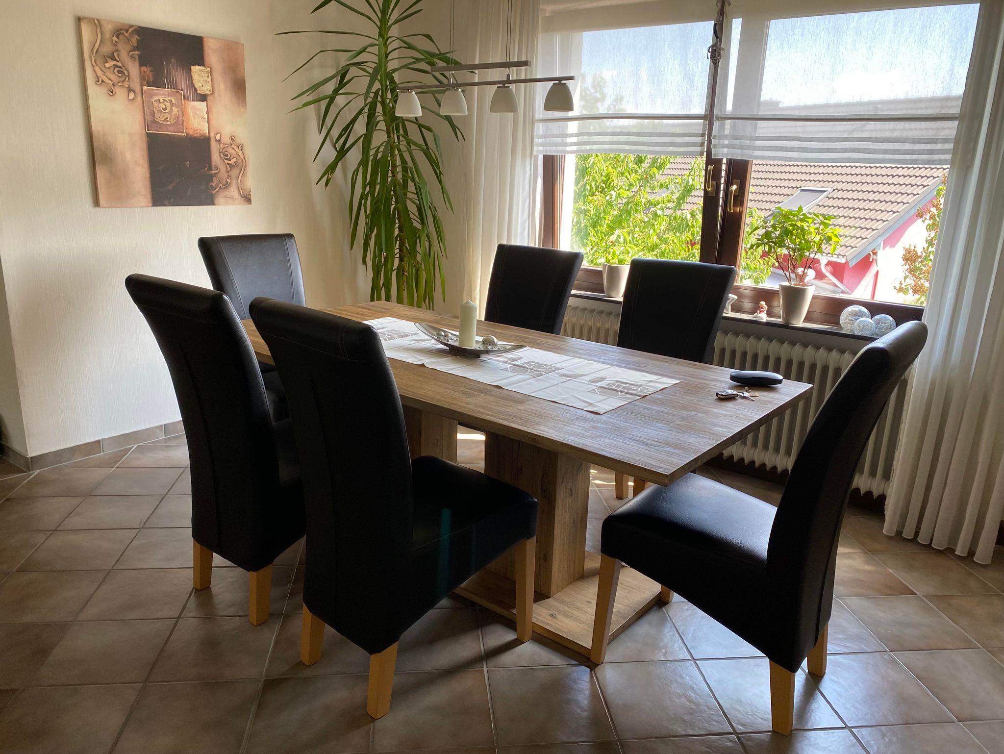 Esszimmer 18 qm: großer Esstisch 2 x 1 m, 6 Stühle, 1 Kinderstuhl (bei Bedarf), 2 Kommoden