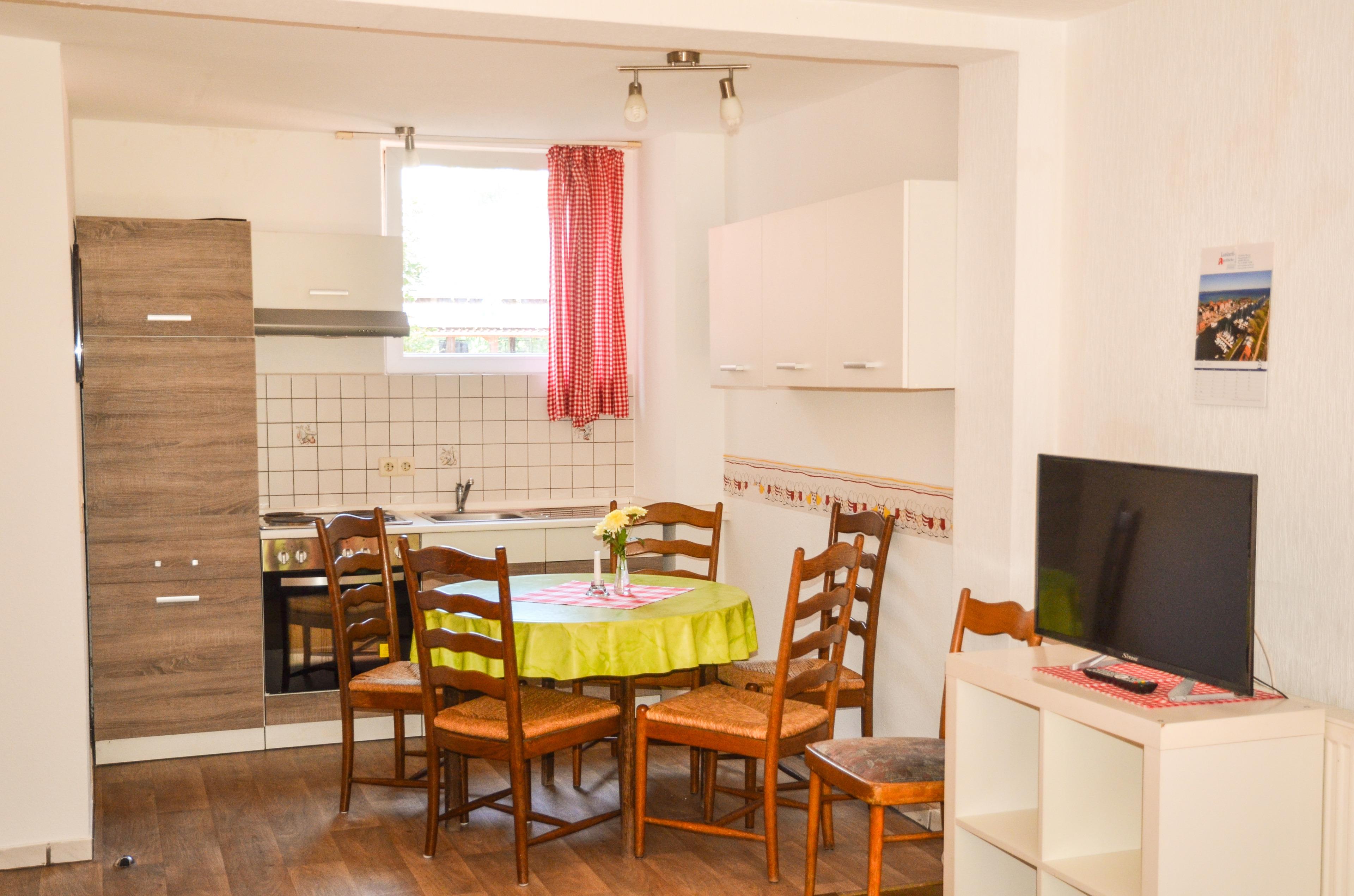 Zweckmäßig eingerichtete Ferienwohnung ca. 50 qm, im Wohnzimmer ist eine einfache Küchenzeile und 1 Doppelbett, ein Schlafraum mit 2 Etagenbetten. Lage: Erdgeschoss. Terrasse mit Sitzgelegenheiten