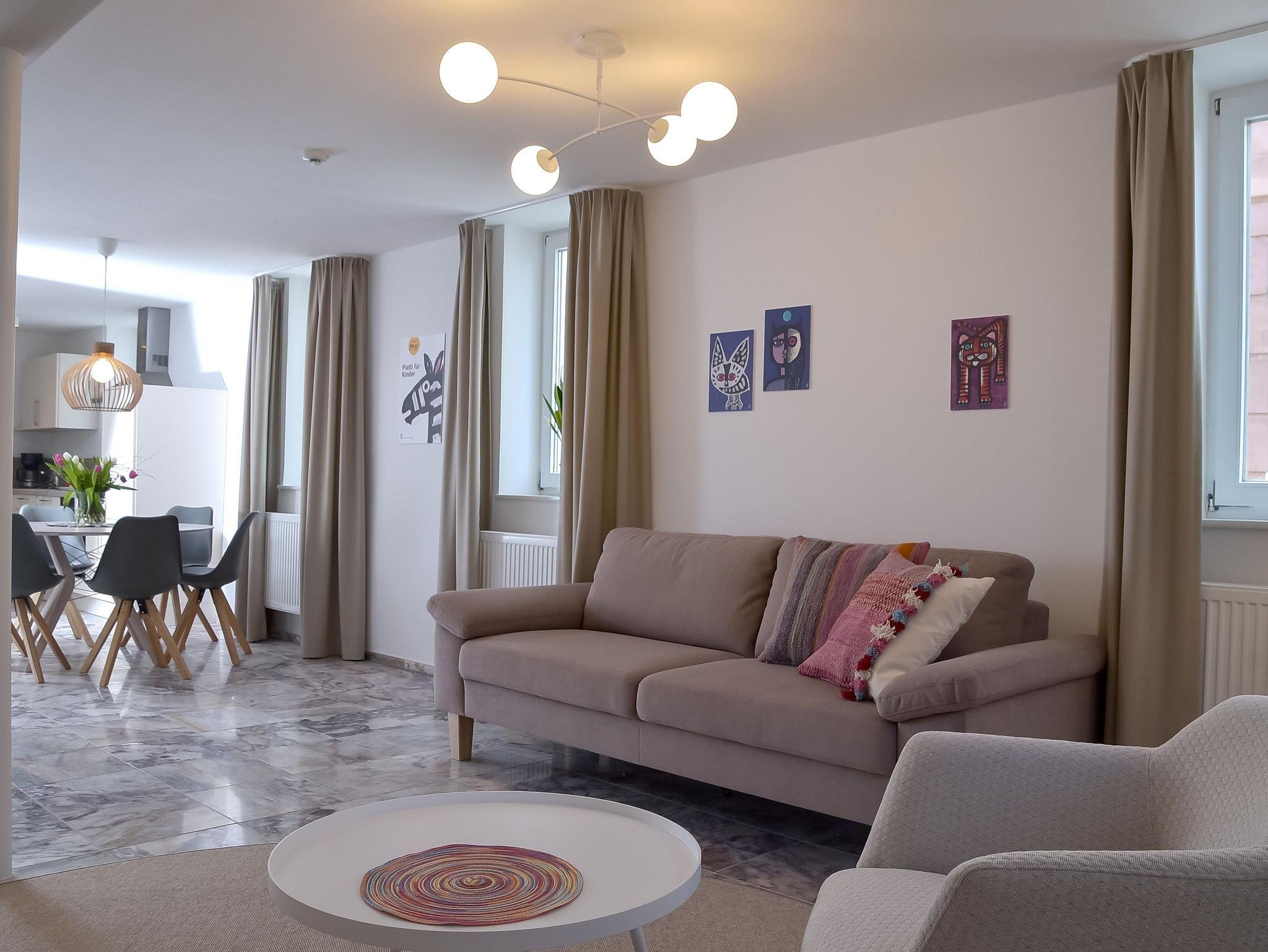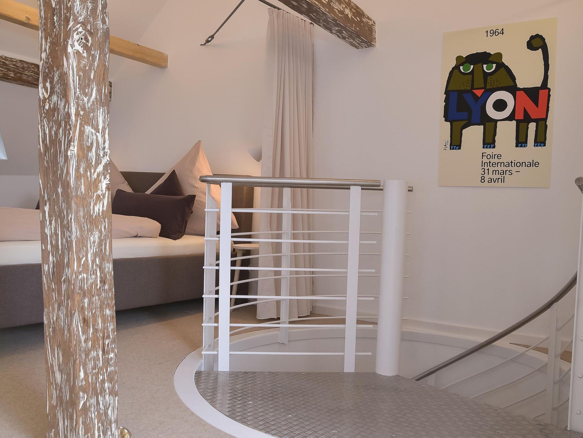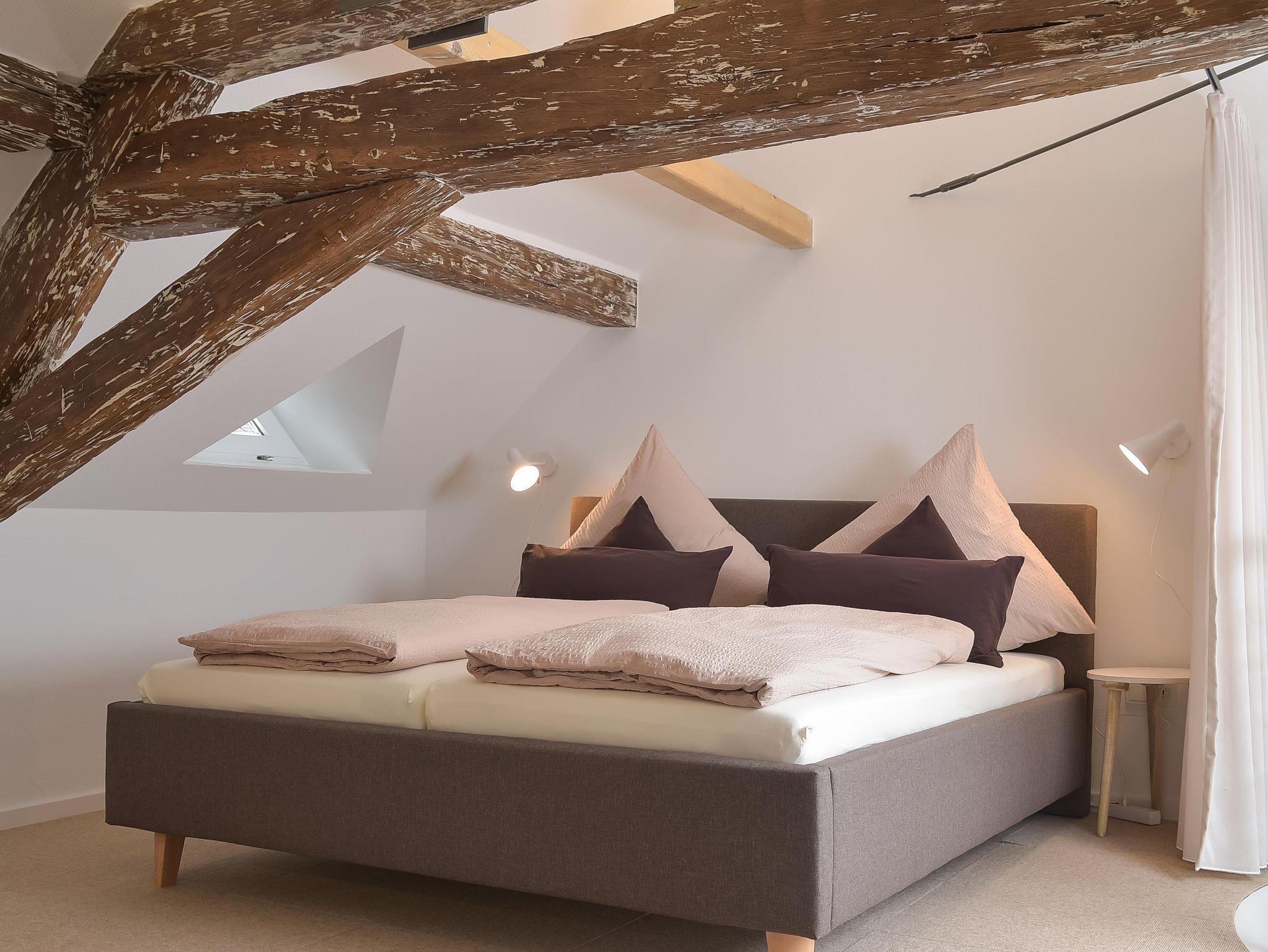 Appartement Piatti ist eine zweigeschossige Maisonettewohnung für 2-3 Personen in einem denkmalgeschützen Stadthaus. Küche, Essbereich, Wohnzimmmer, Leseecke, Schreibtisch, Gäste WC und ein kleinen Abstellraum sind unten. Über eine Wendeltreppe erreichen Sie den Schlafbereich mit offenm Sprengwerk. Die alten Balken (obwohl der Raum sehr hoch ist, müssen Sie sich bei einigen Balken leicht bücken) haben wir abgeschliffen. Hier ist ein Doppelbett, Schrank Sessel und eine Schlafcouch ( 150 x 200 cm ) und das Bad. Im Keller finden Sie Waschmaschine und Trockner und ein Fahrradraum. Ausgezeichnet mit 5 Sternen
