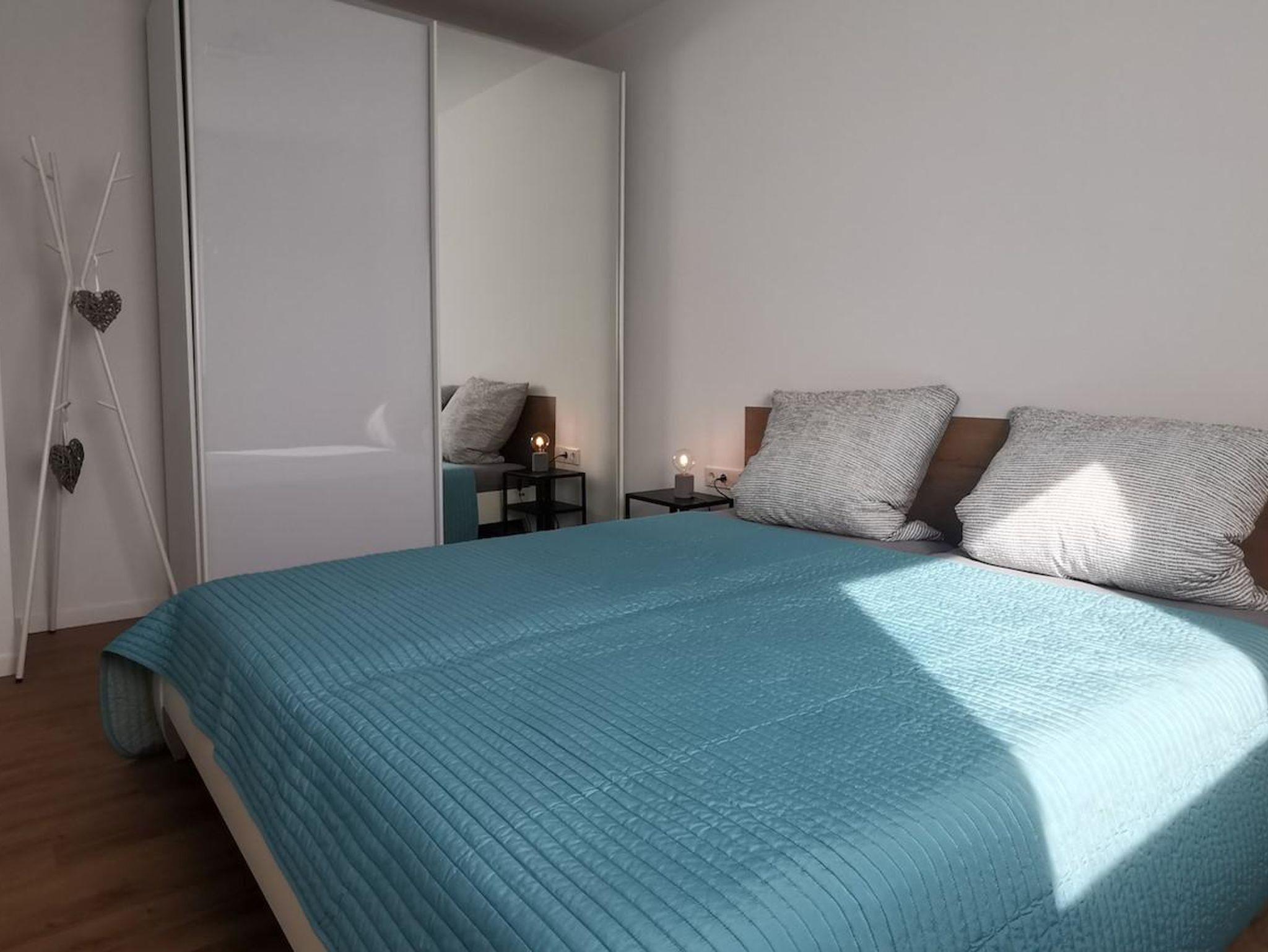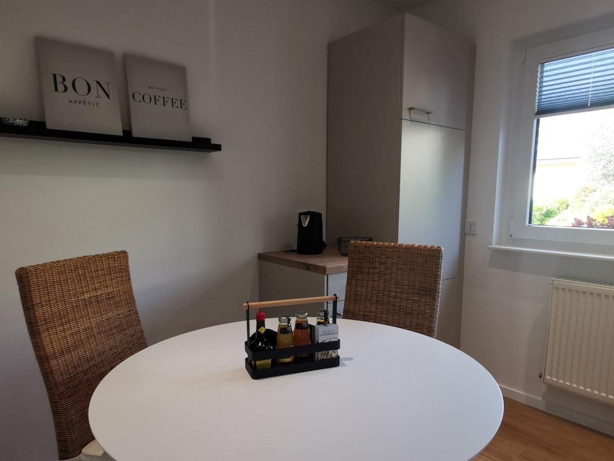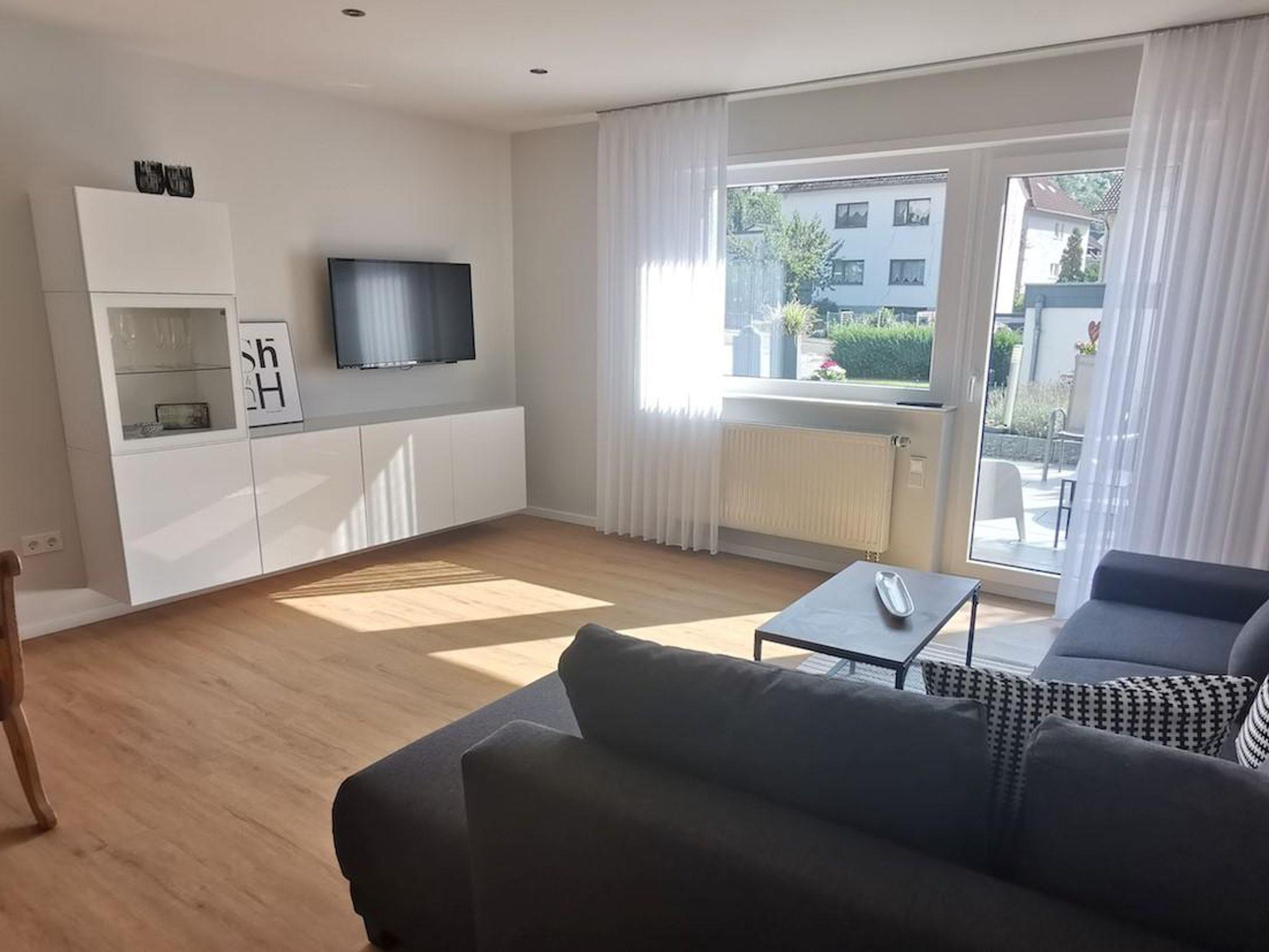 Die 70 qm große Wohnung wurde 2021 vollständig renoviert. Sie besteht aus einem Wohnzimmer, 2 Schlafzimmern (davon 1 Schlafzimmer offen zum Wohnraum) mit je einem Doppelbett (1,80 m) und (1,40m), einer voll ausgestatteten Küche mit Essplatz und einem Duschbad. Aus dem Wohnzimmer heraus befindet sich ein direkter Zugang zu einer großen Sonnenterrasse mit Markise. Die Wohnung ist für Einzelreisende, Familien mit Kindern, Geschäftsreisende und Senioren (Wohnung befindet sich im Erdgeschoss und ist barrierefrei zugänglich) geeignet. Es stehen 2 Autostellplätze für Feriengäste zur Verfügung. Für Fahrrad - oder Motorradfahrer besteht die Möglichkeit, die Fahrzeuge in einer Garage unterzustellen und die Akkus für E-Bikes aufzuladen.