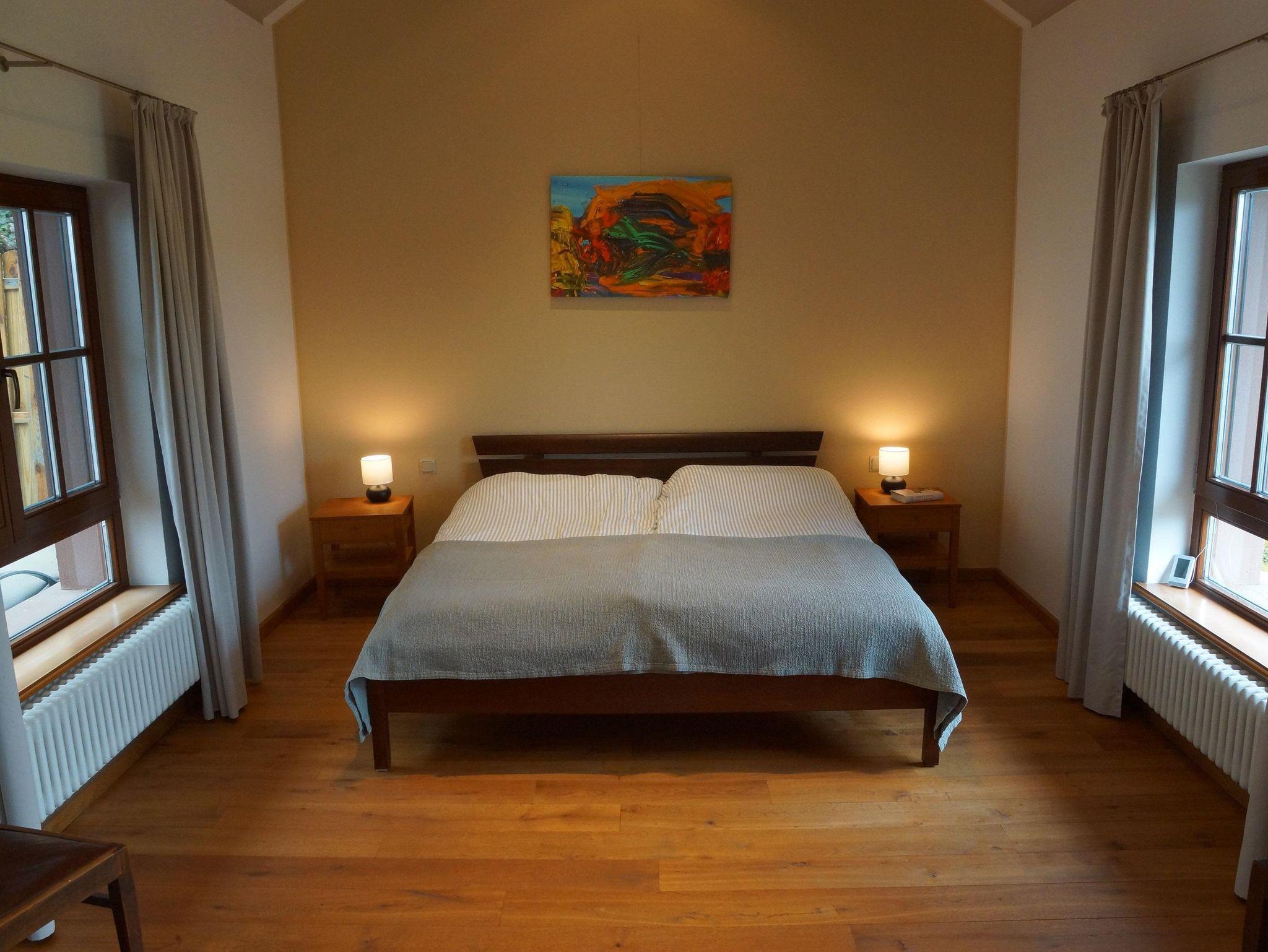 Auf 57 m² Wohnfläche bietet die Ferienwohnung Platz für zwei Personen. Die hohen Decken und Fenster machen die Wohnung hell und geräumig. Der offene Wohn- und Essbereich mit Kaminofen lädt zum gemütlichen Kochen und Essen ein, ein Sofa mit Fernseher zum Entspannen am Abend. Die Küche ist mit zwei Kochplatten, einem Kühlschrank mit Gefrierfach, Wasserkocher, Kaffeemaschine und Toaster ausgestattet. Eine Auswahl an Bio-Tees und Fairtrade-Kaffee steht zur Verfügung. In dem großzügigen Schlafzimmer mit Doppelbett und Bettwäsche aus reinen, hochwertigen Naturmaterialien ist für erholsamen Schlaf gesorgt. Durch eine Tür gelangt man vom Schlafzimmer auf eine ruhige Terrasse mit Blick in den hochstehenden Wald. Das große Bad aus Natursteinfliesen verfügt über eine ebenerdige, offene Dusche und Fußbodenheizung. Auf der Terrasse vor der Wohnung lässt sich mit dem Blick ins Tal auch leicht ein ganzer Tag verbringen, vom Frühstück am Morgen bis zum Wein am Abend. Das Grundstück bietet außerdem eine Feuerstelle mit Grillmöglichkeit (Saarländisch „Schwenker“). Holz wird auf Wunsch bereitgestellt. Die Mitnahme von Haustieren ist nach vorheriger Absprache möglich. Ein Parkplatz befindet sich direkt vor dem Haus. Das WLAN (Glasfaseranschluss) kann kostenlos genutzt werden.