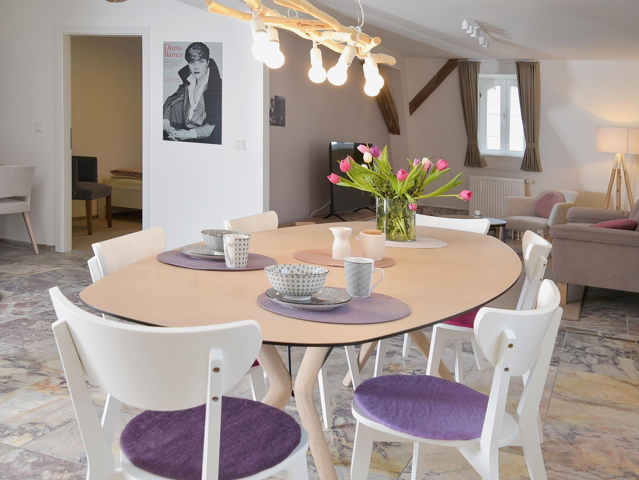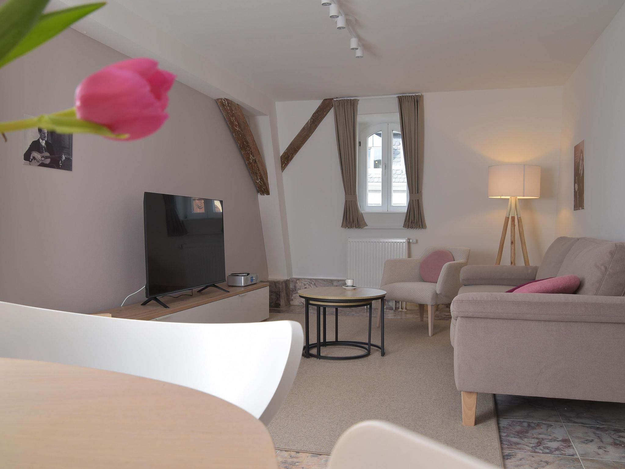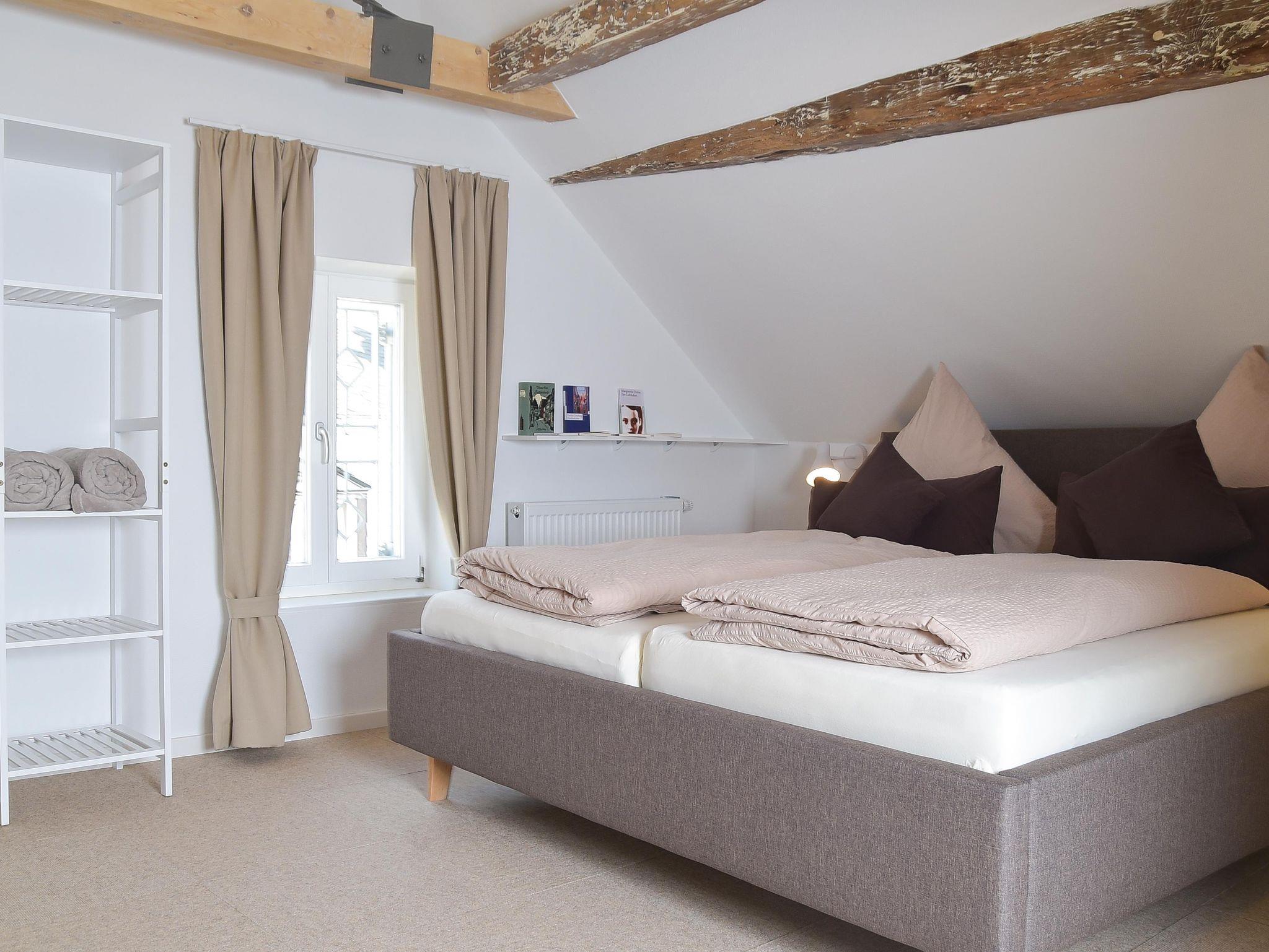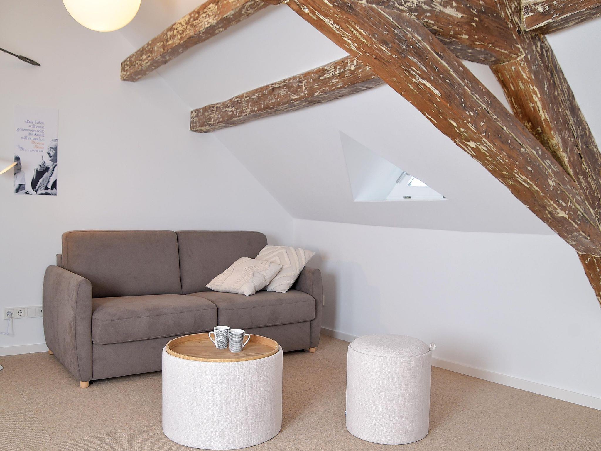 Appartement Bücherliebe ist eine zweigeschossige Maisonettewohnung für 4 Personen in einem denkmalgeschützen Stadthaus. Küche, Essbereich, Wohnzimmmer, Leseecke, Schreibtisch, Gäste WC, kleines Schlafzimmer mit 2 Betten sind unten. Über eine Wendeltreppe erreichen Sie den Schlafbereich mit offenem Sprengwerk. Die alten Balken (obwohl der Raum sehr hoch ist, müssen Sie sich bei einigen Balken leicht bücken) haben wir abgeschliffen. Hier ist ein Doppelbett, Schrank, Sessel und eine Schlafcouch und das Bad. Im Keller sind Waschmaschine und Trockner und ein Fahrradraum. Ausgzeichnet mit 5 Sternen.