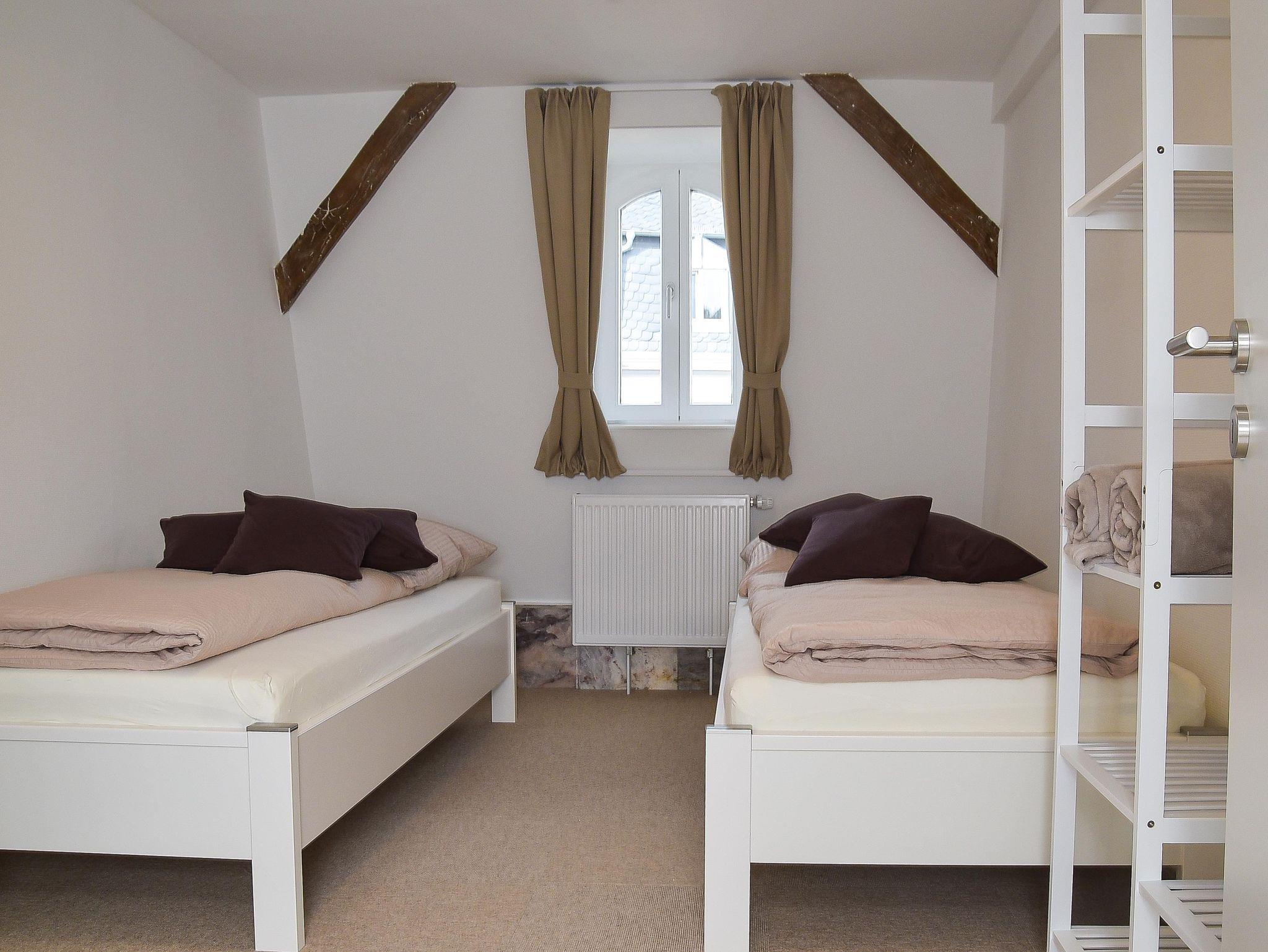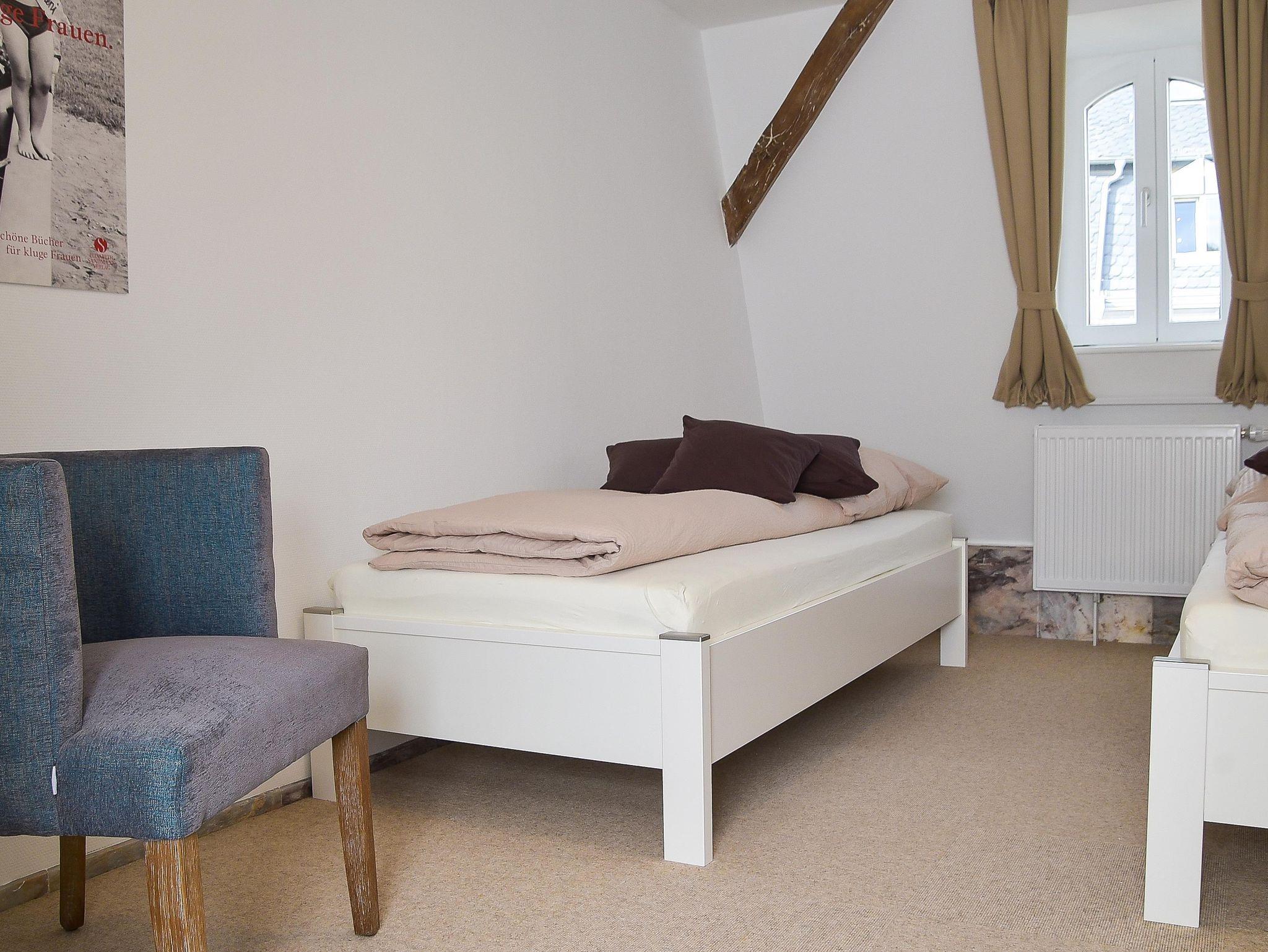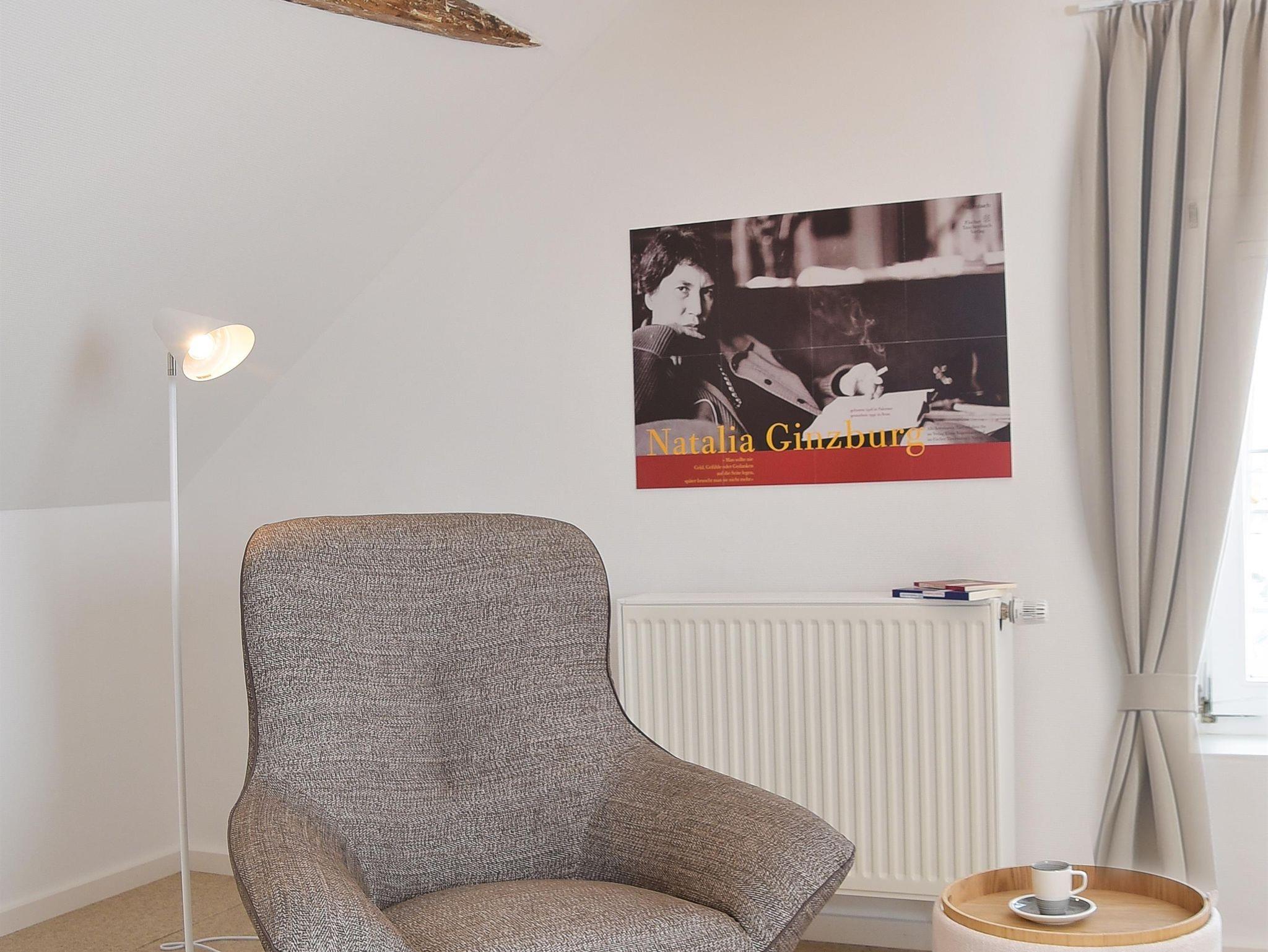 Appartement Bücherliebe ist eine zweigeschossige Maisonettewohnung für 4 Personen in einem denkmalgeschützen Stadthaus. Küche, Essbereich, Wohnzimmmer, Leseecke, Schreibtisch, Gäste WC, kleines Schlafzimmer mit 2 Betten sind unten. Über eine Wendeltreppe erreichen Sie den Schlafbereich mit offenem Sprengwerk. Die alten Balken (obwohl der Raum sehr hoch ist, müssen Sie sich bei einigen Balken leicht bücken) haben wir abgeschliffen. Hier ist ein Doppelbett, Schrank, Sessel und eine Schlafcouch und das Bad. Im Keller sind Waschmaschine und Trockner und ein Fahrradraum. Ausgzeichnet mit 5 Sternen.