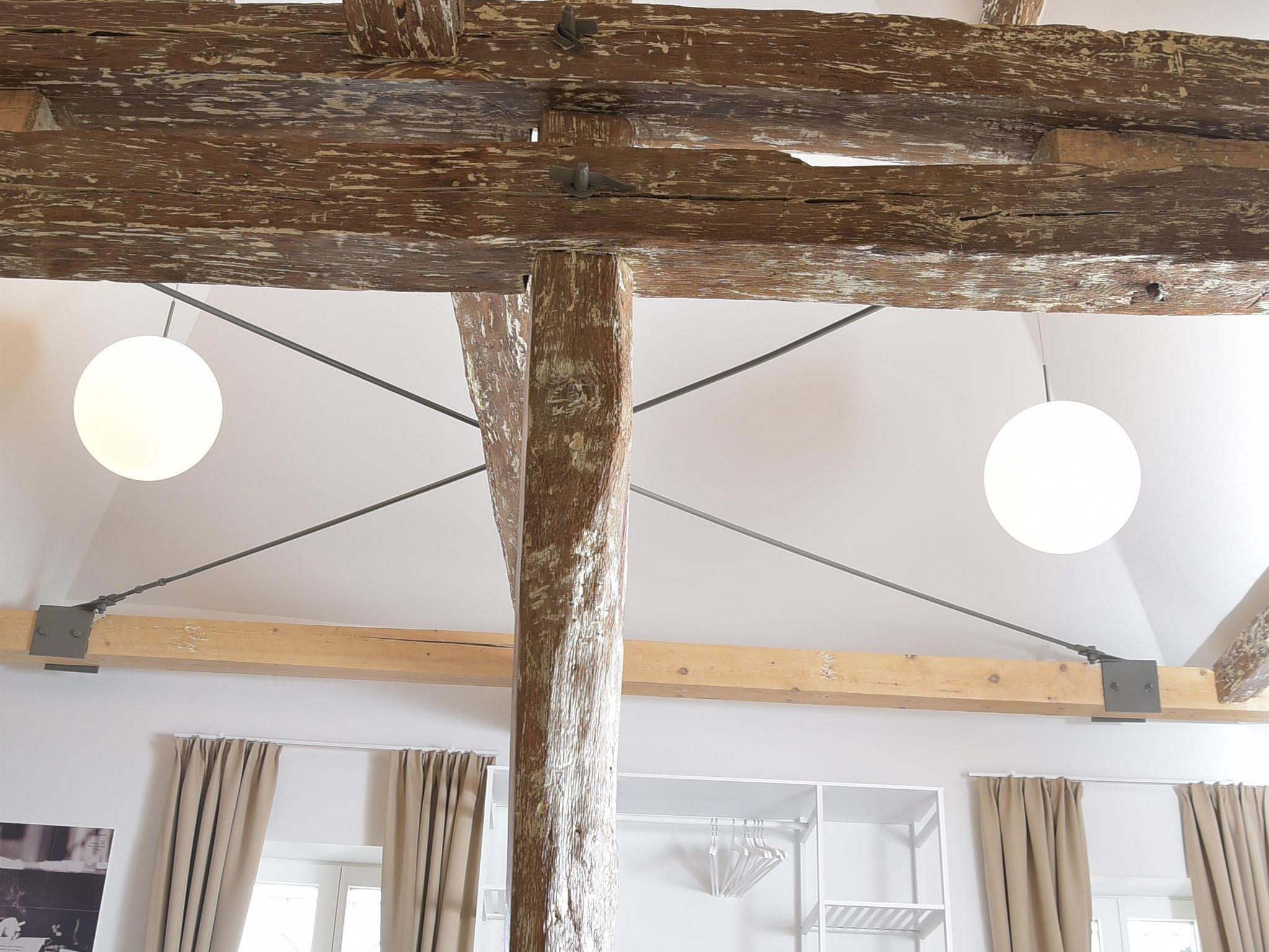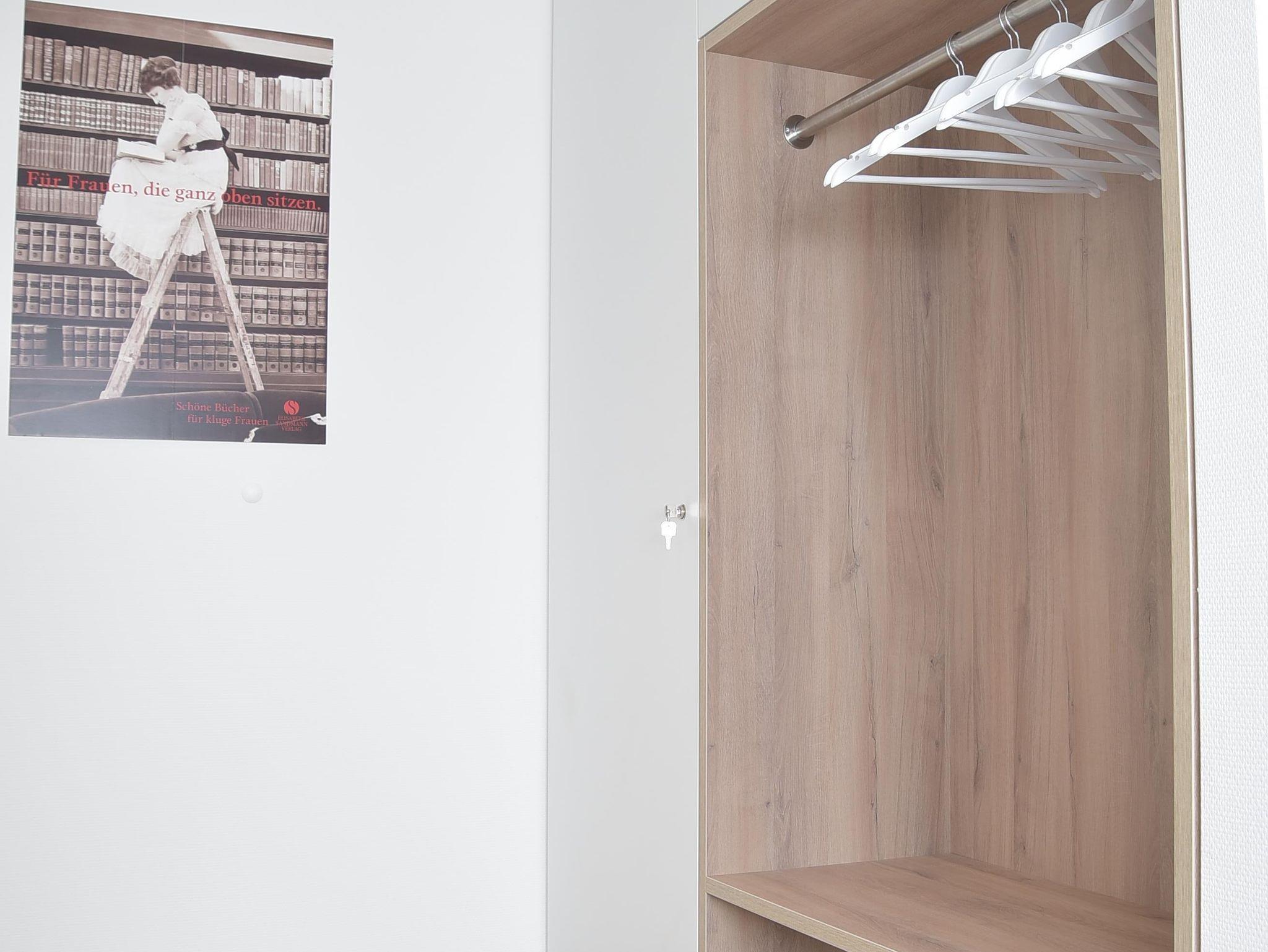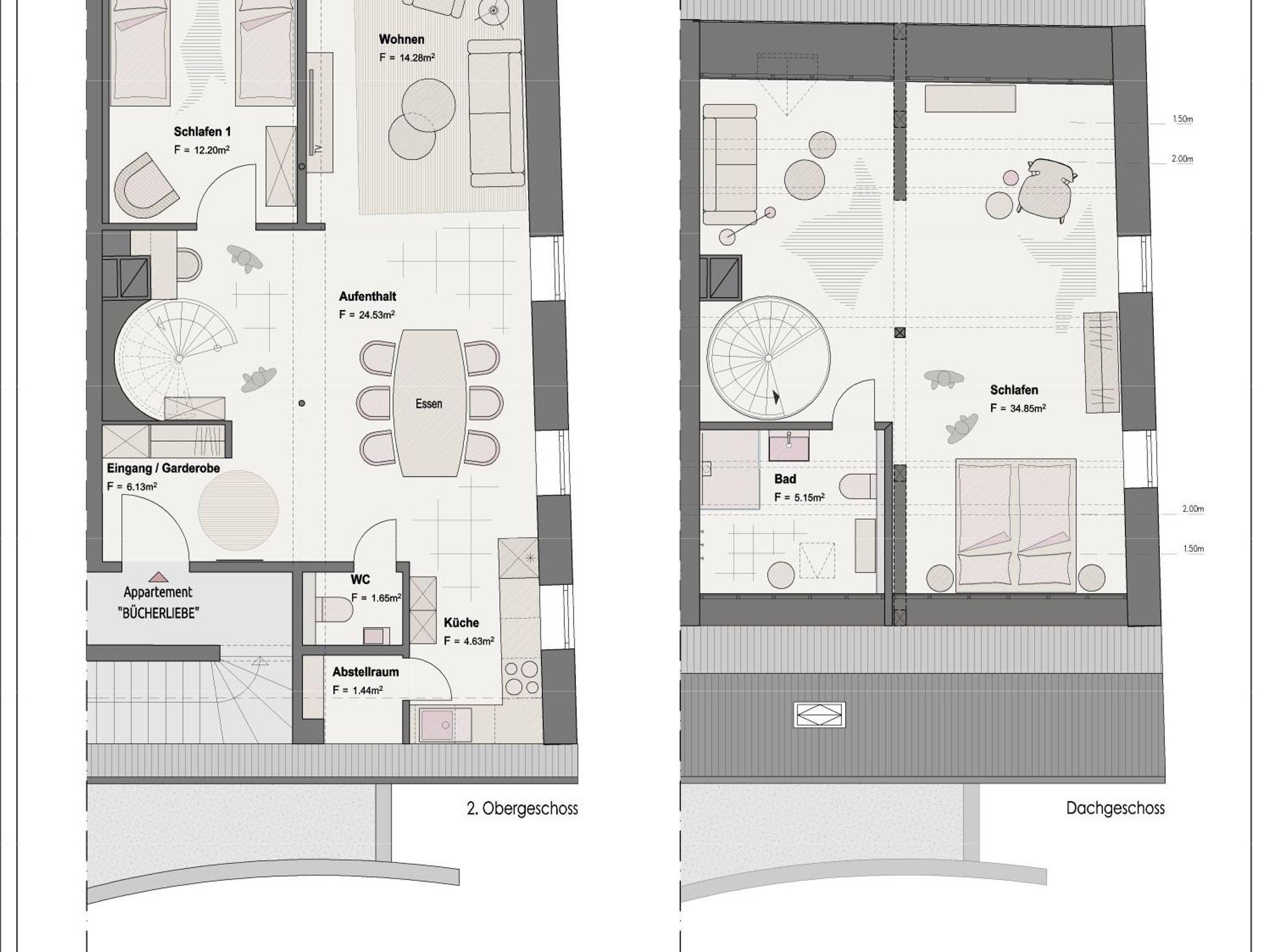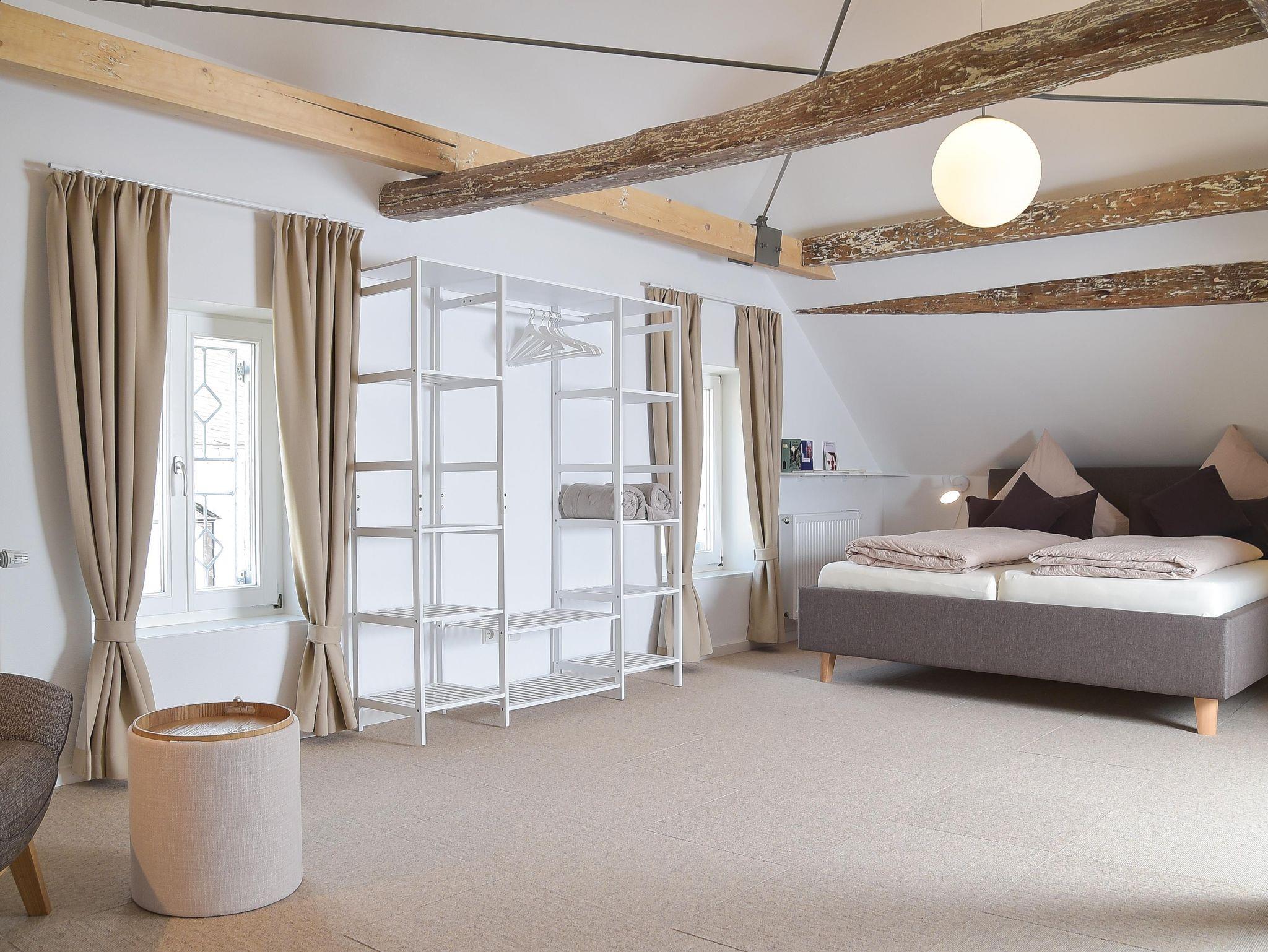 Appartement Bücherliebe ist eine zweigeschossige Maisonettewohnung für 4 Personen in einem denkmalgeschützen Stadthaus. Küche, Essbereich, Wohnzimmmer, Leseecke, Schreibtisch, Gäste WC, kleines Schlafzimmer mit 2 Betten sind unten. Über eine Wendeltreppe erreichen Sie den Schlafbereich mit offenem Sprengwerk. Die alten Balken (obwohl der Raum sehr hoch ist, müssen Sie sich bei einigen Balken leicht bücken) haben wir abgeschliffen. Hier ist ein Doppelbett, Schrank, Sessel und eine Schlafcouch und das Bad. Im Keller sind Waschmaschine und Trockner und ein Fahrradraum. Ausgzeichnet mit 5 Sternen.
