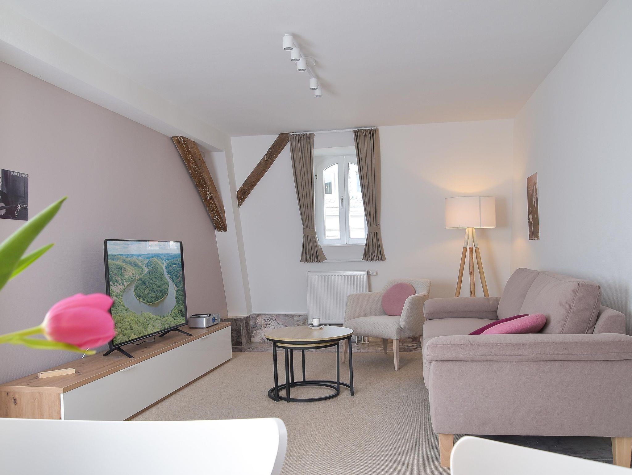 Sie sehen in die Fußgängerzone und haben einen einzigartigen Blick von oben auf die wunderschönen historischen Nachbarhäuser und das Alte Historische Rathaus. Im gleichen Haus finden Sie auch eine mehrfach preisgekrönte Buchhandlung, die zum Stöbern einlädt. Unsere Ferienwohnungen bieten Ihnen den perfekten zentralen und dennoch ruhigen Rückzugsort, um Ihren Urlaub in vollen Zügen zu genießen. Die Merziger Fußgängerzone ist Abends sehr ruhig. Die Stadtfeste oder das Viezfest sind da eine Ausnahme. Hier können Sie sich wohlfühlen und die Seele baumeln lassen.