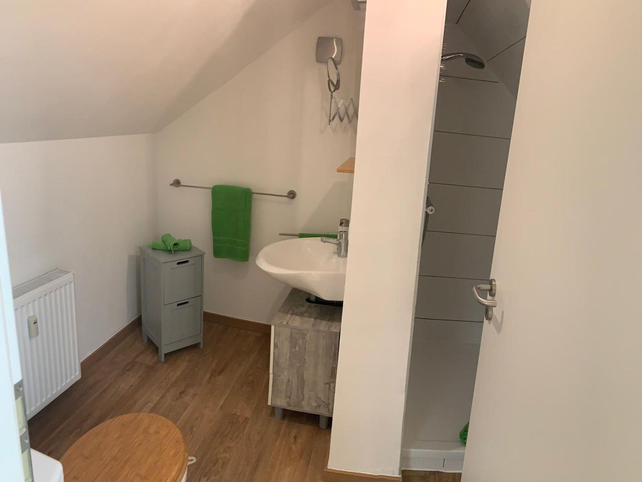 Die Wohnung liegt im Dachgeschoss und ist über ein gemeinsames Treppenhaus erreichbar.