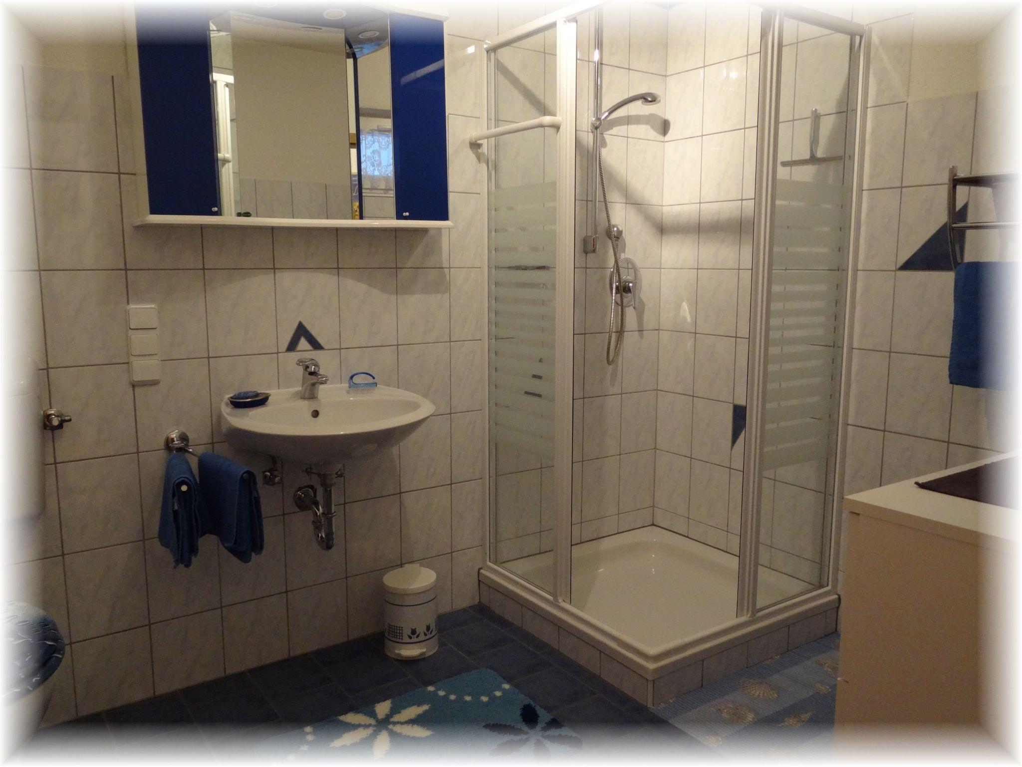 Das Bad ist ausgestattet mit einer Dusche und einem WC, Handtücher und Haarföhn sind vorhanden.