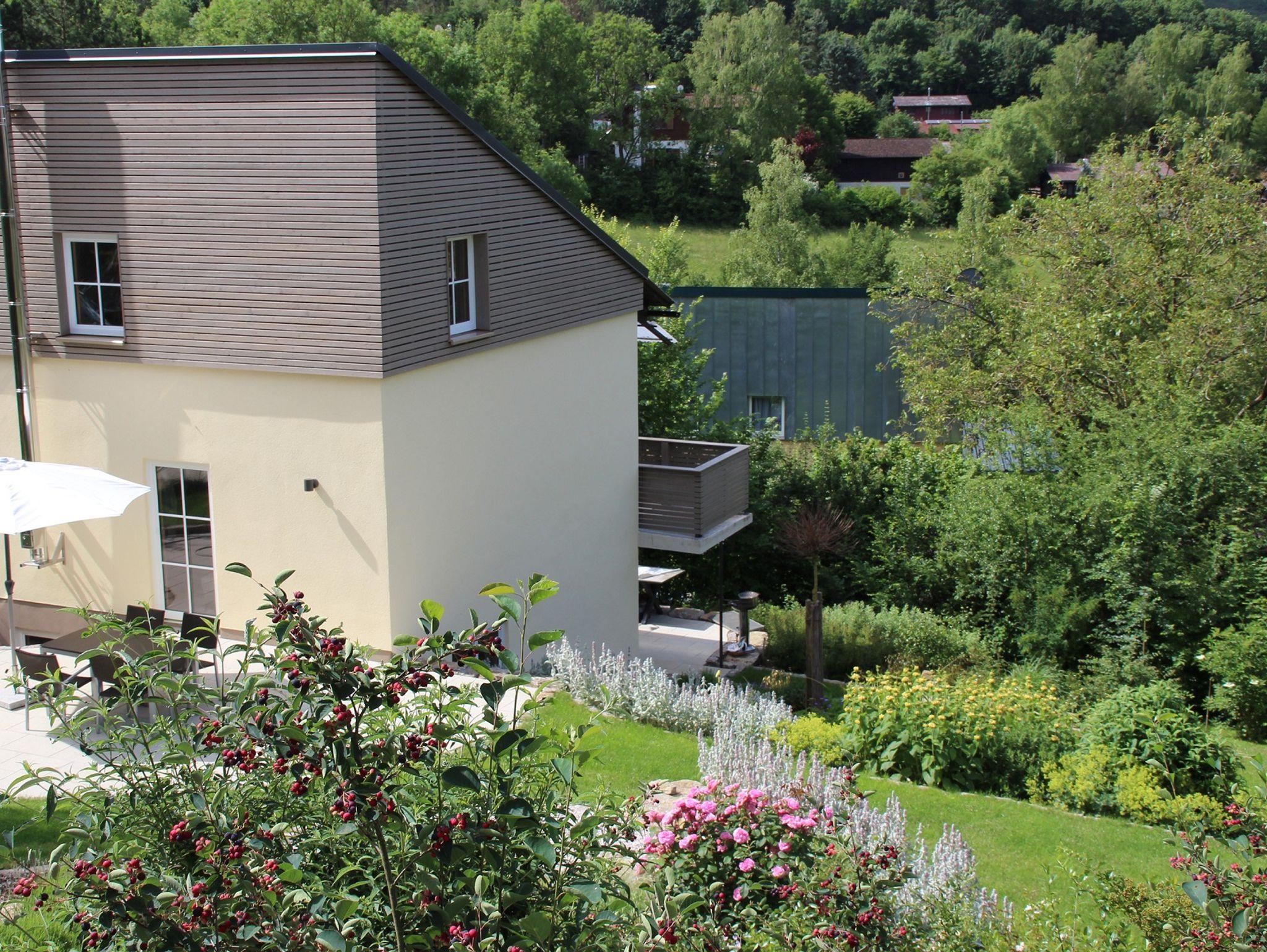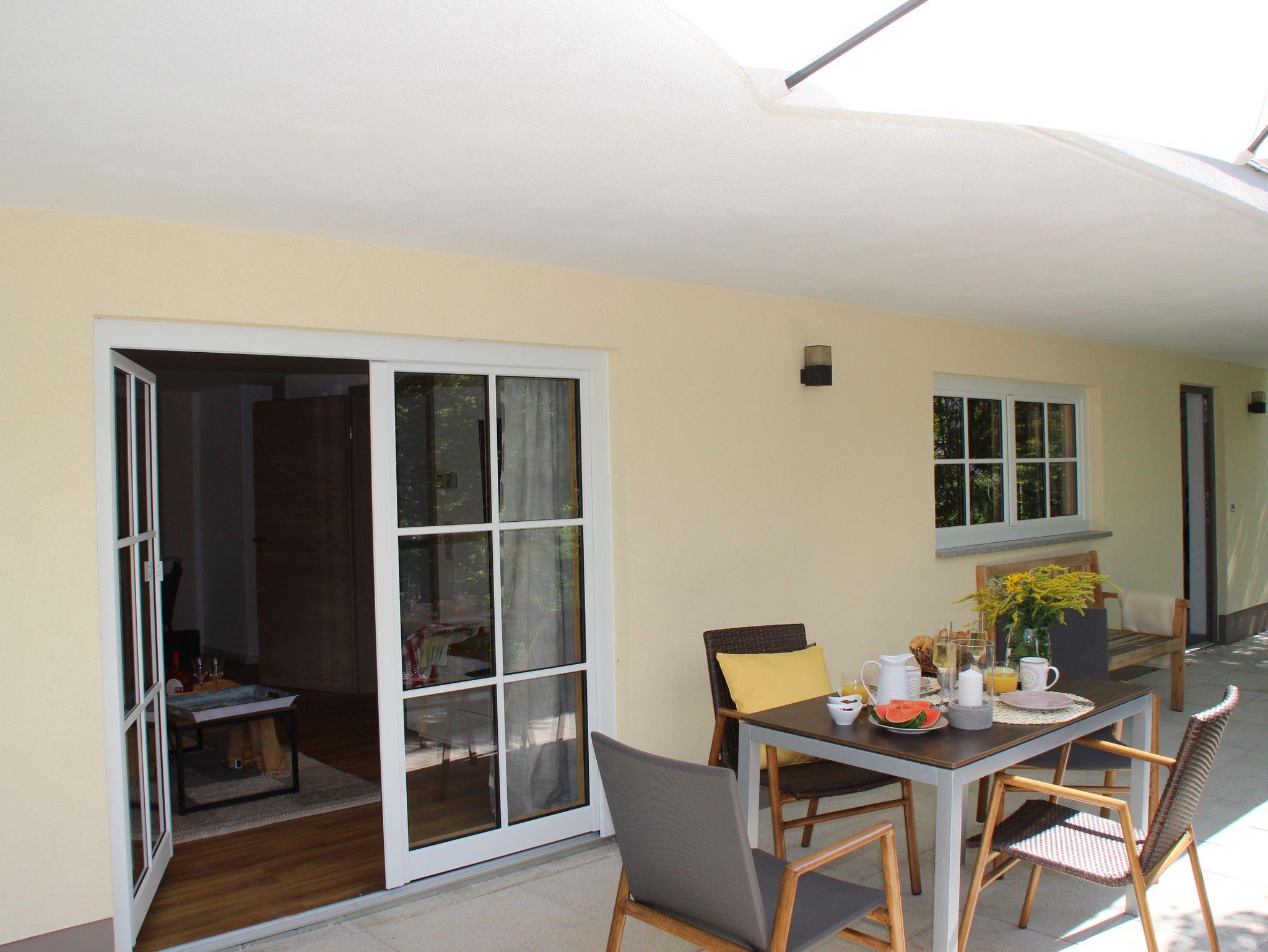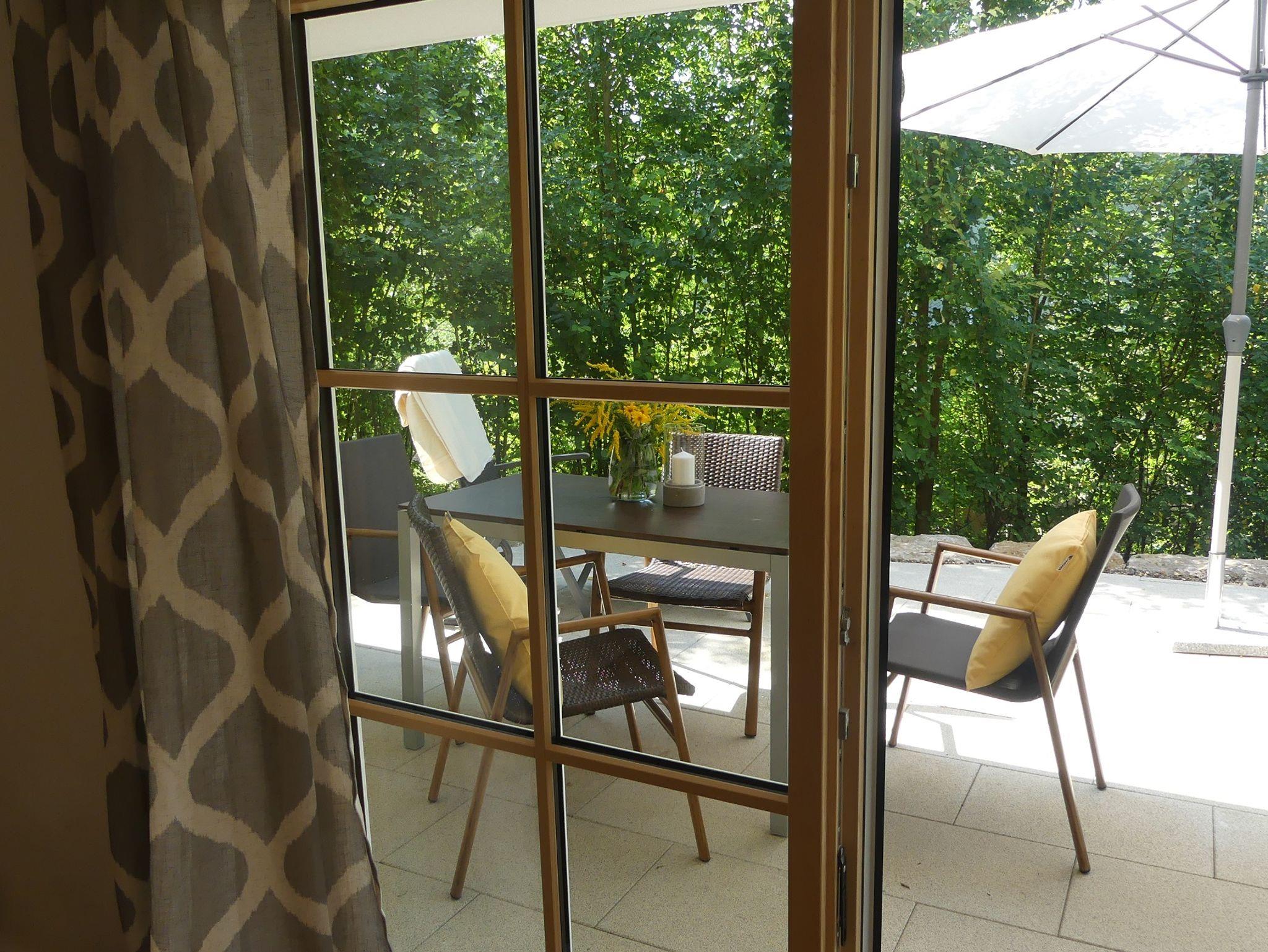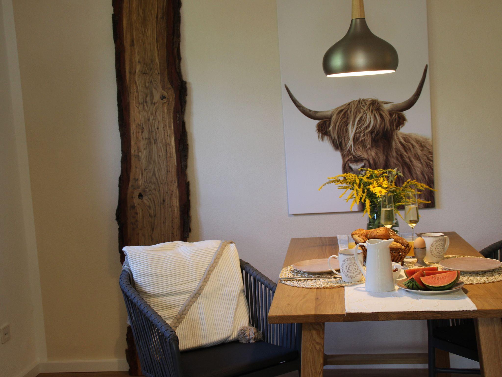 Unsere traumhafte Ferienwohnung „Drei Eichen“ bietet Ihnen auf 55 qm komfortable Räume für eine erholsame Kuschelzeit zu Zweit. Die Wohnung befindet sich im Erdgeschoss und hat einen großzügigen Ess-/Wohnbereich im Naturambiente mit Ledercouch und elektrischer Liegefunktion, einen Echtholz-Esstisch mit gemütlichen Sesseln, SAT-TV, Stereoanlage, CD-Player, Telefon, LAN-Verbindung (auf Wunsch WLAN). Von dort haben Sie einen direkten Zugang zur großen Sonnenterrasse.Eine vollausgestattete Landhausküche mit Spülmaschine, Kühl- und Gefrierschrank, Backofen, Kaffeemaschine, Kaffee- und Teebar, Toaster, Eierkocher und Mixstab lassen keine Wünsche offen. Ein modernes Schlafzimmer mit Boxspringbett, Kuscheldecken, Wärmeflasche und Bio-Dinkelkissen sorgen für einen guten Schlaf. Das Badezimmer mit WC, Dusche, Handtuchtrockner, Föhn, Ganzkörperspiegel und flauschigen Hand- und Badetüchern stehen für Sie bereit.Eine große Außenterrasse mit Sonnenliegen, Bestuhlung, Sonnenschirme und ein wunderschöner Wohlfühl-Naturgarten auf 1100 m², eine offene Feuerstelle, Gartendusche, ein abschließbarer Fahrradraum und ein offenes Carport direkt vor der Tür ergänzen unser Angebot für Ihren Aufenthalt.