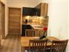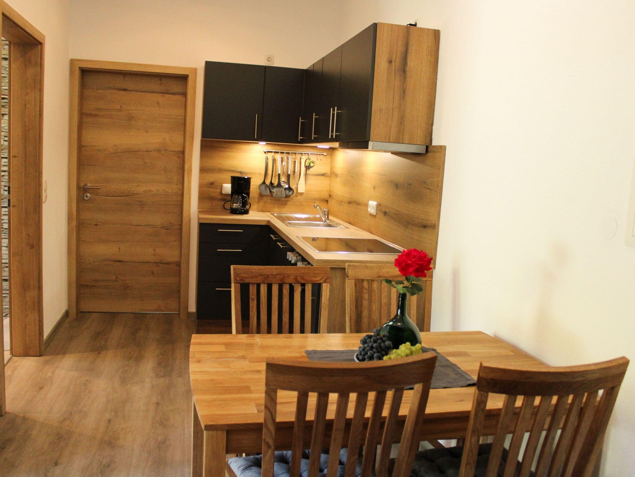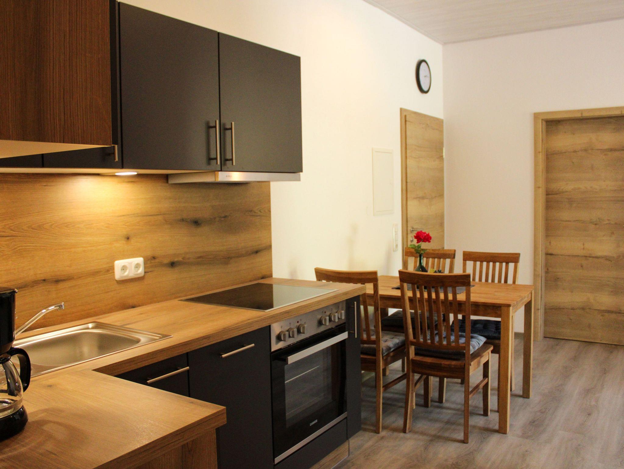 Die Küche ist komplett ausgestattet und verfügt unter anderem über eine Spülmaschine, einem Kühlschrank mit Gefrierfach, eine Kaffeemaschine, Wasserkocher, E-Herd und Backofen.