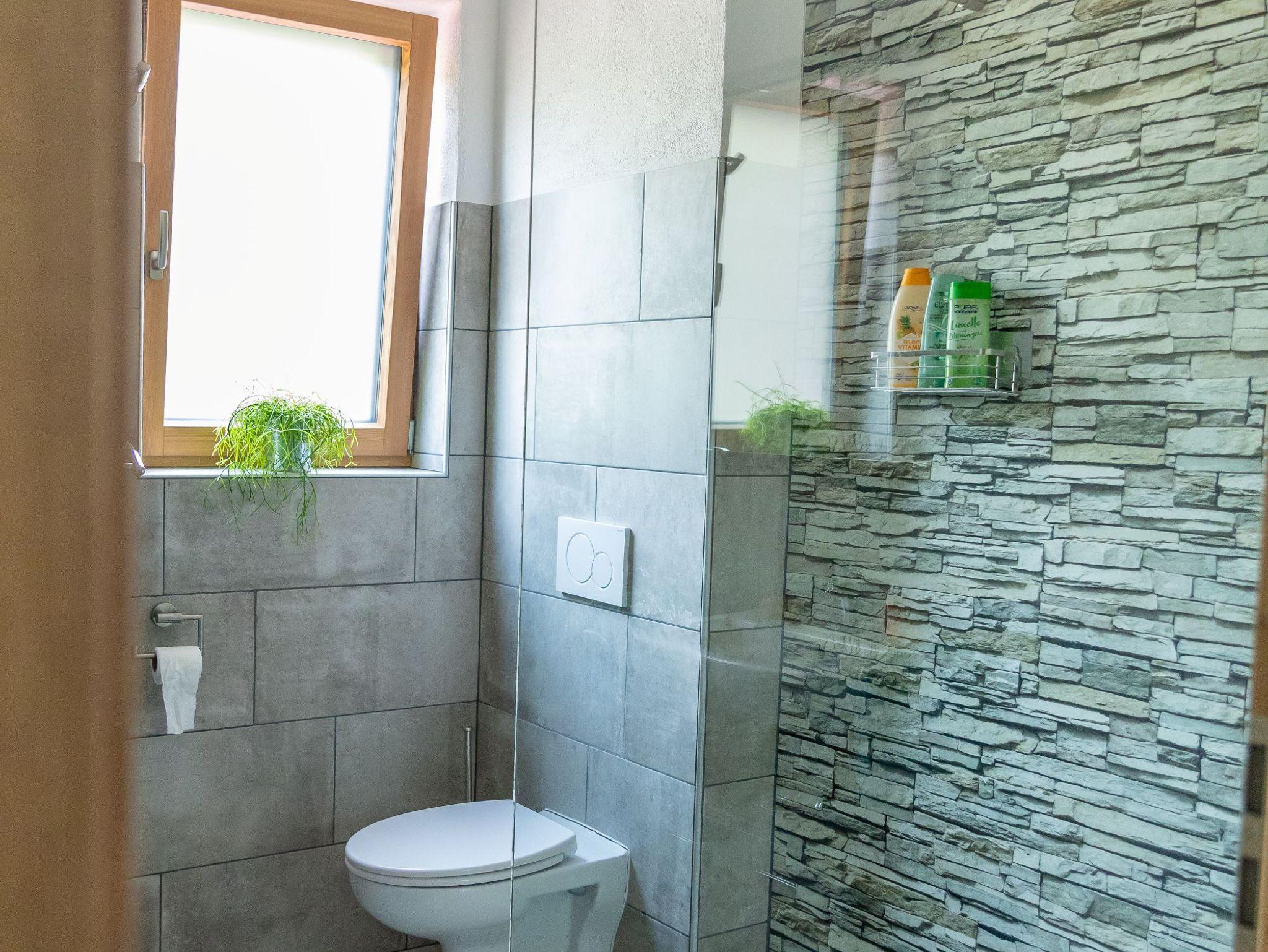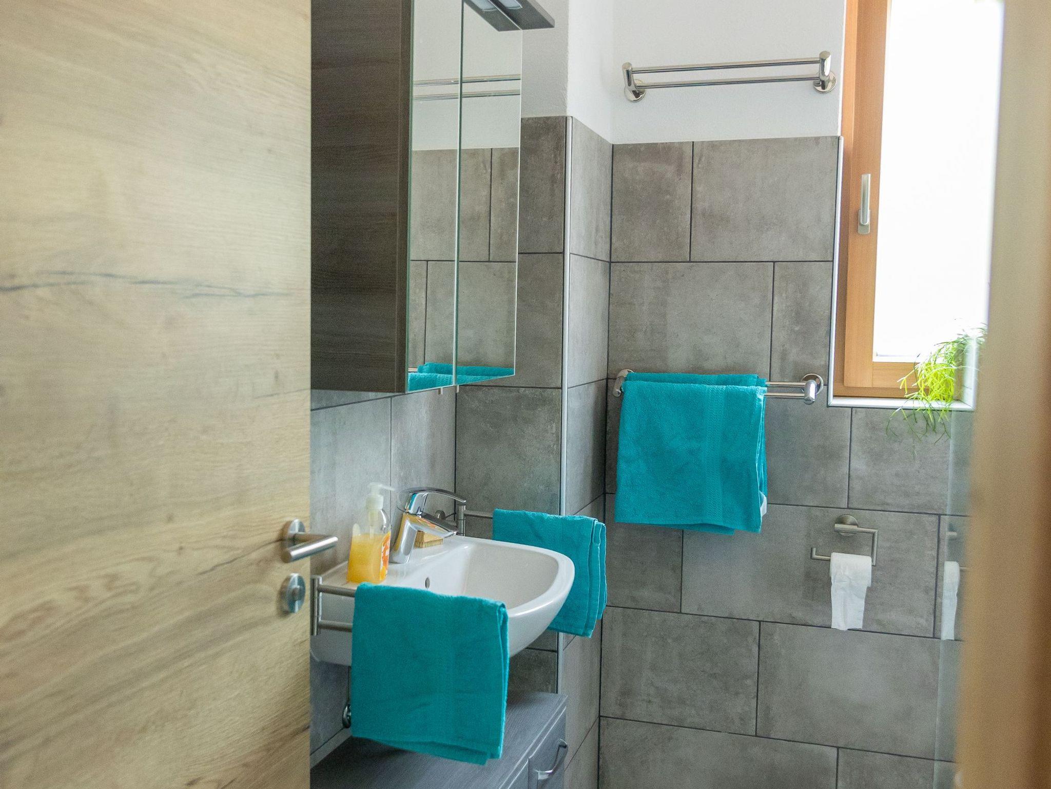 Das Bad ist mit einer begehbaren Dusche und einem WC eingerichtet, Handtücher und Haarföhn sind vorhanden.