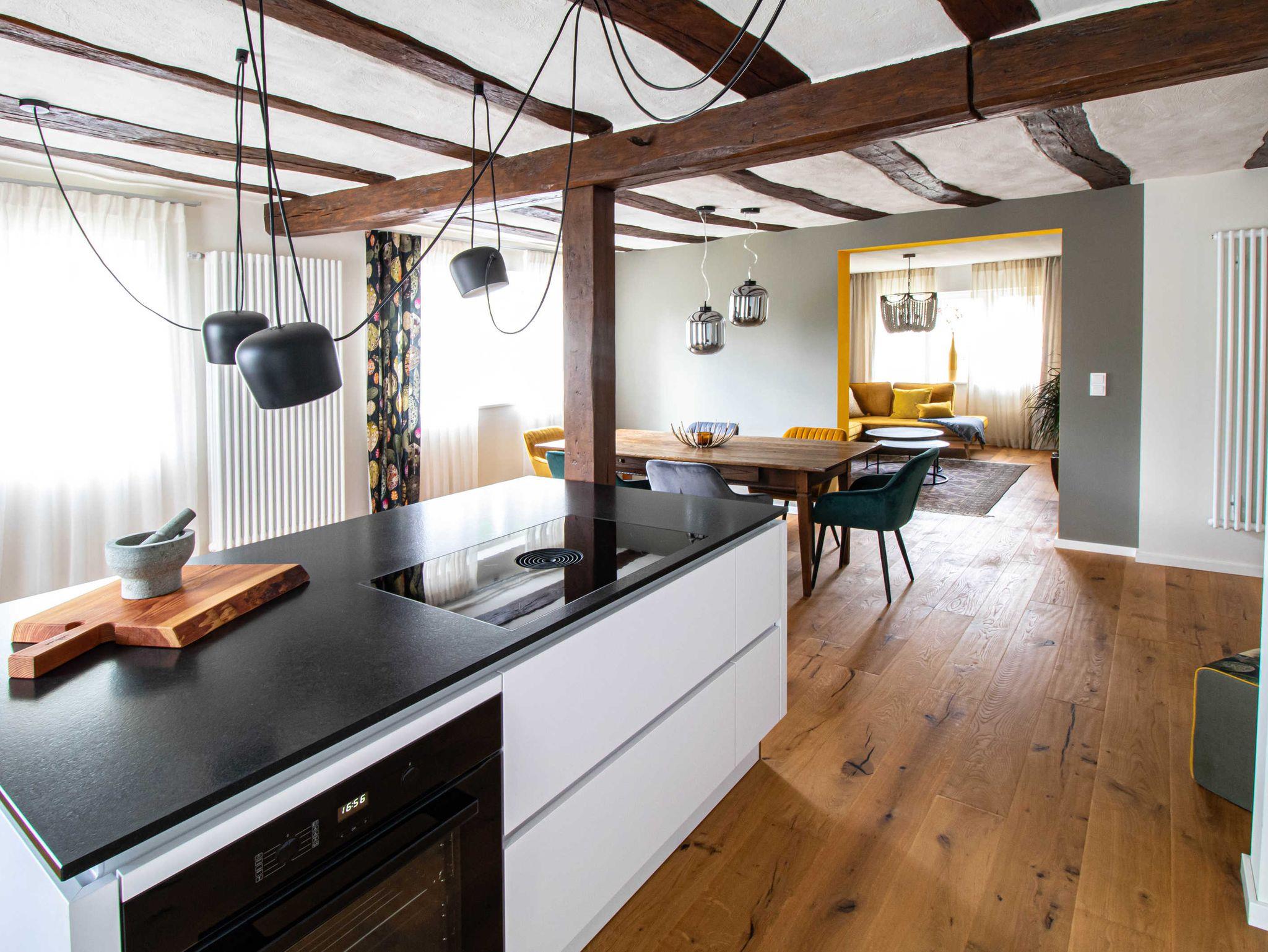 Freie Küche mit großer Kochinsel und Essbereich, Wohnraum und die drei Schlafzimmer mit Flachbild-TV. Besonderes Flair verbreitet der Echtholz-Eichenboden im Haus.