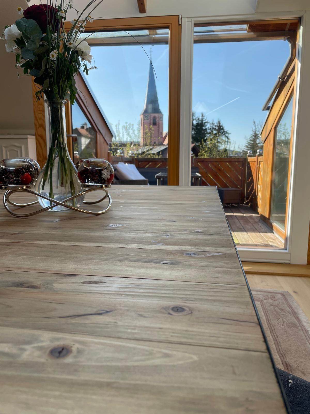 Ein Balkon mit Sitzmöglichkeiten bietet Blick auf die Michelstädter Stadtkirche.
