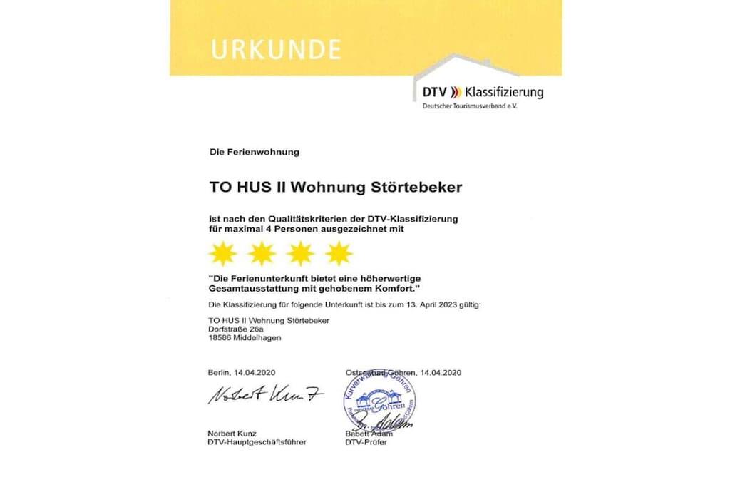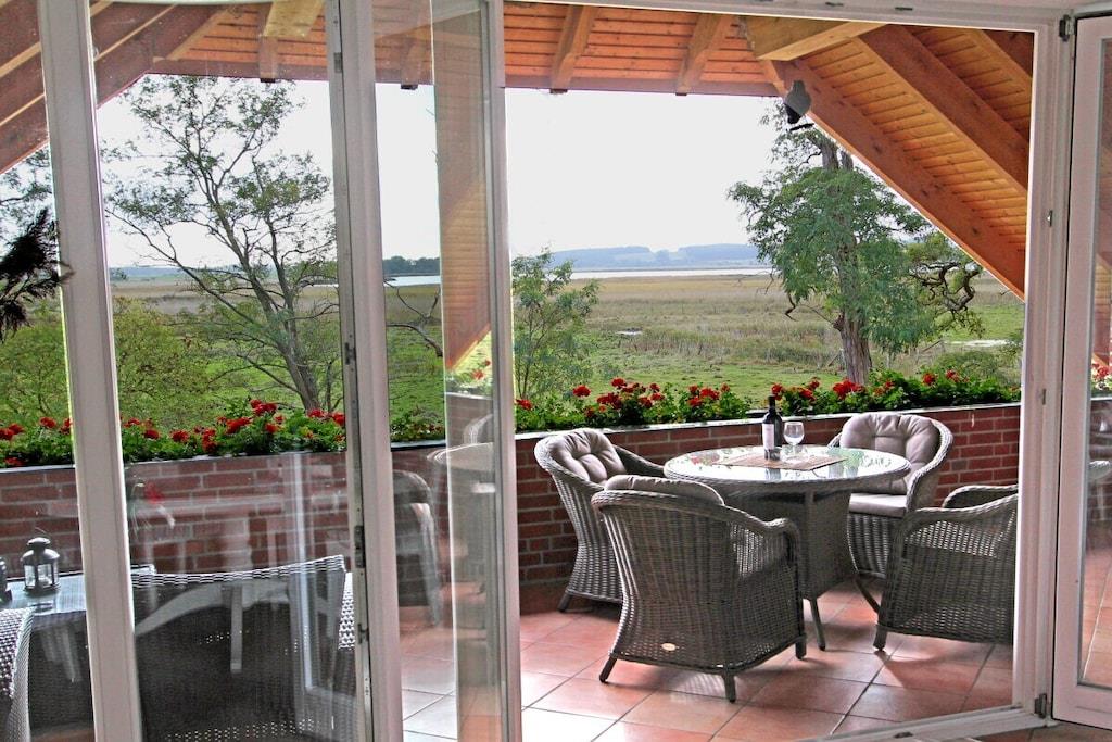 Willkommen in unserer exklusiven Ferienwohnung im Dachgeschoss im Landhaus "To Hus II". Die gehobene Ausstattung ist auf max. 6 Personen (4 Erw. + 2 Kleinkinder) abgestimmt. Das großzügige Wohnzimmer mit einer Panoramafensterfront und Kamin lädt zum Verweilen ein. Lassen Sie sich von dem wundervollen Blick auf die idyllische Boddenlandschaft verzaubern. Direkt an das Wohnzimmer grenzt die überdachte und sonnige Südveranda (20 m²) mit bequemer Sitzgruppe. Zur Ferienwohnung gehören 2 getrennte Schlafzimmer. Neben dem modernen Duschbad gibt es noch ein zweites romantisches Bad mit einer großzügigen Badewanne. Die hochwertige Küche grenzt an den Wohnbereich und bietet viel Platz zum Essen oder für einen geselligen Spielabend.
