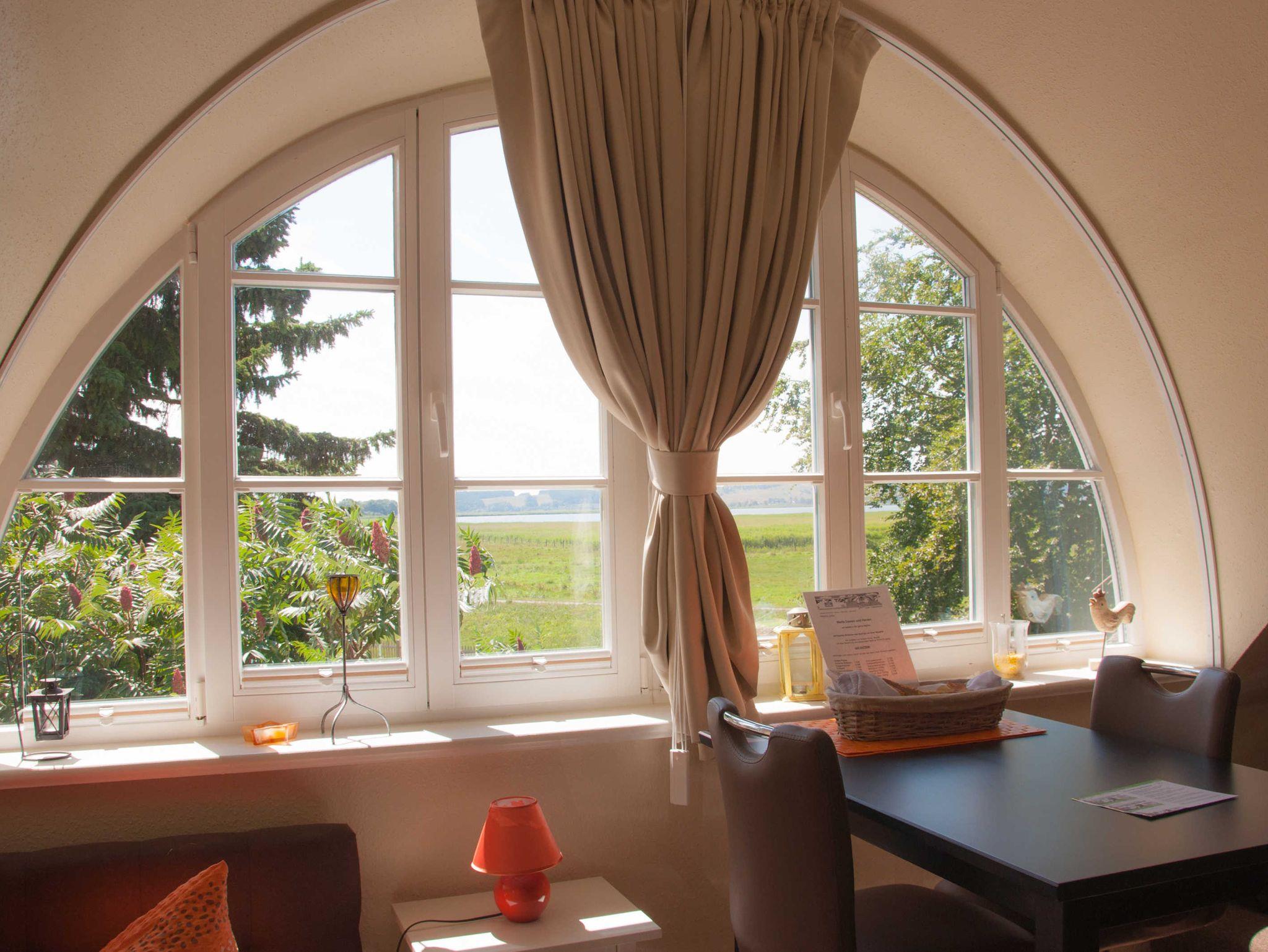 Das durchdachte Farbkonzept mit warmen Farben und aufeinander abgestimmten Möbeln verleiht der Wohnung ihren besonderen Charme. Relaxen Sie auf der riesigen Sofaecke beim Lesen, Fernsehen oder vor dem Kamin oder genießen Sie schon zum Frühstück den herrlichem Blick aus dem großen Panoramafenster auf die Hagensche Wiek.