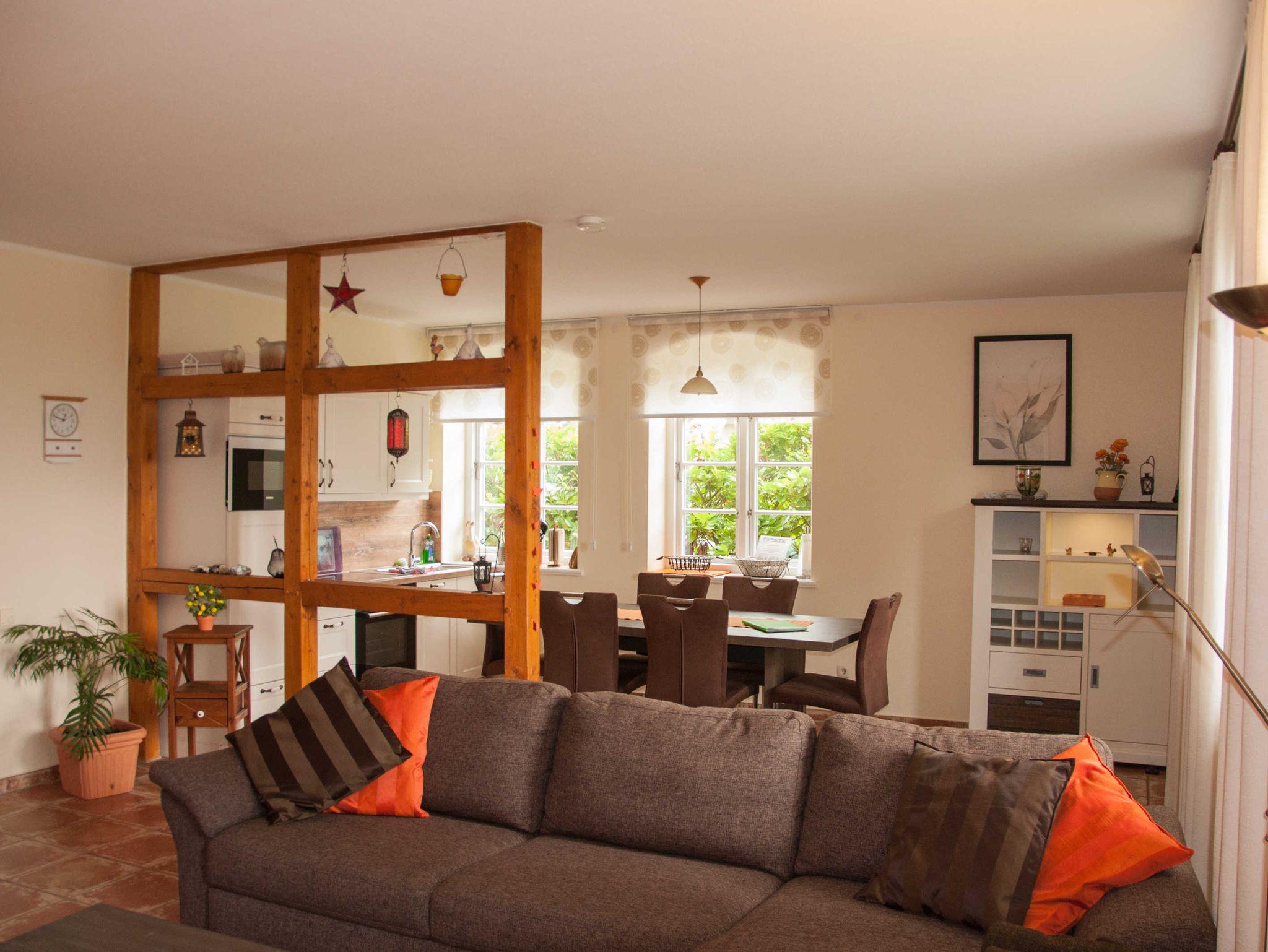 Das durchdachte Farbkonzept mit warmen Farben und aufeinander abgestimmten Möbeln verleiht der Wohnung ihren besonderen Charme. Im kombinierten Wohn- und Essbereich können Sie es sich auf der riesigen Sofalandschaft beim Lesen, Fernsehen oder vor dem Kamin bequem machen oder in der vollwertig ausgestatteten Küche mit hochwertigen Markengeräten von Siemens Ihrer Kochfreude freien Lauf lassen. Der große Holztisch mit bequemen Schwingstühlen lässt Sie beim gemeinsamen Essen den Alltagsstress schnell vergessen. Ein großzügiges Badezimmer mit Badewanne und Dusche lässt keine Wünsche offen. Die Fußbodenheizung in der gesamten Wohnung sorgt für angenehme Wärme zu jeder Jahreszeit. Genießen Sie die zur Wohnung gehörende nach Süden ausgerichtete Terrasse mit Blick in den Garten, auf den Bodden sowie die Zickerschen Alpen. Zur Wohnung gehört ein kostenfreier Pkw-Stellplatz direkt am Haus. Ihre Fahrräder können Sie in unserem Fahrradcarport trocken unterbringen. Internet über WLAN steht Ihnen kostenfrei zur Verfügung.