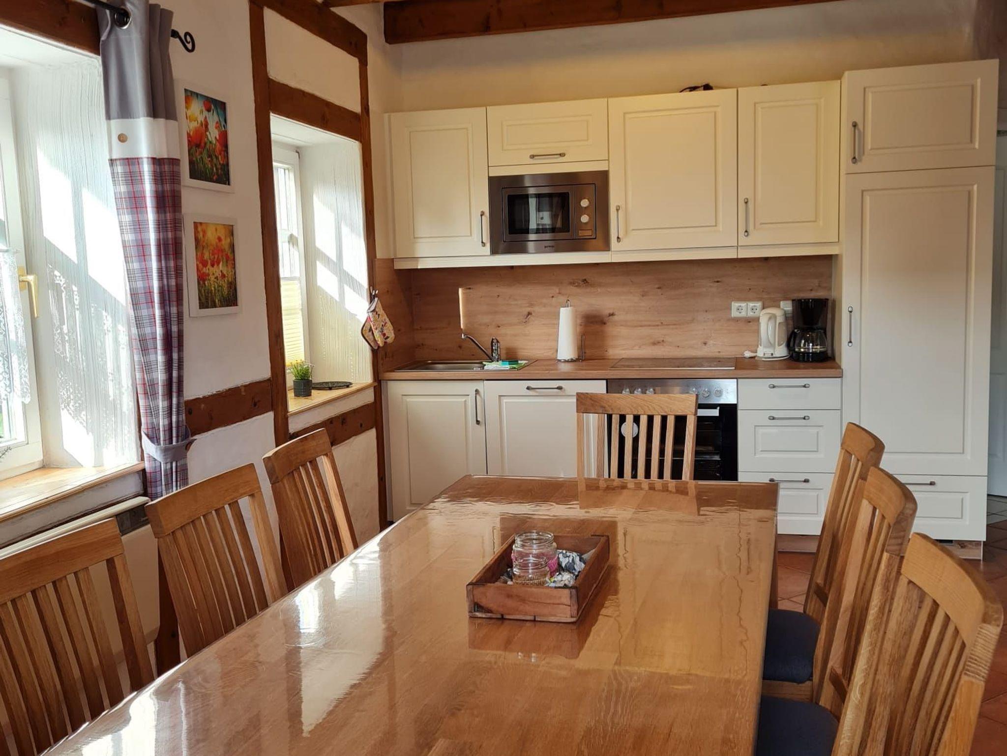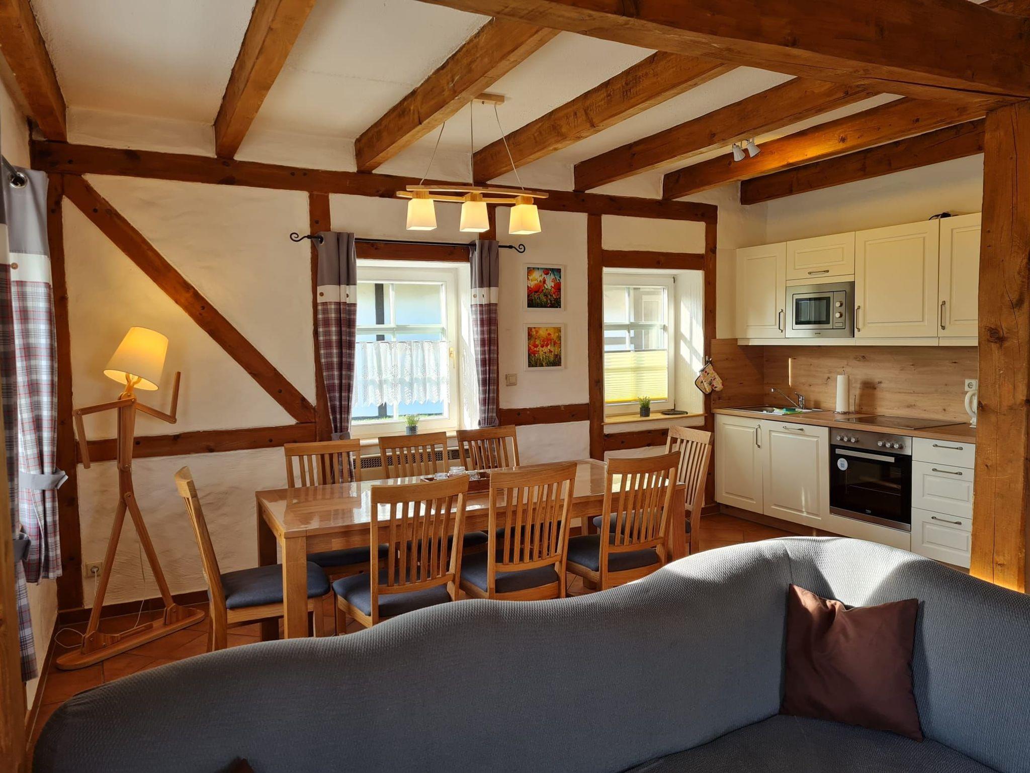 In einer original rekonstruierten Fachwerkscheune aus dem Jahre 1781 bieten wir Ihnen Platz für 2 bis 6 Personen in 6 Ferienwohnungen, jeweils über 2 Etagen. Hinter dem Haus befinden sich die Terrassen zu den Wohnungen mit Blick ins Grüne und in einen Naturgarten der zum Verweilen und Spielen einlädt. Parkplätze sind am Haus vorhanden.
