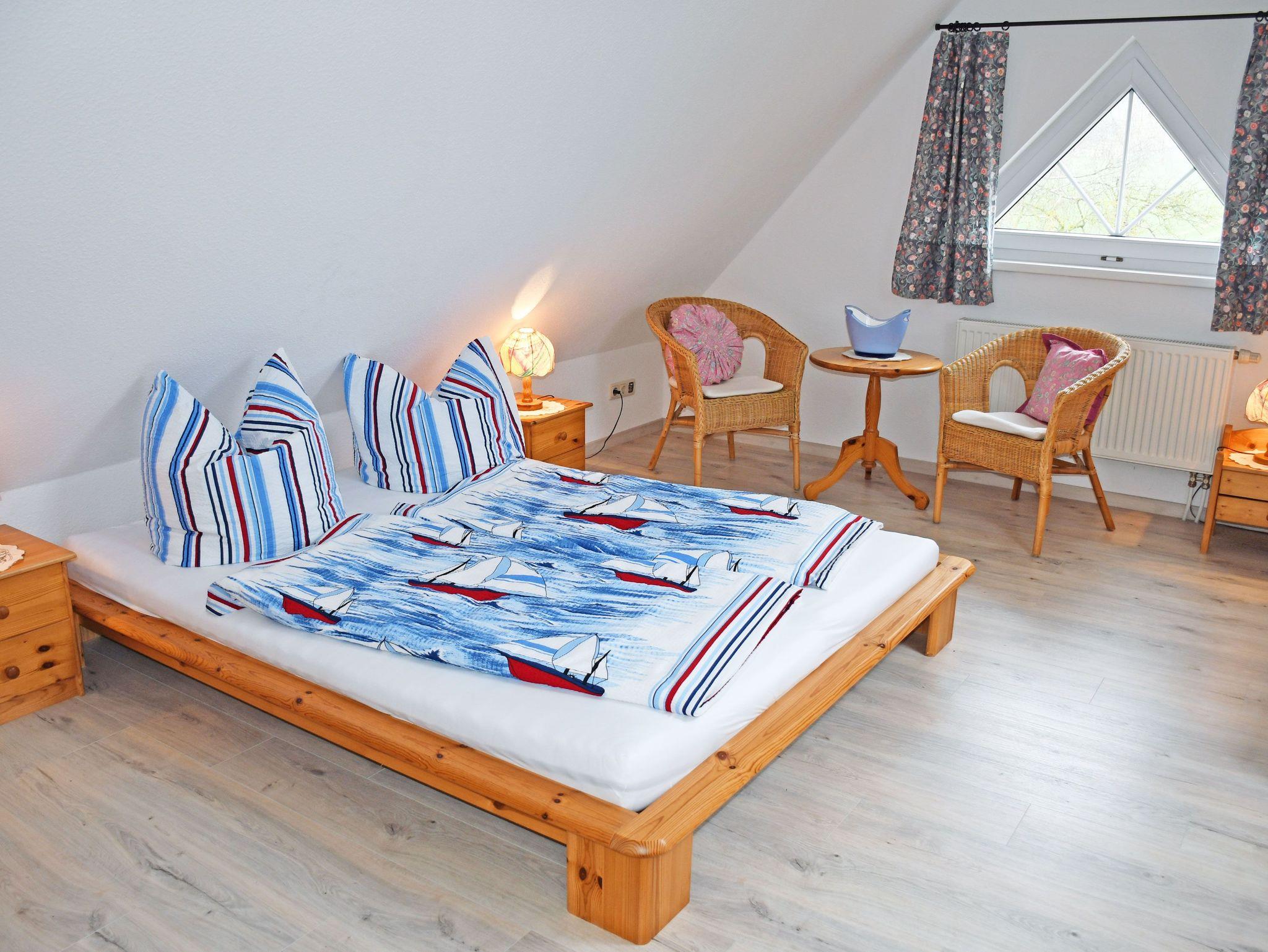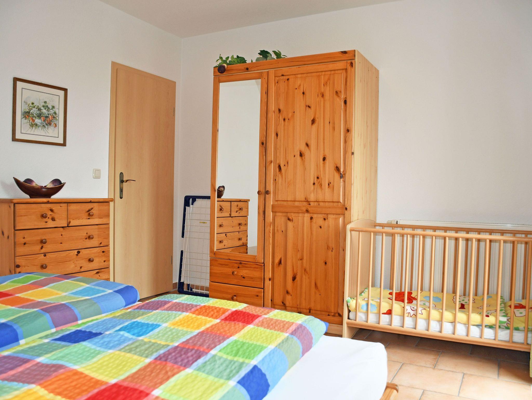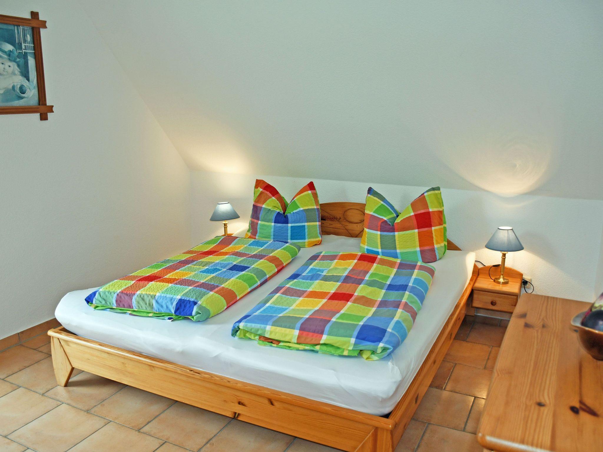 Das erste Schlafzimmer ist mit einem bequemen Doppelbett, Nachttischen und Leselampen sowie einem Kleiderschrank ausgestattet. Im zweiten Schlafzimmer, das über eine Holzstufentreppe im Dachgeschoss erreichbarbar ist, stehen ebenfalls ein bequemes Doppelbett, Nachttische und Leselampen, eine offene Garderobe sowie ein Einzelbett. Zum Wohnzimmer nach unten gibt es keine Tür. Ein Holzkinderbett für ein Kind bis drei Jahren ist ebefalls vorhanden.