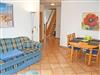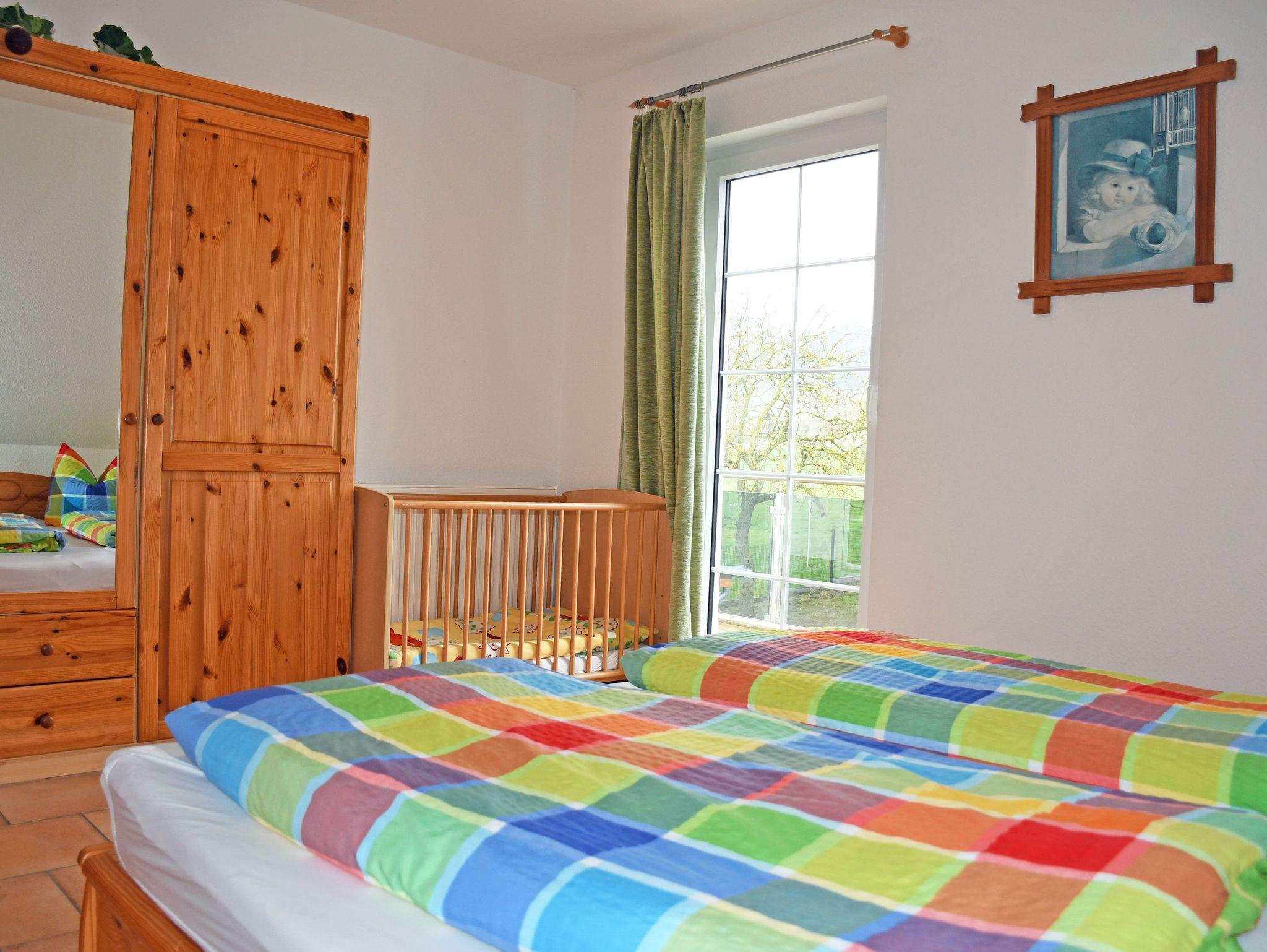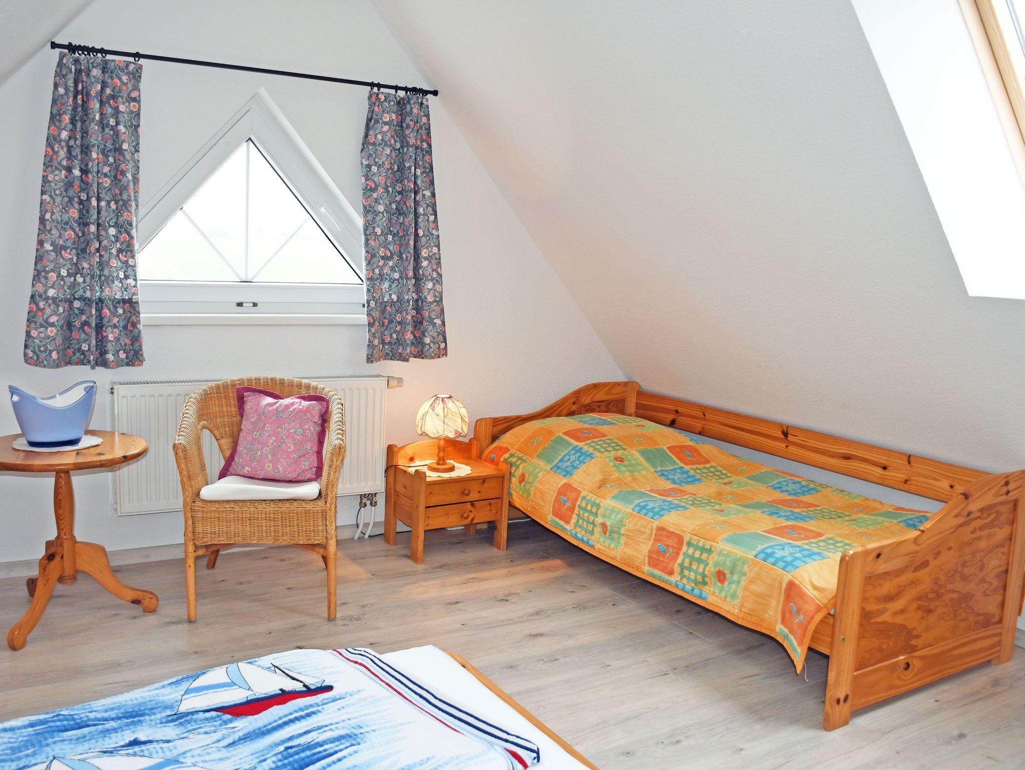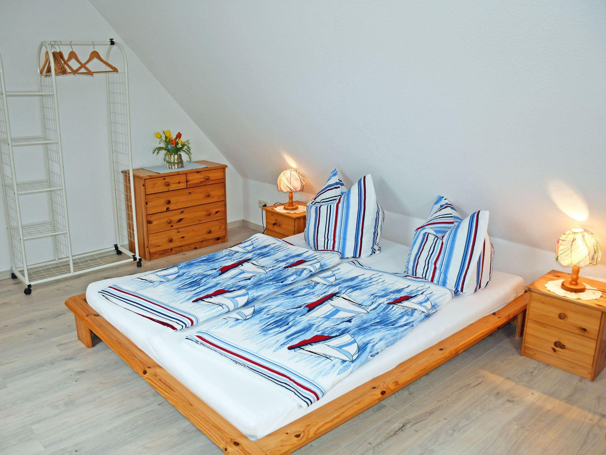 Das erste Schlafzimmer ist mit einem bequemen Doppelbett, Nachttischen und Leselampen sowie einem Kleiderschrank ausgestattet. Im zweiten Schlafzimmer, das über eine Holzstufentreppe im Dachgeschoss erreichbarbar ist, stehen ebenfalls ein bequemes Doppelbett, Nachttische und Leselampen, eine offene Garderobe sowie ein Einzelbett. Zum Wohnzimmer nach unten gibt es keine Tür. Ein Holzkinderbett für ein Kind bis drei Jahren ist ebefalls vorhanden.