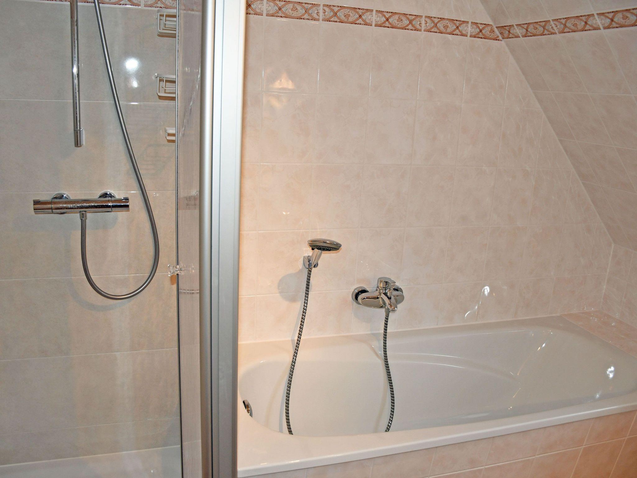 Auf Wunsch sind gegen Aufpreis bei Ihrer Anreise die Betten mir Bettwäsche bezogen und es liegen frische Handtücher bereit, bitte dann mitbuchen! Das moderne und helle Bad ist mit Dusche, Badewanne, WC, Fön und Waschtisch ausgestattet und verfügt über Tageslicht.