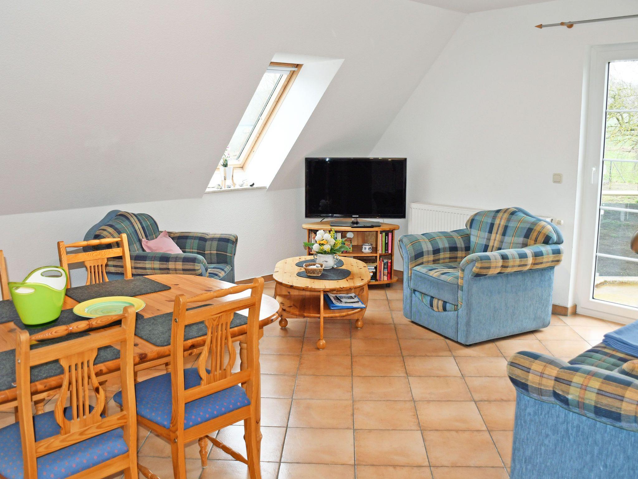Die Ferienwohnung Hiddensee liegt im Ober- und Dachgeschoss des Appartementhauses und verfügt über einen separaten Eingang. Es ist ca. 60 qm groß, hat Platz für maximal 2 Erwachsene und 2 Kinder bis 14 Jahre. Sie wurde modern sowie liebevoll eingerichtet und bietet ein WLAN-Internetzugang. Im Wohnraum befinden sich eine bequeme Sitzcouch mit Tisch und ein modernes Flachbild-TV-Gerät und Radio. Hier steht auch ein Esstisch mit Stühlen. Auf dem Balkon mit Gartenmöbeln können Sie die Sonne genießen oder bei einem Gläschen Wein entspannen. Von hier aus haben Sie einen sehr schönen Blick auf den Schafberg und den hauseigenen Hühnerhof. Die moderne Küchenzeile ist mit einem Cerankochfeld, Abzugshaube, Backofen, Geschirrspüler, Wasserkocher, Kaffeemaschine, Toaster und Kühlschrank komplett ausgestattet.