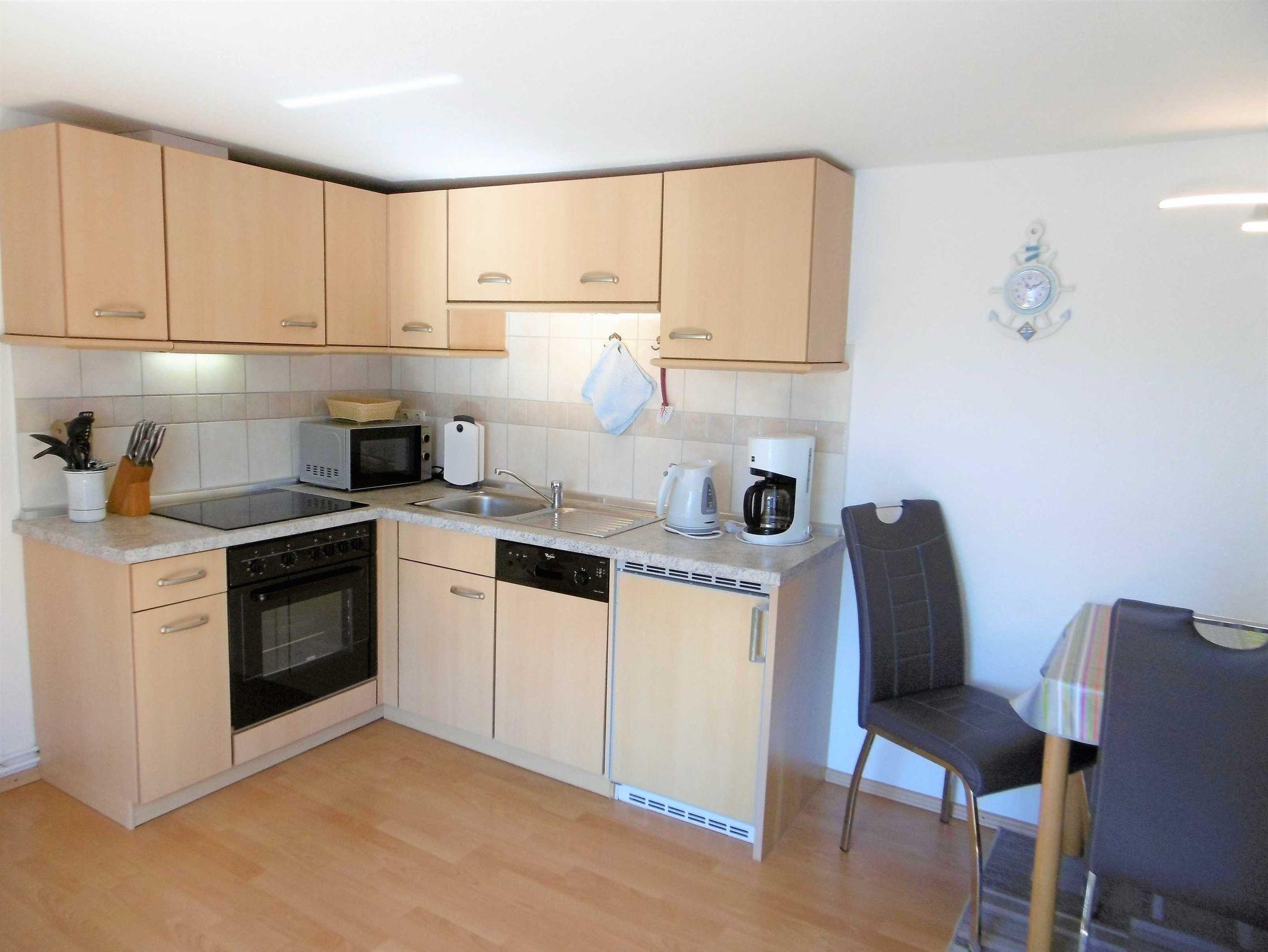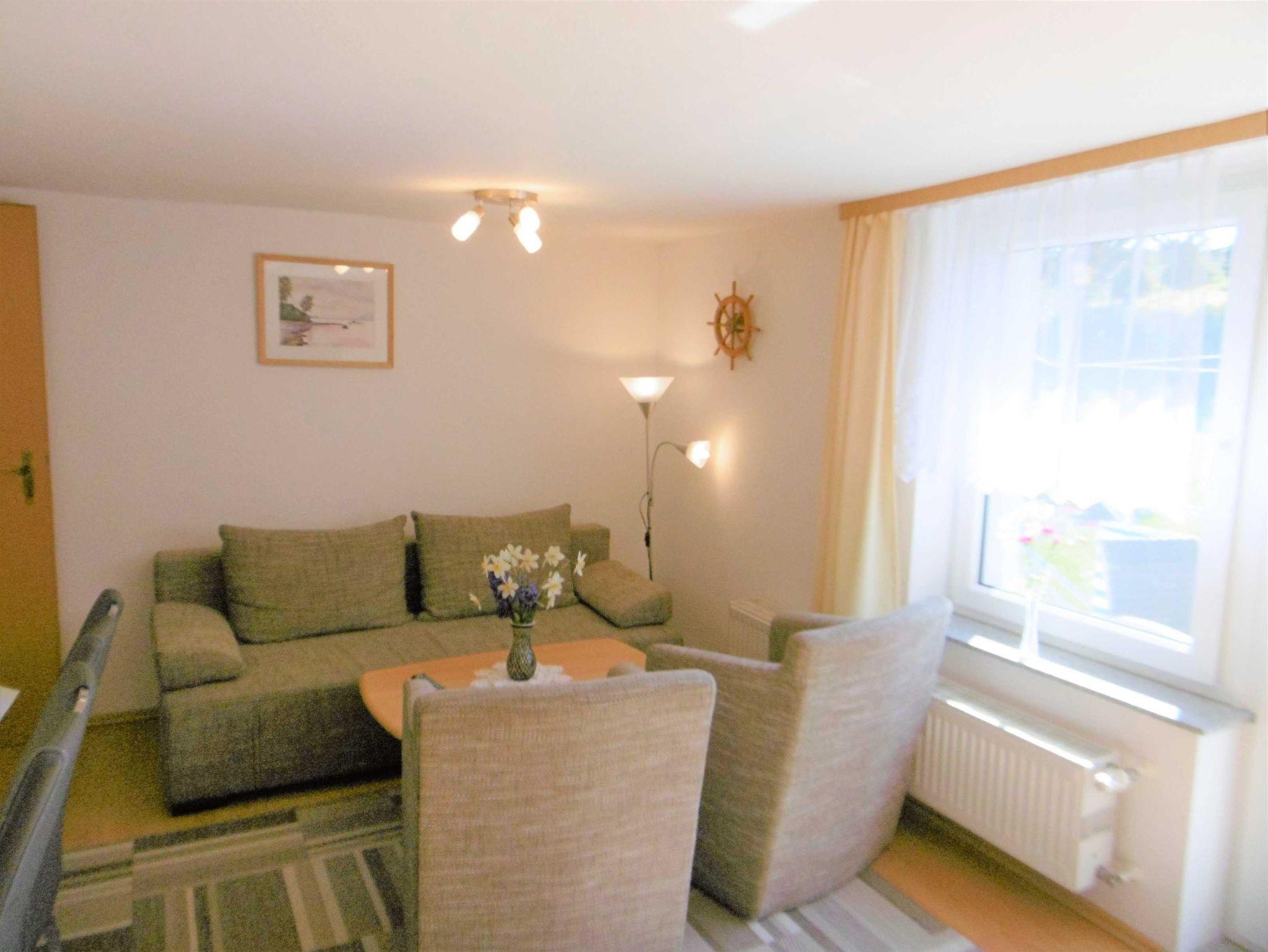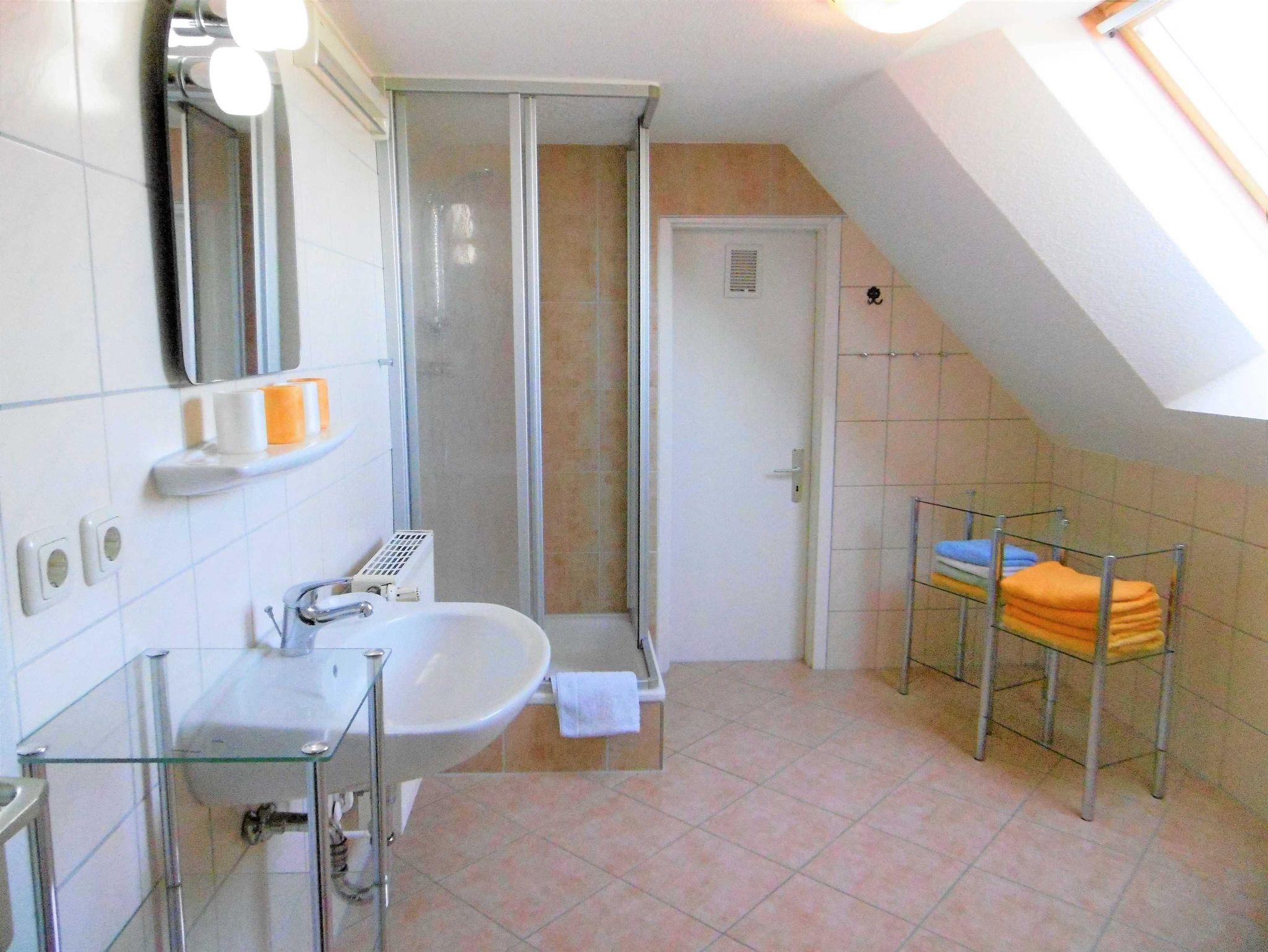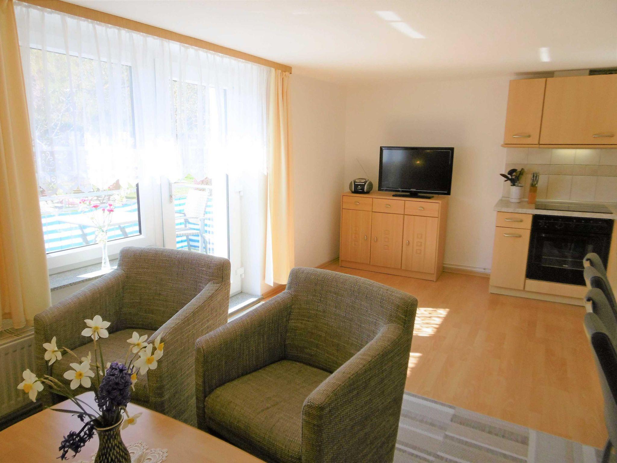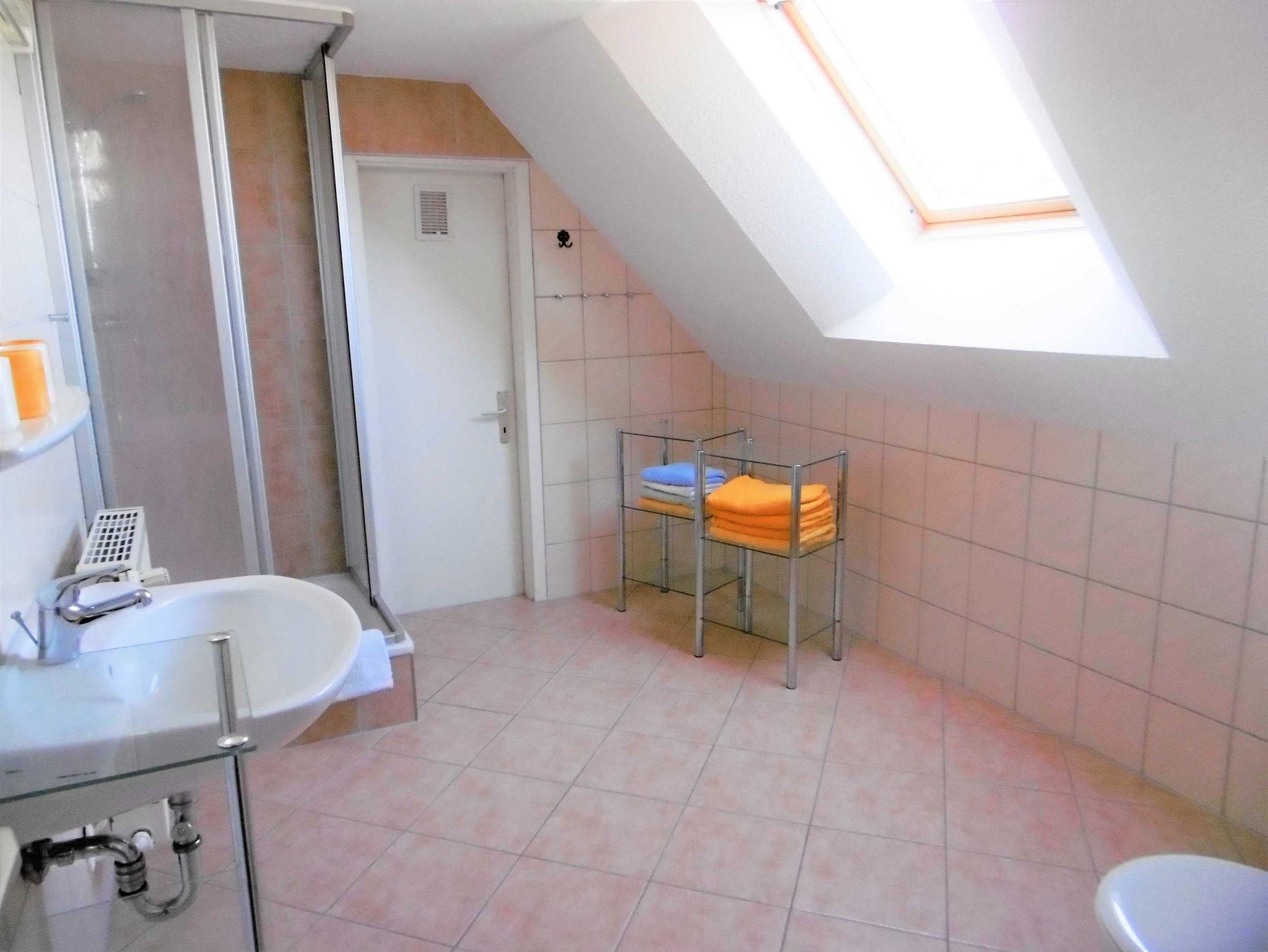Die Fewo OG (80m²) verfügt über ein Wohnzimmer mit Küchenzeile, Esstisch, Sitzgruppe (TV), zwei separaten Schlafzimmern eines mit einem Doppelbett und einem Einzelbett und eines mit Doppelbett, sowie dem Duschbad und einem Balkon mit einer Treppe in den Garten.