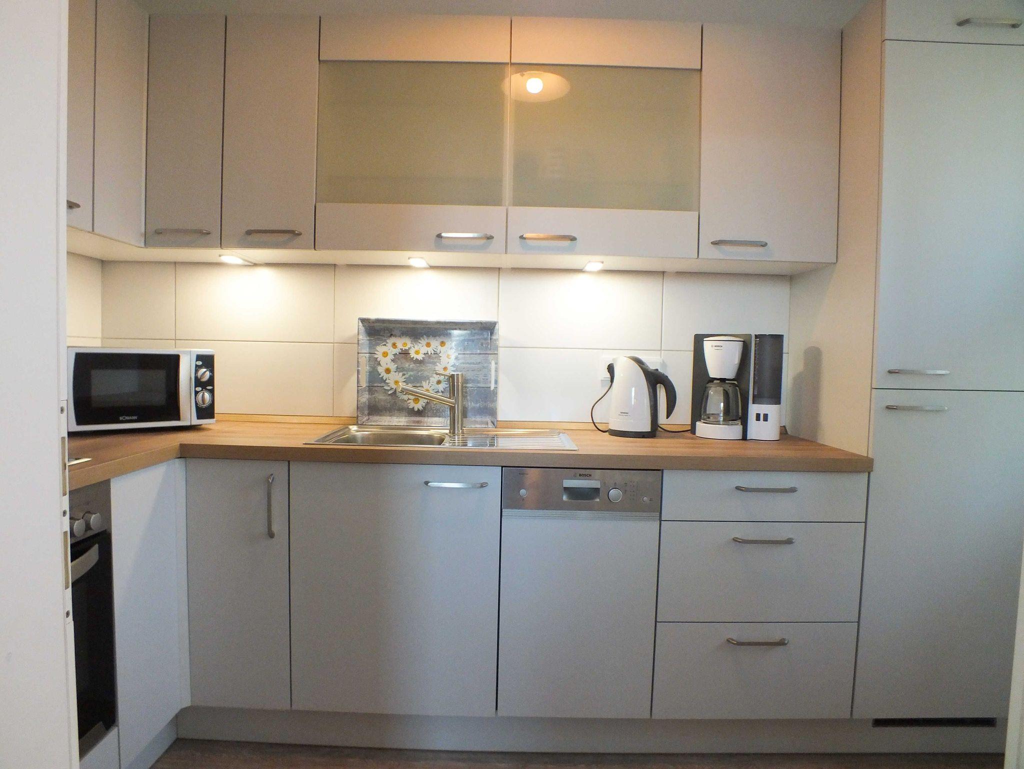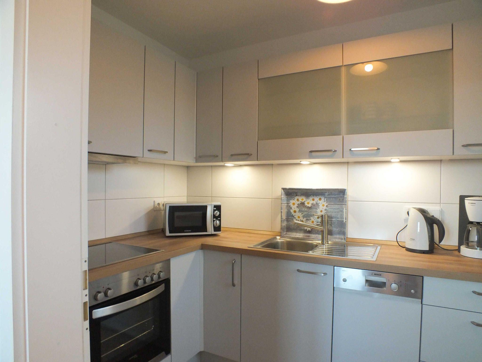 Für Freunde der kulinarischen Unabhängigkeit steht die voll ausgestattete Küche mit Geschirrspüler zur Verfügung. Neben einem Kühlschrank und einem Gefrierschrank, einem Backofen, Mikrowelle und E-Herd (Ceranfeld), stehen Ihnen auch ein Wasserkocher, eine Kaffeemaschine und ein Toaster bereit. Das hell erleuchtete Tageslicht-Badezimmer mit ebenerdiger Dusche verfügt über ein WC und einen Waschtisch mit großem Spiegel. Die dort vorhandene Waschmaschine wird Ihnen kostenfrei zur Verfügung gestellt. Alle vorhandenen Räume, bis auf die Küche, sind zur Unterstützung der Privatsphäre mit blickdichten Plissees ausgestattet.
