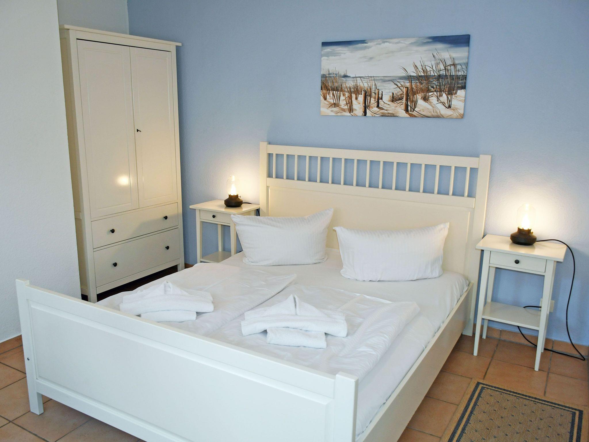 - Schlafzimmer mit bequemen Doppelbett, Nachttischen und Leselampen, Kleiderschrank
