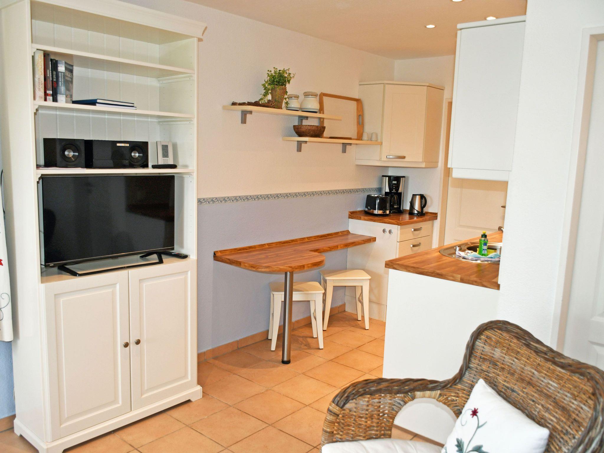 - Küchenzeile mit Ceranfeldherd, Backofen, Abzugshaube, Wasserkocher, Geschirrspüler, Kaffeemaschine, Toaster, Kühlschrank mit Gefrierfach
