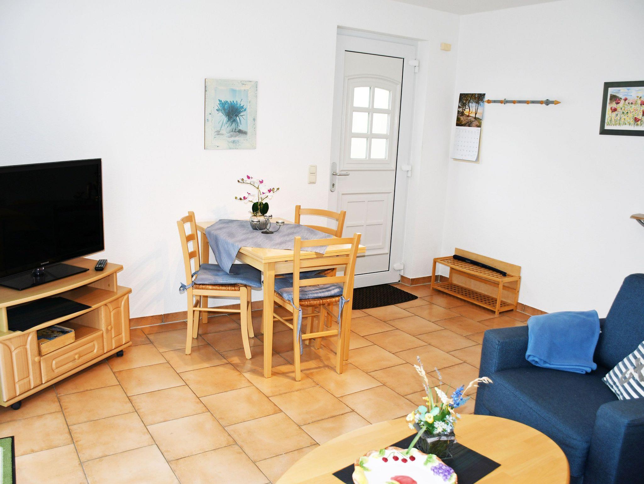 Die Ferienwohnungen Vilm und Ruden liegen im Erdgeschoss des Appartementhauses und verfügen über einen separaten Eingang. Sie sind ca. 35 qm groß, haben Platz für maximal 2 Erwachsene und ein Kind bis 3 Jahre im Kinderreisebett. Sie wurden modern sowie liebevoll eingerichtet und bietet ein WLAN-Internetzugang. Im Wohnraum befinden sich eine bequeme Sitzcouch mit Tisch und ein modernes Flachbild-TV-Gerät und Radio. Hier steht auch ein Esstisch mit Stühlen.