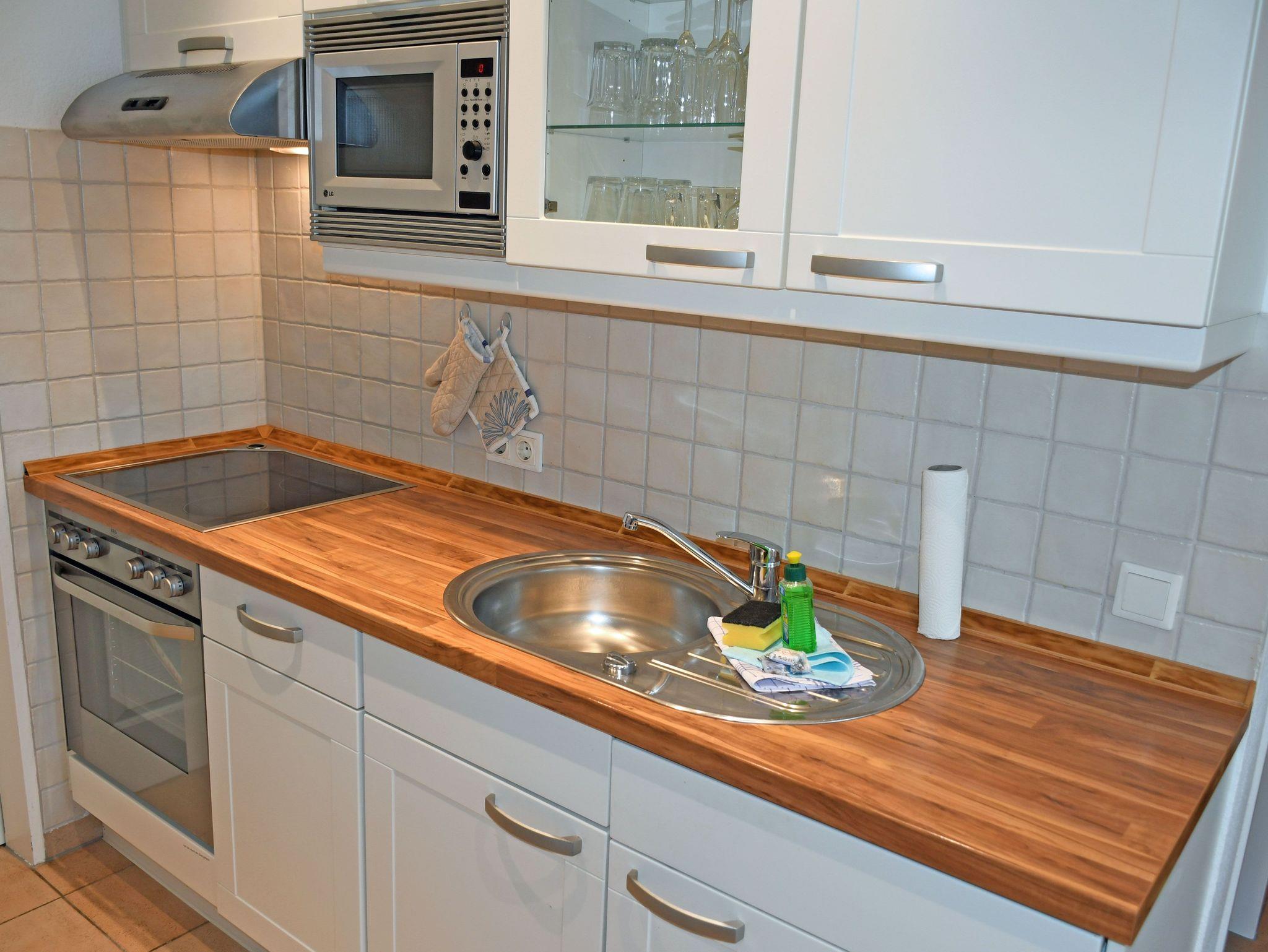 - Küchenzeile mit Ceranfeldherd, Backofen, Abzugshaube, Geschirrspüler, Wasserkocher, Kaffeemaschine, Toaster, Kühlschrank mit Gefrierfach