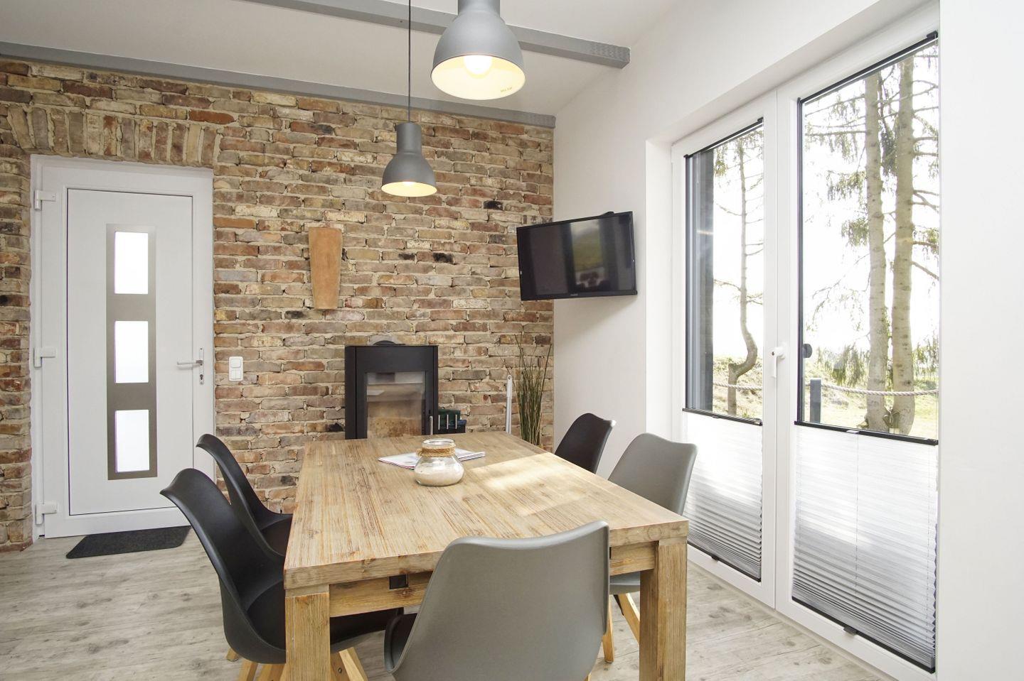 WOHNEN // Wohnraum mit Essbereich, bequeme Couch, Flachbild-TV mit DVD-Player, Kamin ++