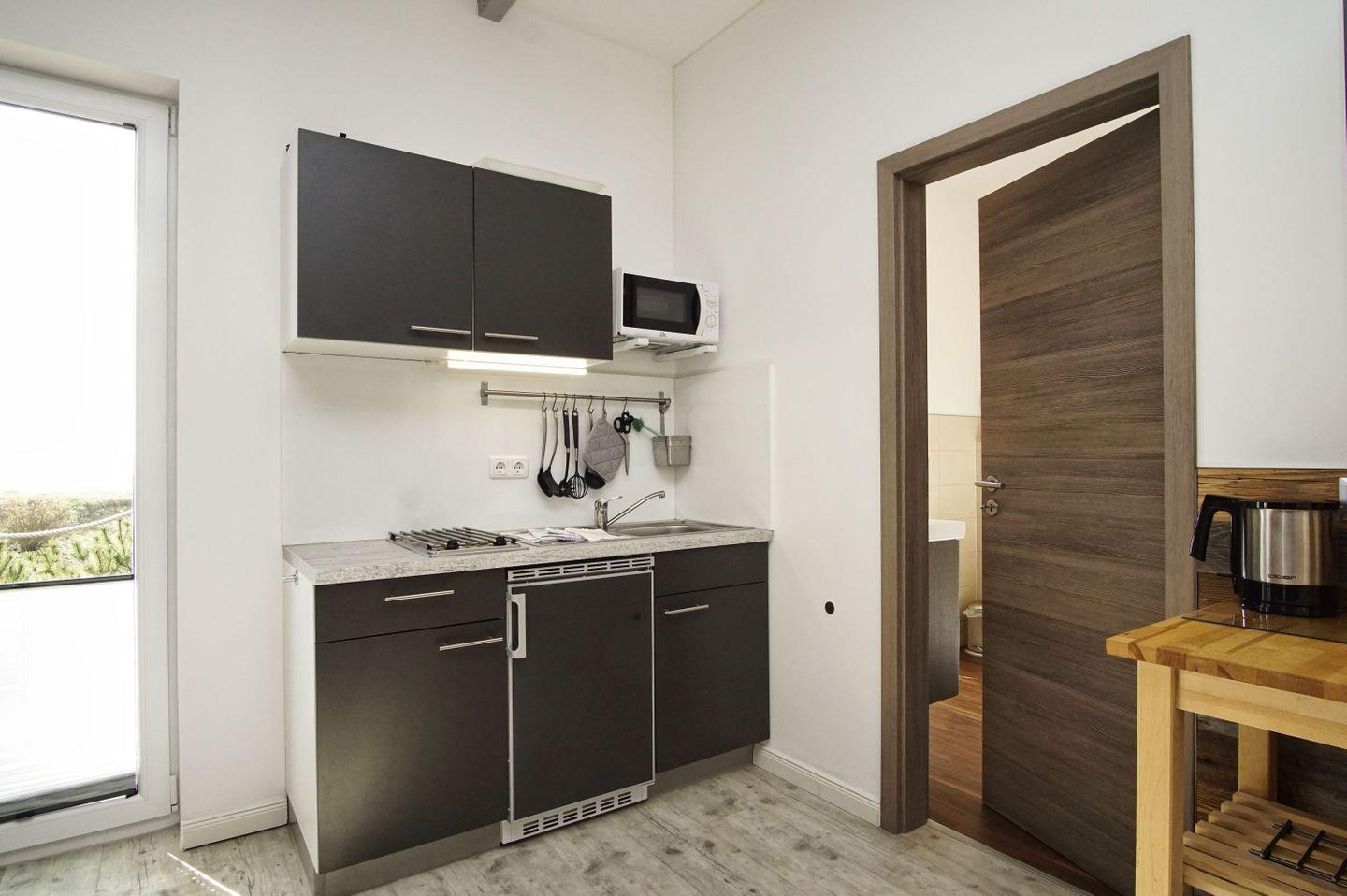 KÜCHE // offene Pantrykücke, Kühlschrank mit Gefrierfach, Mikrowelle, Toaster, Wasserkocher, Kaffeemaschine, reichlich Besteck, Geschirr und Küchenutensilien ++