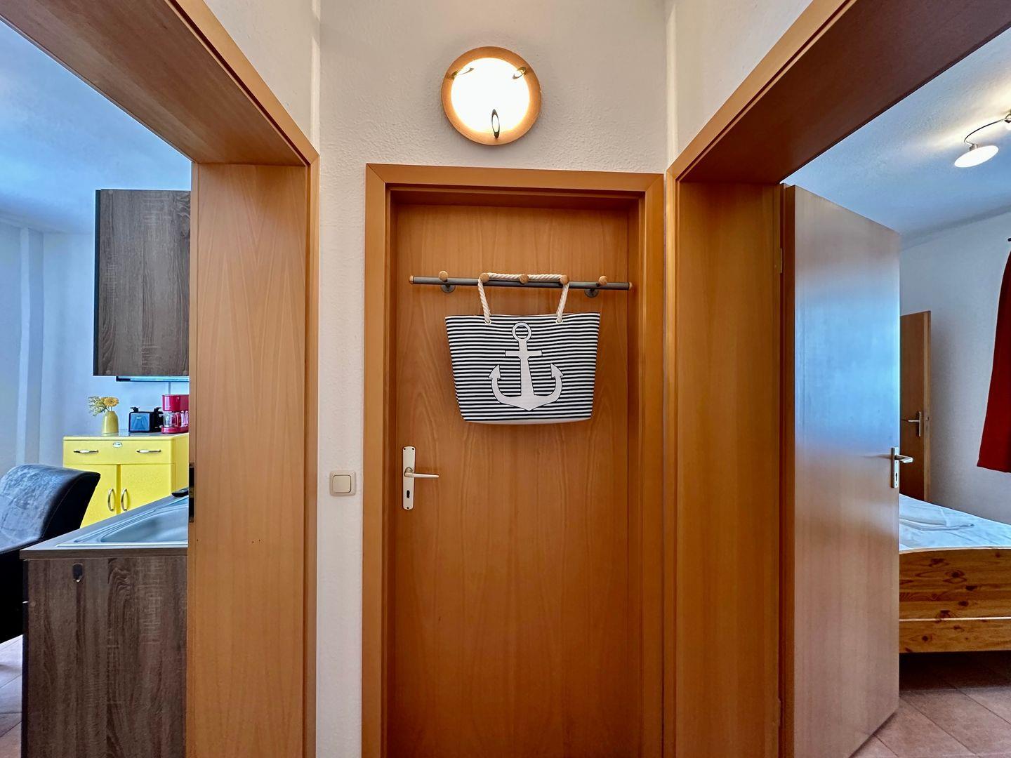 Die Wohnung befindet sich im Erdgeschoss, nur wenige Schritte von der Badestelle am Bodden entfernt. Kostenfreie Parkplätze stehen direkt auf dem Grundstück zur Verfügung.