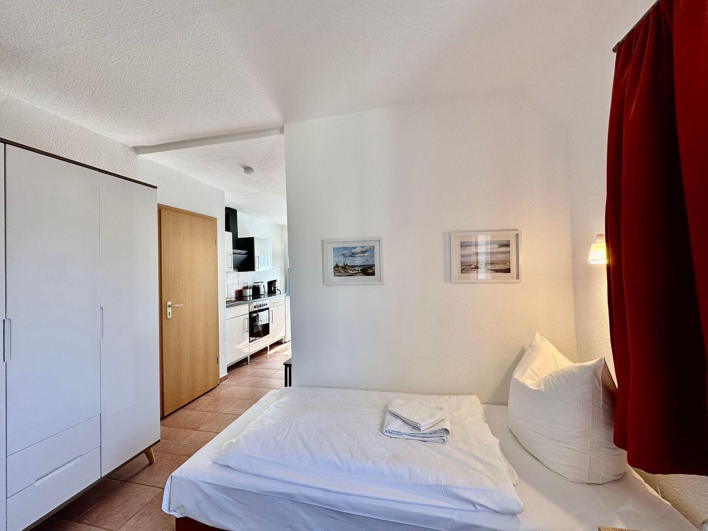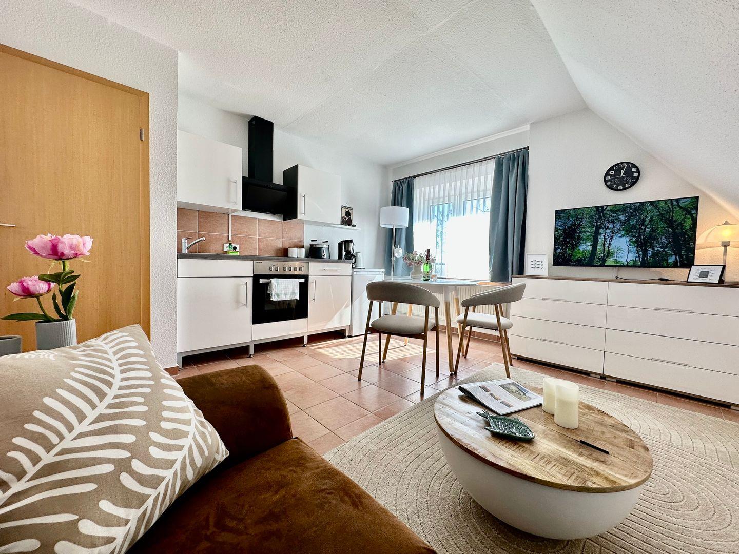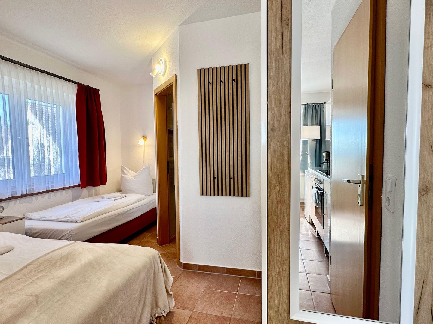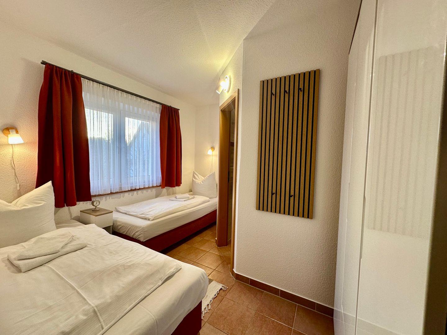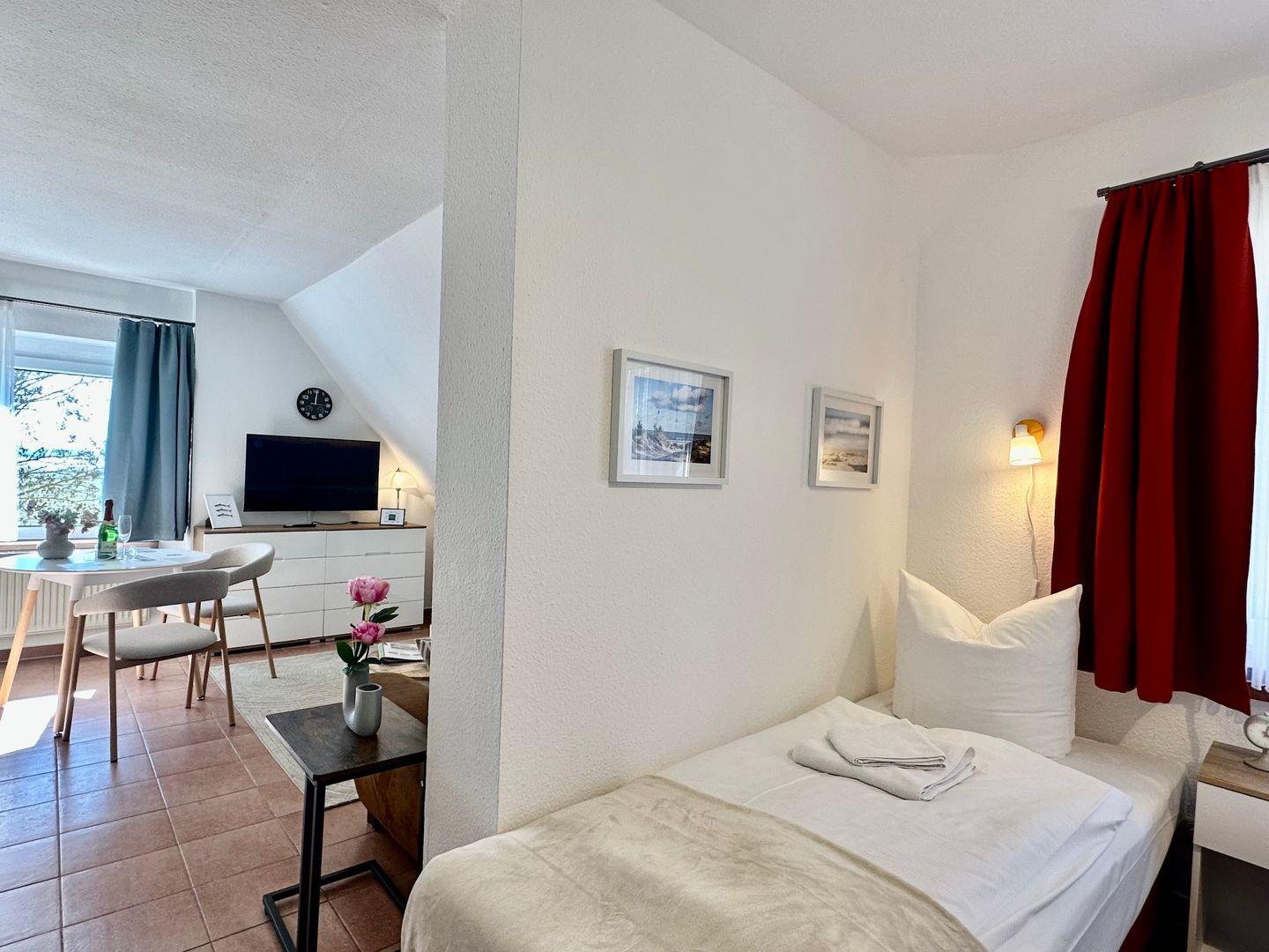 Das Apartment verfügt über zwei Einzelbetten, einen kleinen Essbereich sowie eine gemütliche Sitzecke. Die Atmosphäre ist offen und hell – ideal für erholsame Urlaubstage.