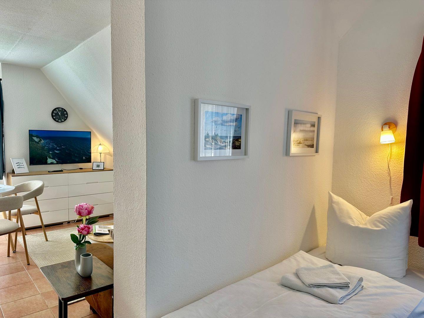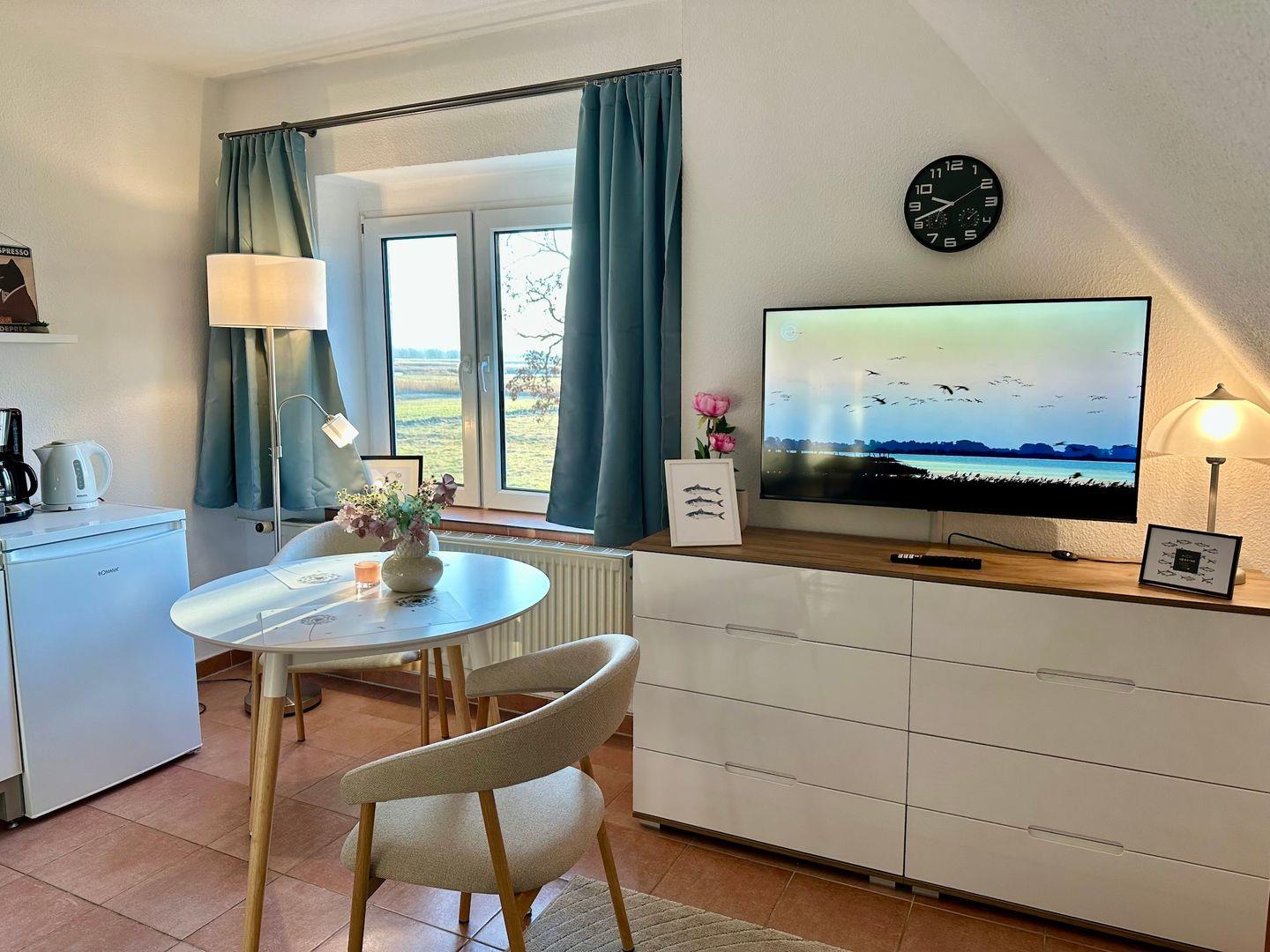 Dieses charmante 28?m² große Studio im Obergeschoss ist ideal für zwei Gäste, die Weitblick und Gemütlichkeit suchen. Besonders hervorzuheben ist der Balkon mit traumhaftem Blick auf den Bodden, der morgens wie abends zum Verweilen einlädt.