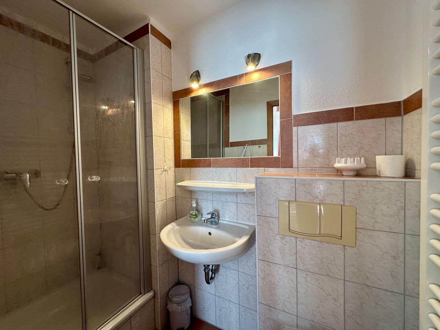 Das Badezimmer verfügt über eine Dusche, WC, Waschbecken, Vergrößerungsspiegel und Lüftung. Es ist funktional eingerichtet – frische Handtücher sind inklusive.