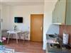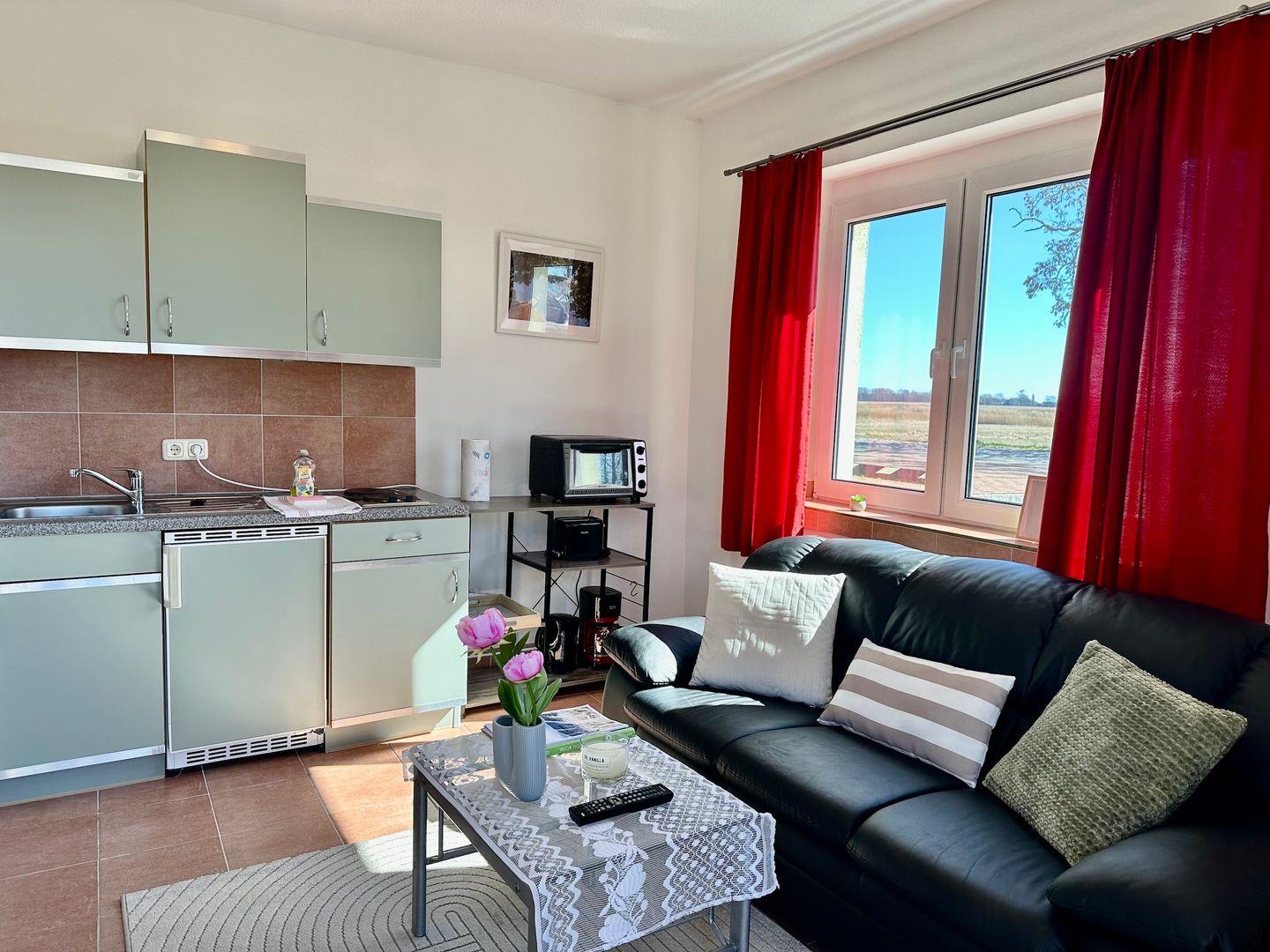 Der offen gestaltete Wohnbereich lädt zum Verweilen ein: Eine komfortable Couch und ein Esstisch für zwei Personen bieten Platz zum Entspannen oder für gemeinsame Mahlzeiten. Die integrierte Küchenzeile ist funktional ausgestattet – mit Herd, Backofen, Kühlschrank, Gefrierfach, Kaffeemaschine, Toaster, Wasserkocher sowie Geschirr und Kochutensilien.
