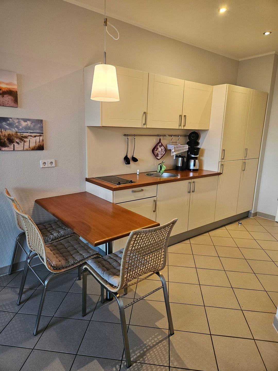 Das Apartment bietet Platz für bis zu 3 Personen und verfügt über ein großzügigen Wohn-/Schlafbereich mit Doppelbett, Pantryküche mit Essplatz, Badezimmer, Terrasse, PKW-Stellplatz. Für den perfekten Start in den Urlaub sind die Betten bei Anreise frisch bezogen und eine Erstausstattung Handtücher liegt bereit. Die Nutzung des Schwimm-und Fitnessbereichs sowie der Saunalandschaft sind im Mietpreis inklusive.