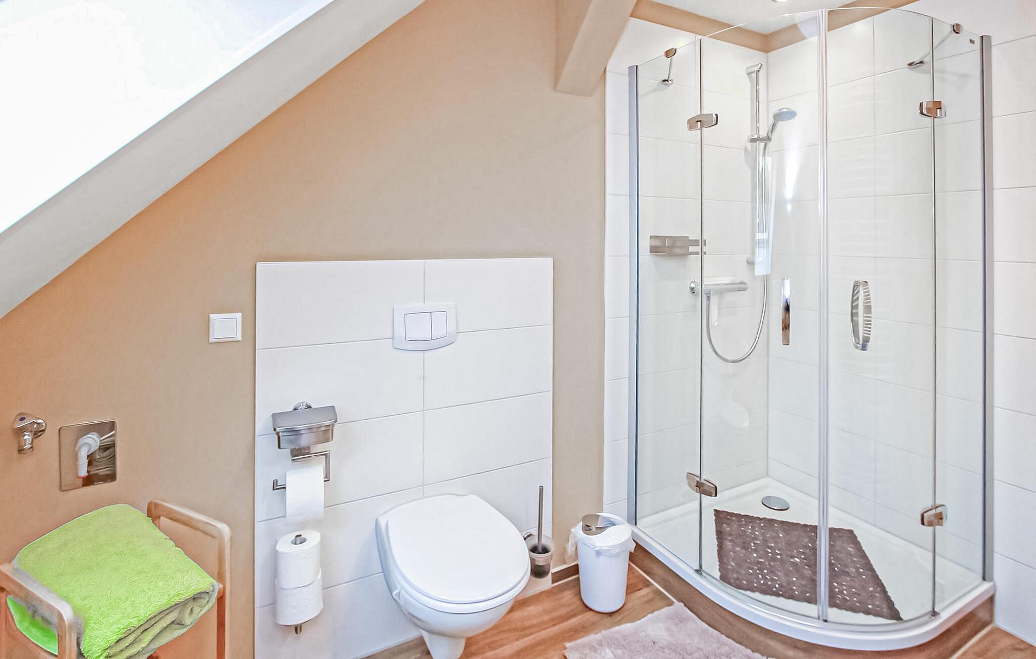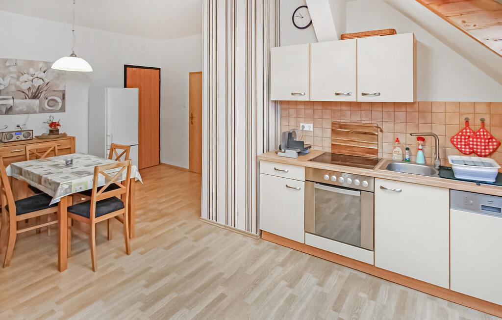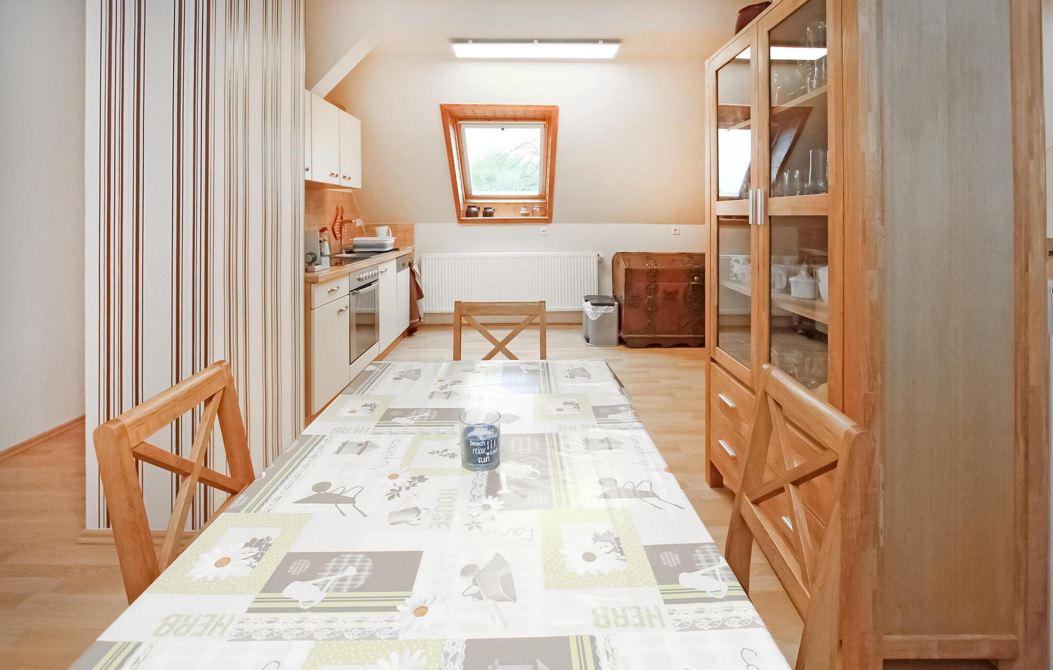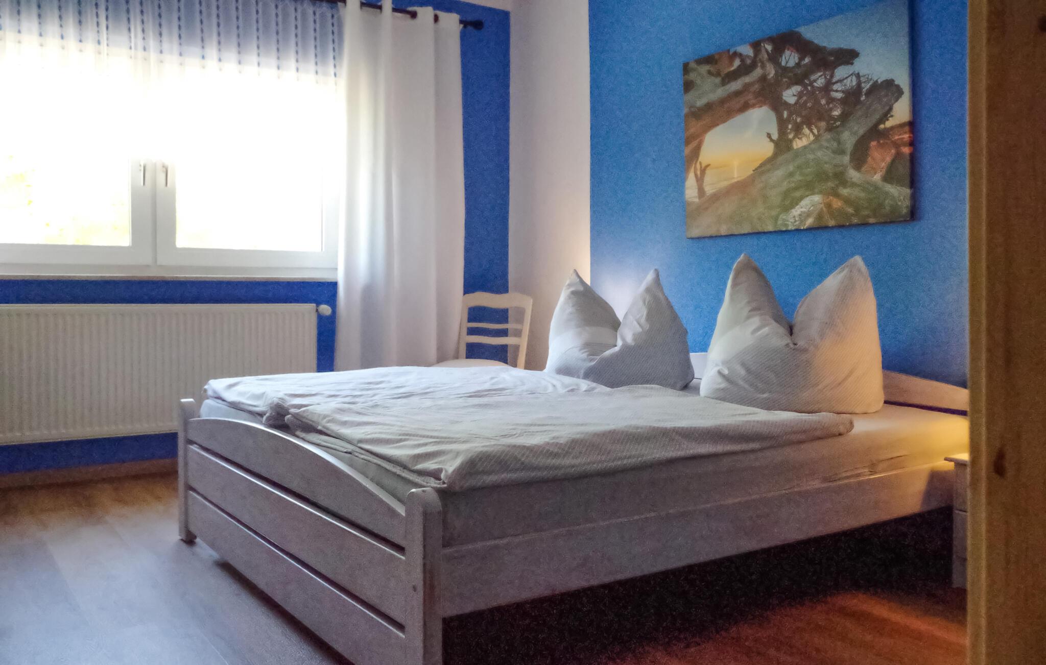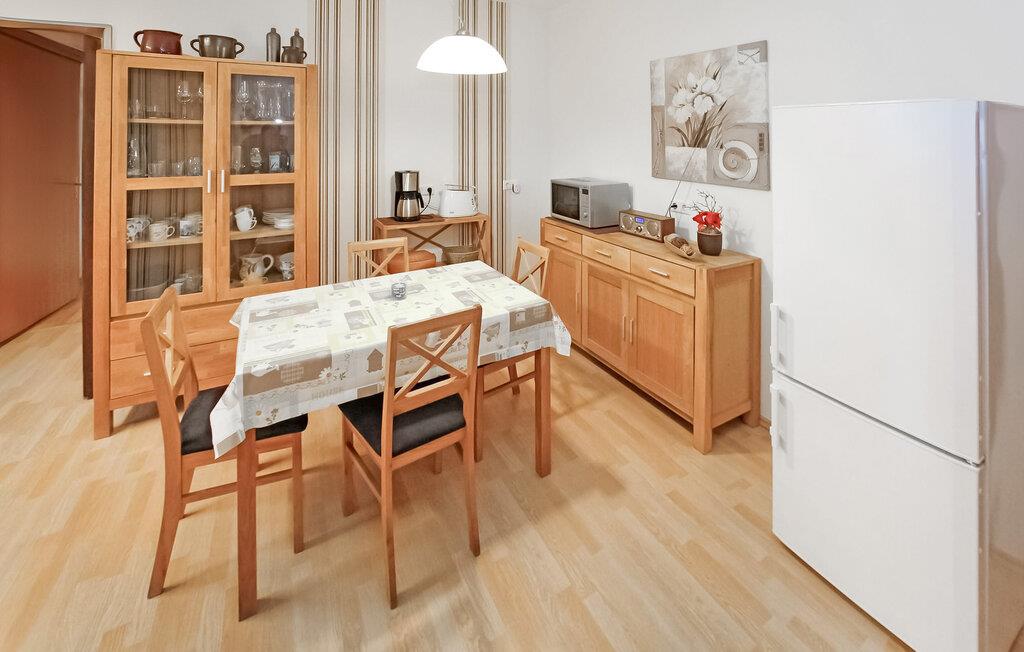 Den cirka 70 kvm store treværelses ferielejlighed til 2 personer ligger separat på øverste etage i ejerboligen på den cirka 1000 kvm store beboelsesejendom direkte ved Den Sorte Sø. Adgang sker via en separat udvendig trappe. Lejligheden er moderniseret i 2019 og er udstyret med stue (polstrede møbler, fladskærms-tv, radio/CD), 2 soveværelser (1 x dobbeltseng, 1 x fransk dobbeltseng, bredde: 1,40 m), stort køkken (spisebord, el-komfur med ovn, køleskab med fryser, opvaskemaskine, mikroovn, diverse køkkenmaskiner) samt badeværelse med brus/toilet. Lejligheden opvarmes med centralvarme. Der er en lille altan med opholdsområde og en vidunderlig udsigt over søen, et møbleret udendørs opholdsområde med liggestole og en grill, et sikkert sted at opbevare cykler og en parkeringsplads. Internet (WLAN) er også tilgængeligt. En robåd kan også lejes direkte fra ejeren (5 EUR/dag). Den samlede pris inkluderer slutrengøring og vandforbrug. Du kan medbringe dit eget sengelinned og håndklæder eller leje dem på stedet. El/energi afregnes efter forbrug. Kæledyr er ikke tilladt. Ejeren driver en have certificeret med Naturen i Havens kvalitetsmærke, hvor du kan købe hjemmelavede produkter som marmelade, likør og sirup. Husets gæster modtager en gratis krukke marmelade ved ankomsten. Schwarz er et lille feriested ved søen af samme navn i et charmerende sølandskab mellem Müritz og delstatsgrænsen til Brandenburg. Bymidten er en klassisk landsbykirke fra det 18. århundrede. Derudover bestemmer adskillige ferieboliger landsbyens udseende. Schwarzer See er en smuk bade- og fiskesø med to strande og et festivalområde med restaurant (sæsonbestemt drift). Motorbåde er ikke tilladt på søen, hvilket gør den behagelig stille i forhold til mange andre søer i regionen. Der er også cykeludlejning i Schwarz.Den lille by Mirow ligger omkring 5 km væk. Det ligger direkte ved Müritz-Havel-vandvejen og er en attraktion for vandsportsentusiaster og vandrere. Den største attraktion er Slotsøen med Mirow Slot, som først genåbnede i juni 2014 efter mange års restaurering, 3 Queens Palace, den idylliske Love Island, St. John's Church og Old Castle Brewery med oplevelsesgastronomi. Der er flere restauranter og caféer i byen, et fiskerøgeri, butikker og båd- og cykeludlejning. Mirow kan nemt nås med tog via jernbaneforbindelsen til Neustrelitz.