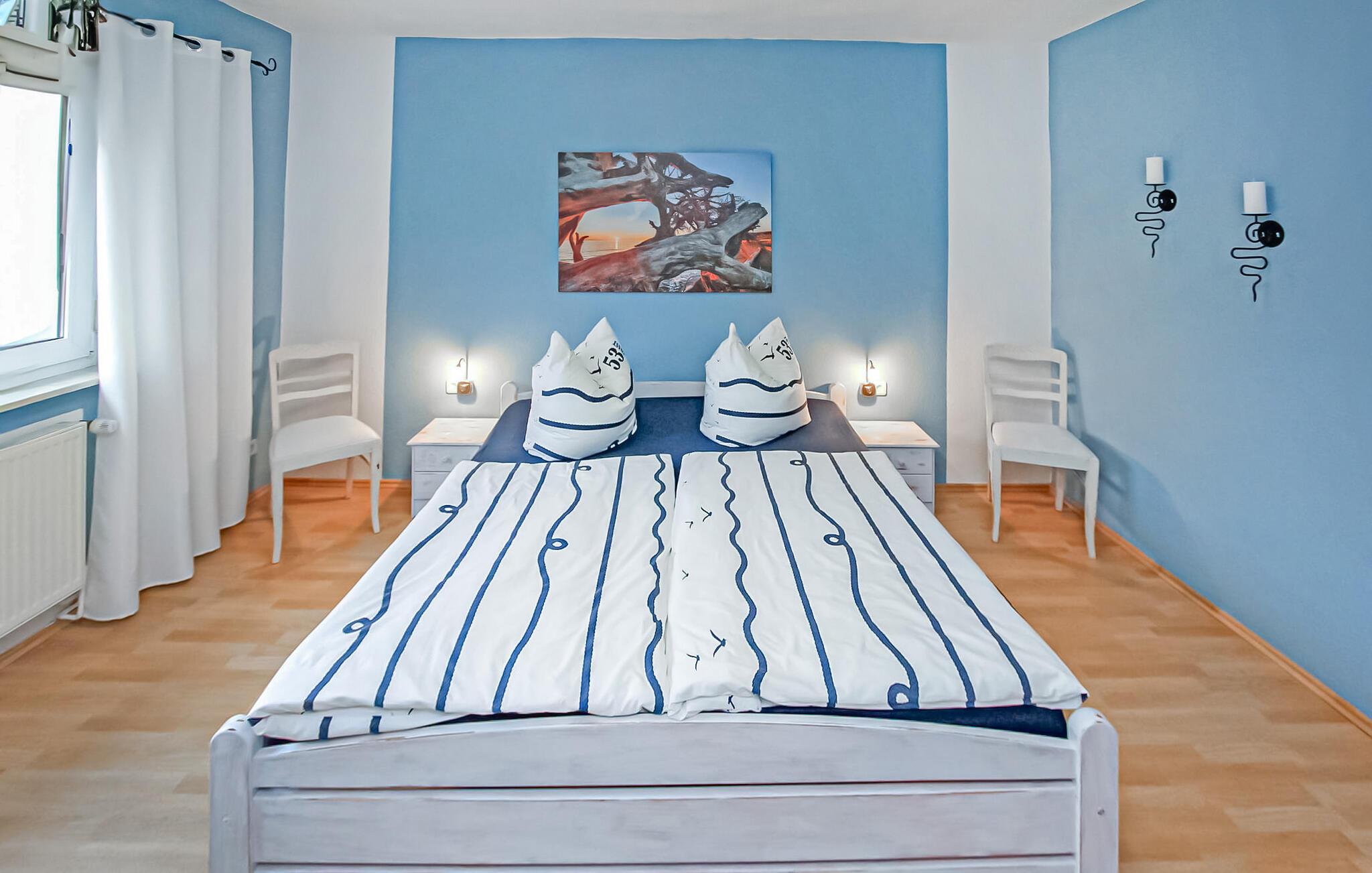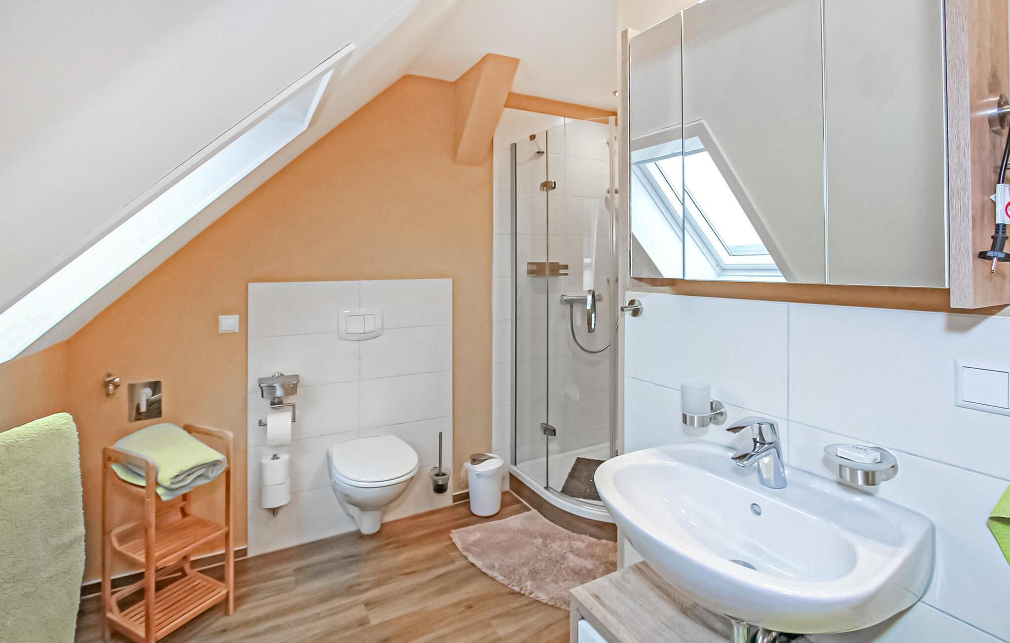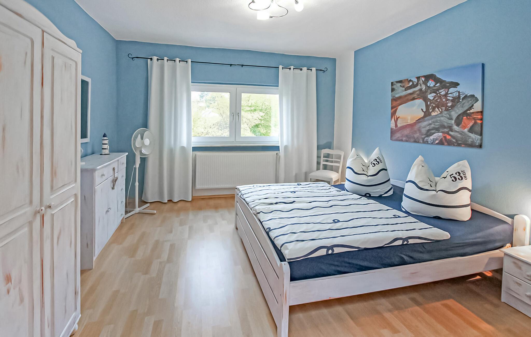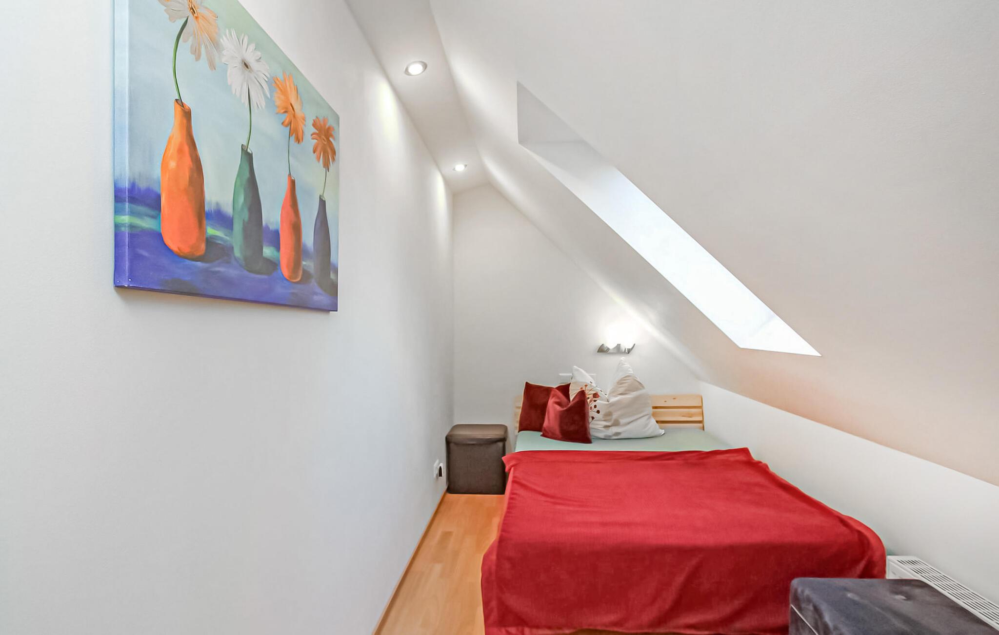 Den cirka 70 kvm store treværelses ferielejlighed til 2 personer ligger separat på øverste etage i ejerboligen på den cirka 1000 kvm store beboelsesejendom direkte ved Den Sorte Sø. Adgang sker via en separat udvendig trappe. Lejligheden er moderniseret i 2019 og er udstyret med stue (polstrede møbler, fladskærms-tv, radio/CD), 2 soveværelser (1 x dobbeltseng, 1 x fransk dobbeltseng, bredde: 1,40 m), stort køkken (spisebord, el-komfur med ovn, køleskab med fryser, opvaskemaskine, mikroovn, diverse køkkenmaskiner) samt badeværelse med brus/toilet. Lejligheden opvarmes med centralvarme. Der er en lille altan med opholdsområde og en vidunderlig udsigt over søen, et møbleret udendørs opholdsområde med liggestole og en grill, et sikkert sted at opbevare cykler og en parkeringsplads. Internet (WLAN) er også tilgængeligt. En robåd kan også lejes direkte fra ejeren (5 EUR/dag). Den samlede pris inkluderer slutrengøring og vandforbrug. Du kan medbringe dit eget sengelinned og håndklæder eller leje dem på stedet. El/energi afregnes efter forbrug. Kæledyr er ikke tilladt. Ejeren driver en have certificeret med Naturen i Havens kvalitetsmærke, hvor du kan købe hjemmelavede produkter som marmelade, likør og sirup. Husets gæster modtager en gratis krukke marmelade ved ankomsten. Schwarz er et lille feriested ved søen af samme navn i et charmerende sølandskab mellem Müritz og delstatsgrænsen til Brandenburg. Bymidten er en klassisk landsbykirke fra det 18. århundrede. Derudover bestemmer adskillige ferieboliger landsbyens udseende. Schwarzer See er en smuk bade- og fiskesø med to strande og et festivalområde med restaurant (sæsonbestemt drift). Motorbåde er ikke tilladt på søen, hvilket gør den behagelig stille i forhold til mange andre søer i regionen. Der er også cykeludlejning i Schwarz.Den lille by Mirow ligger omkring 5 km væk. Det ligger direkte ved Müritz-Havel-vandvejen og er en attraktion for vandsportsentusiaster og vandrere. Den største attraktion er Slotsøen med Mirow Slot, som først genåbnede i juni 2014 efter mange års restaurering, 3 Queens Palace, den idylliske Love Island, St. John's Church og Old Castle Brewery med oplevelsesgastronomi. Der er flere restauranter og caféer i byen, et fiskerøgeri, butikker og båd- og cykeludlejning. Mirow kan nemt nås med tog via jernbaneforbindelsen til Neustrelitz.