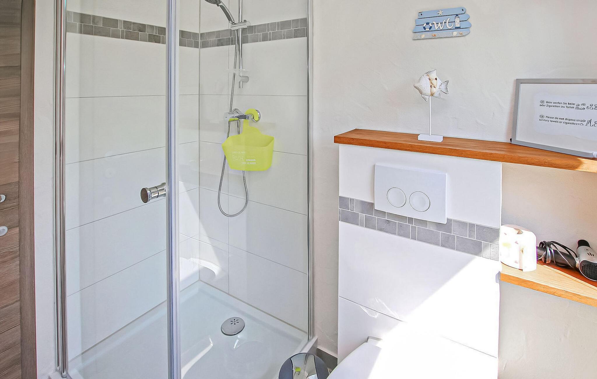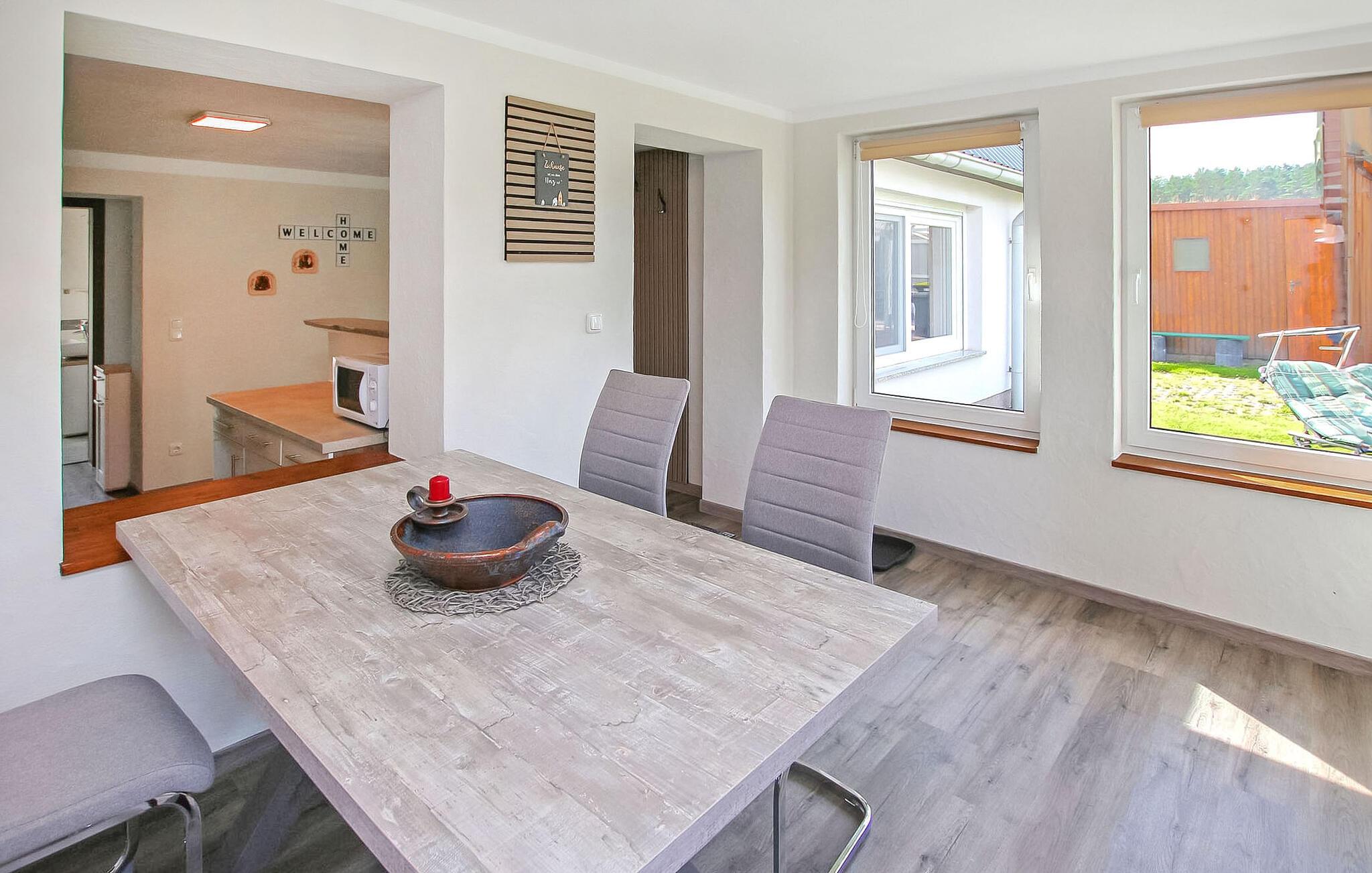 Det cirka 50 kvm store hus, fuldstændig renoveret i 2023, til op til 3 voksne og 1 baby har en stue, et separat (åbent) køkken med tilstødende veranda (lem, spisebord), to soveværelser (1 x dobbeltseng, 1 x 1 enkeltseng), en lille terrasse lige foran huset og en ekstra carport med siddeplads. Den anden lejlighed DZV446 tilbyder plads til 4 personer. Parkering, cykelopbevaring, liggestole, møblerede terrasser med grill og gratis Wi-Fi. Der er også Wi-Fi. Ejernes smukke, rummelige grund med pejs kan benyttes. Slutrengøring, el- og vandomkostninger er inkluderet i den samlede pris. (INGEN opladningsmuligheder til elbiler!) Medbring venligst eget sengelinned og håndklæder. Betales på stedet: turistskat, brænde (1 kurv gratis, yderligere mod et gebyr). Kæledyr er ikke tilladt i denne ejendom.