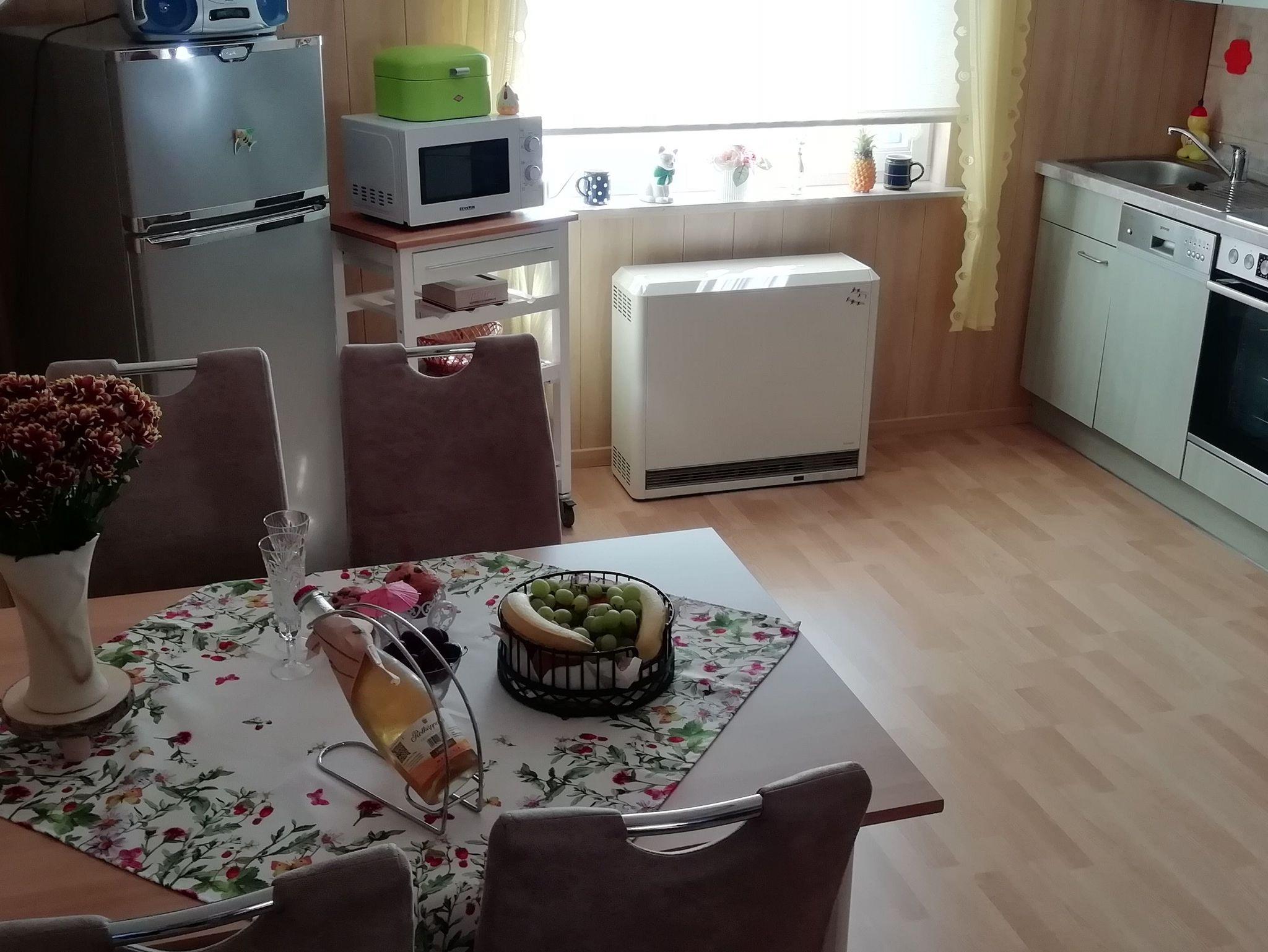 Die offene Küche ist voll ausgestattet und verfügt über eine Küchenzeile mit Induktionsherd und Backofen, Spülmaschine, Kühlschrank mit Gefrierteil, Mikrowelle und einem Esstisch mit 4 Stühlen.