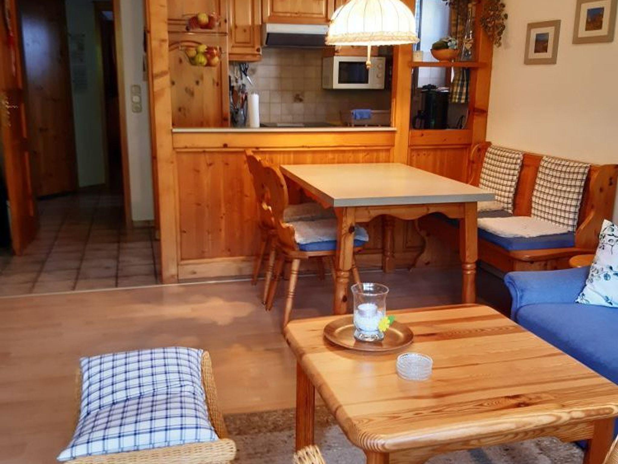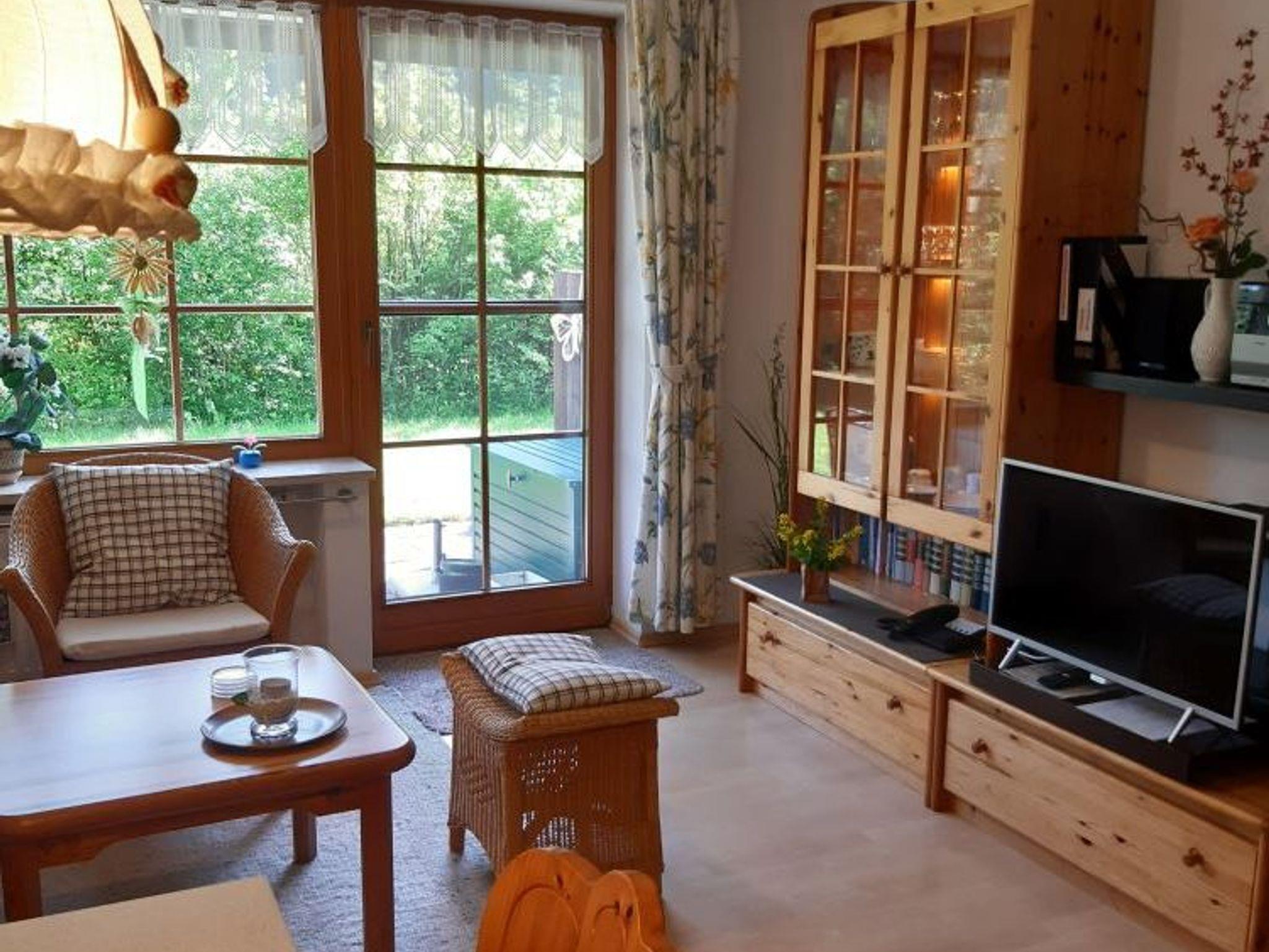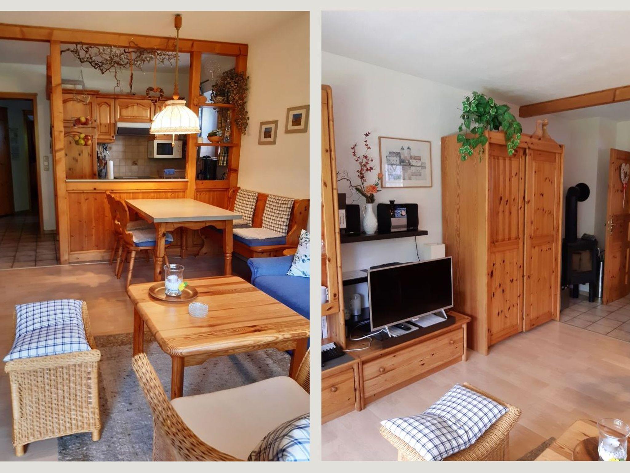 Der Wohnbereich verfügt über eine Sitz- und Essecke sowie eine hochwertige, ausziehbare Schlafcouch für zwei Personen. Zur weiteren Ausstattung gehören ein Flachbildfernseher mit Kabelanschluss und Radiofunktion, kostenloses WLAN, eine Stereoanlage mit Kassette, CD und Radio, ein Telefon, ein Vitrinenschrank, zusätzlicher Kleiderschrank, ein Kaminofen sowie Gesellschaftsspiele, Bücher und eine Wanderkarte.
