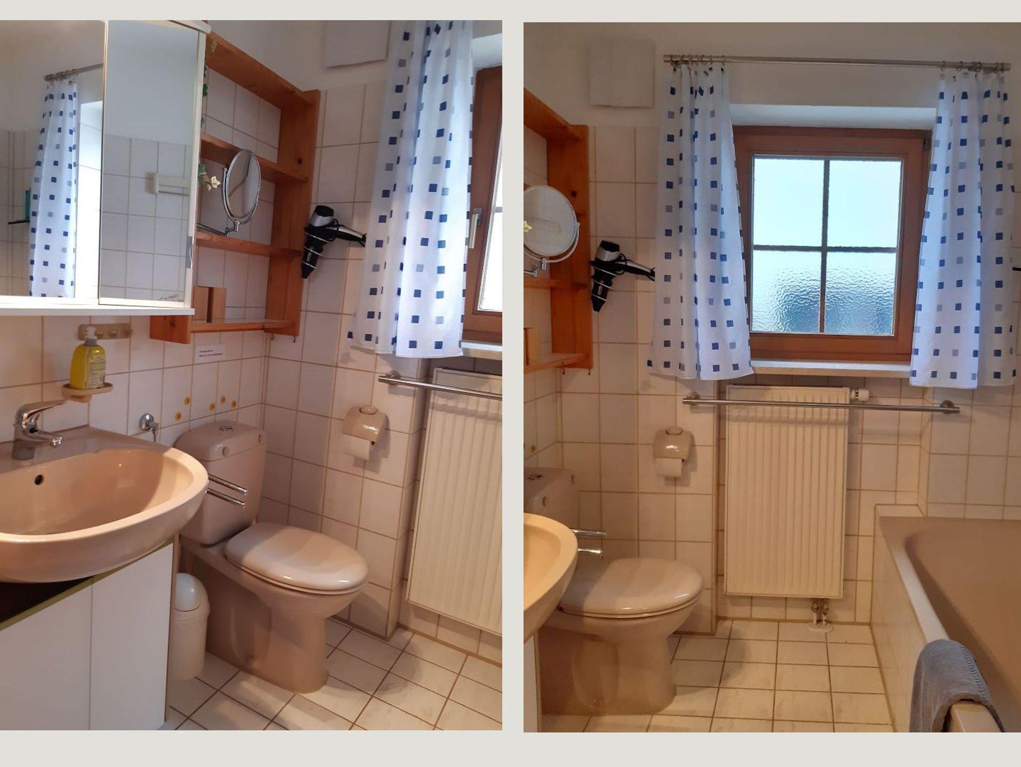 Das Badezimmer umfasst eine Badewanne mit Duschabtrennung, Waschbecken mit Spiegelschrank, Vergrößerungsspiegel, Föhn sowie zahlreiche Haken und Abstellflächen. Das WC ist mit einer wassersparenden Spültaste ausgestattet.
