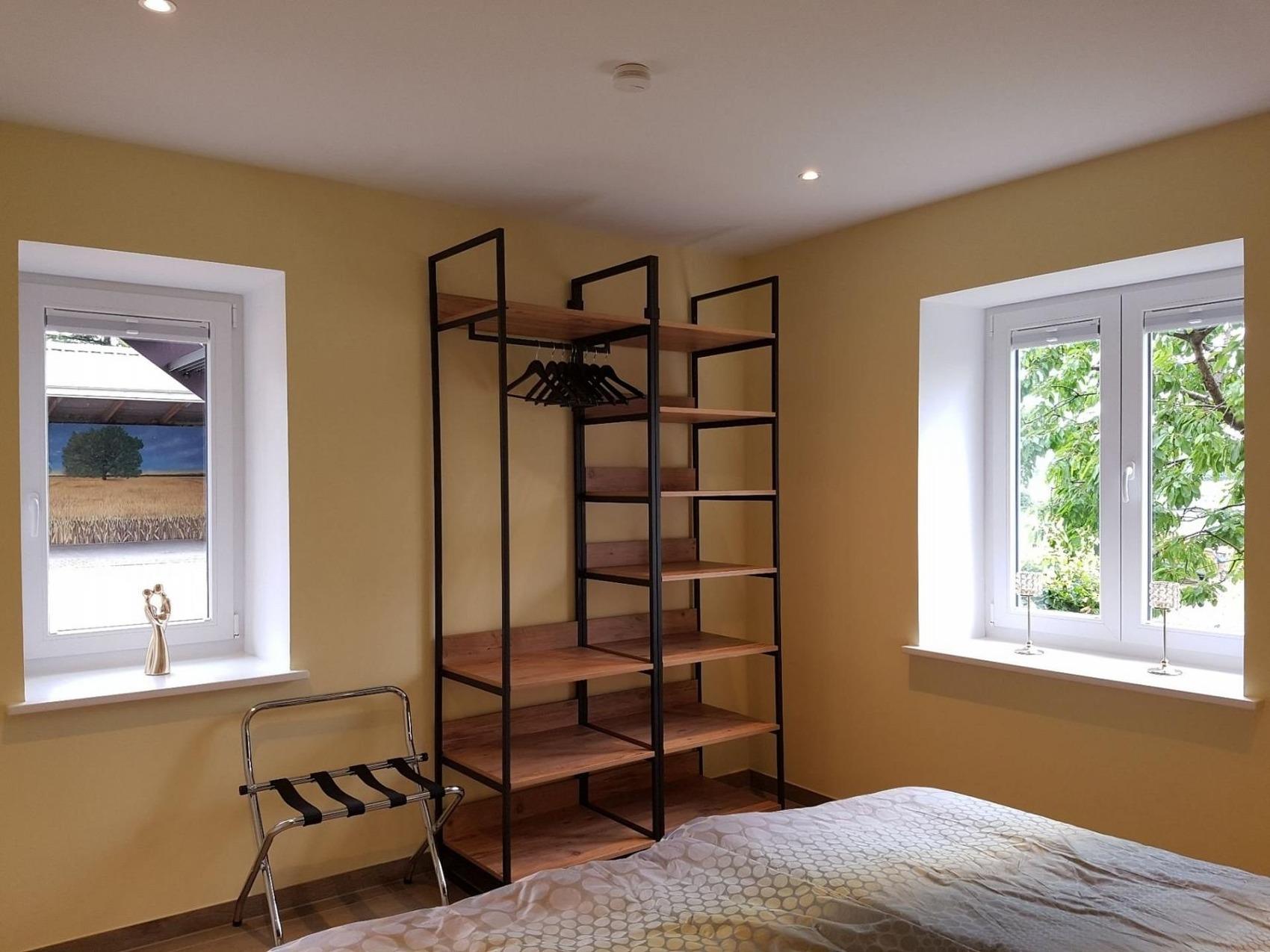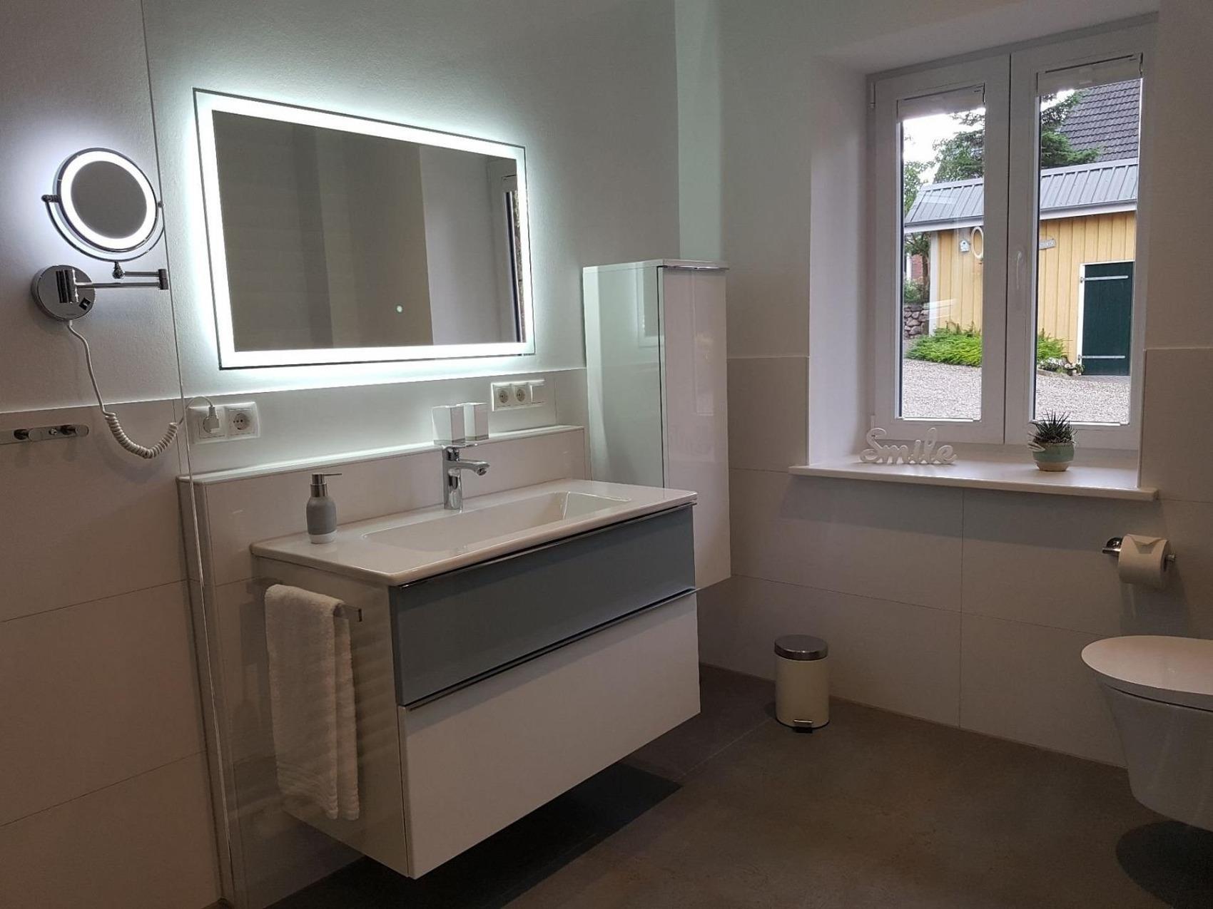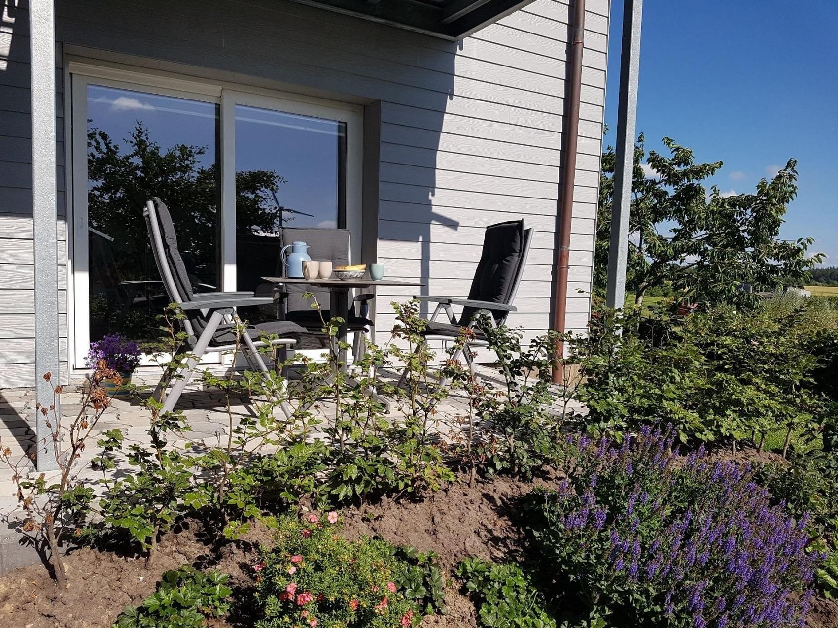 Diese im Juli 2022 fertiggestellte Wohnung mit 53 qm Wohnfläche im Erdgeschoss und einer Terrasse Richtung Westen ist für 2 - 4 Personen geeignet. Sie verfügt über ein Schlafzimmer mit Doppelbett, ein Bad mit großer Dusche und beheiztem Handtuchhalter, sowie eine geschmackvoll eingerichtete Diele. Es erwartet Sie eine voll ausgestattete Küche mit großzügigem Essbereich, in der Sie mit Freude köstliche Menüs anrichten können. Die offene Küche geht über in einen kommodigen Wohnbereich mit direktem Zugang zur Terrasse, auf der Sie gemütliche Stühle mit Tisch zum Entspannen finden. Der Wohnraum verfügt über ein Smart TV, ein Digitalradio sowie über eine Couch mit integriertem Matratzenbett (140x200) und bietet somit den Schlafplatz 3+4. Ausdrucksvolle Fototapeten im Wohn- und Schlafzimmer geben dieser Wohnung ihren sehr individuellen Charme. Die Böden im Bad, in der Küche und im Wohnbereich sind mit hochwertigen Steinfliesen und Fußbodenheizung ausgestattet. Dank einer integrierten Be- und Entlüftungsanlage ist stets ein angenehmes Raumklima vorhanden. Im gemeinschaftlichen Hauswirtschaftsraum stehen Ihnen Waschmaschine, Trockner, Spüle, Akkustaubsauger, Bügelbrett und Mineralwasser kostenfrei zur Verfügung.Die Vermietung der Ferienwohnungen erfolgt ausschließlich zu touristischen Zwecken.Die Aufnahme von Monteuren oder die Nutzung der Wohnungen zu gewerblichen Zwecken ist nur nach vorheriger Absprache möglich. Die Wohnungen werden, ebenfalls nach vorheriger Absprache, an max. 1 bis 2 Personen pro Wohnung vermietet. Bei längeren Aufenthalten wird wöchentlich eine Zwischenreinigung zu den aktuellen Konditionen durchgeführt.
