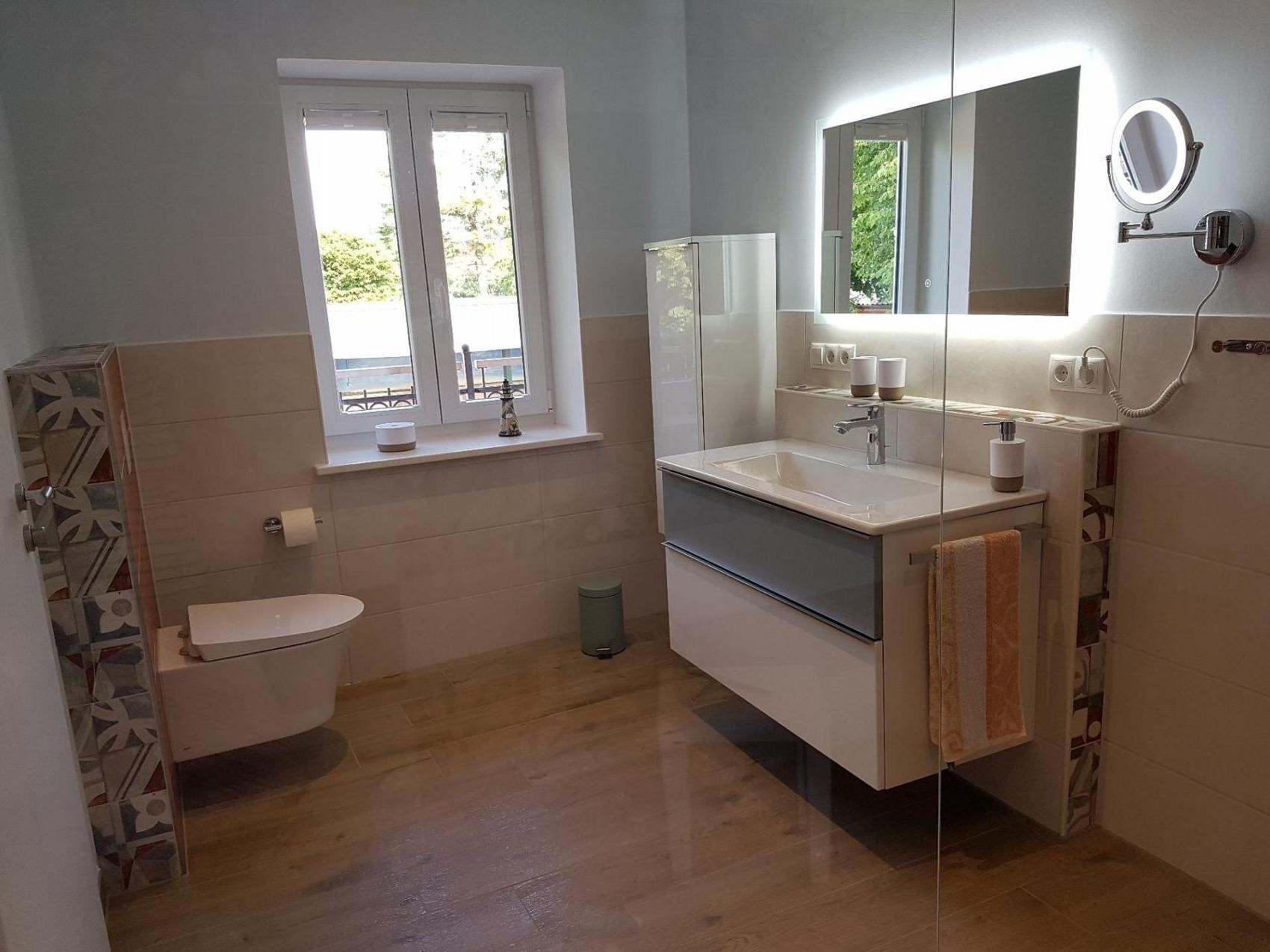 Diese im Juli 2022 fertiggestellte Wohnung mit 53 qm Wohnfläche im Obergeschoss und einem Balkon Richtung Westen ist für 2 - 4 Personen geeignet. Sie verfügt über ein Schlafzimmer mit Doppelbett, ein Bad mit großer Dusche und beheiztem Handtuchhalter, sowie eine geschmackvoll eingerichtete Diele. Es erwartet Sie eine voll ausgestattete Küche mit großzügigem Essbereich, in der Sie mit Freude köstliche Menüs anrichten können. Die offene Küche geht über in einen kommodigen Wohnbereich mit direktem Zugang zum Balkon, auf dem Sie gemütliche Stühle mit Tisch und Sonnenschirm zum Entspannen finden. Der Wohnraum verfügt über ein Smart TV, ein Digitalradio sowie über eine Couch mit Schlaffunktion (120x200) und bietet somit den Schlafplatz 3+4. Ausdrucksvolle Fototapeten im Wohn- und Schlafzimmer geben dieser Wohnung ihren sehr individuellen Charme. Die Böden im Bad, in der Küche und im Wohnbereich sind mit hochwertigen Steinfliesen und Fußbodenheizung ausgestattet. Dank einer integrierten Be- und Entlüftungsanlage ist stets ein angenehmes Raumklima vorhanden. Im gemeinschaftlichen Hauswirtschaftsraum stehen Ihnen Waschmaschine, Trockner, Spüle, Akkustaubsauger, Bügelbrett und Mineralwasser kostenfrei zur Verfügung.Die Vermietung der Ferienwohnungen erfolgt ausschließlich zu touristischen Zwecken.Die Aufnahme von Monteuren oder die Nutzung der Wohnungen zu gewerblichen Zwecken ist nur nach vorheriger Absprache möglich. Die Wohnungen werden, ebenfalls nach vorheriger Absprache, an max. 1 bis 2 Personen pro Wohnung vermietet. Bei längeren Aufenthalten wird wöchentlich eine Zwischenreinigung zu den aktuellen Konditionen durchgeführt.