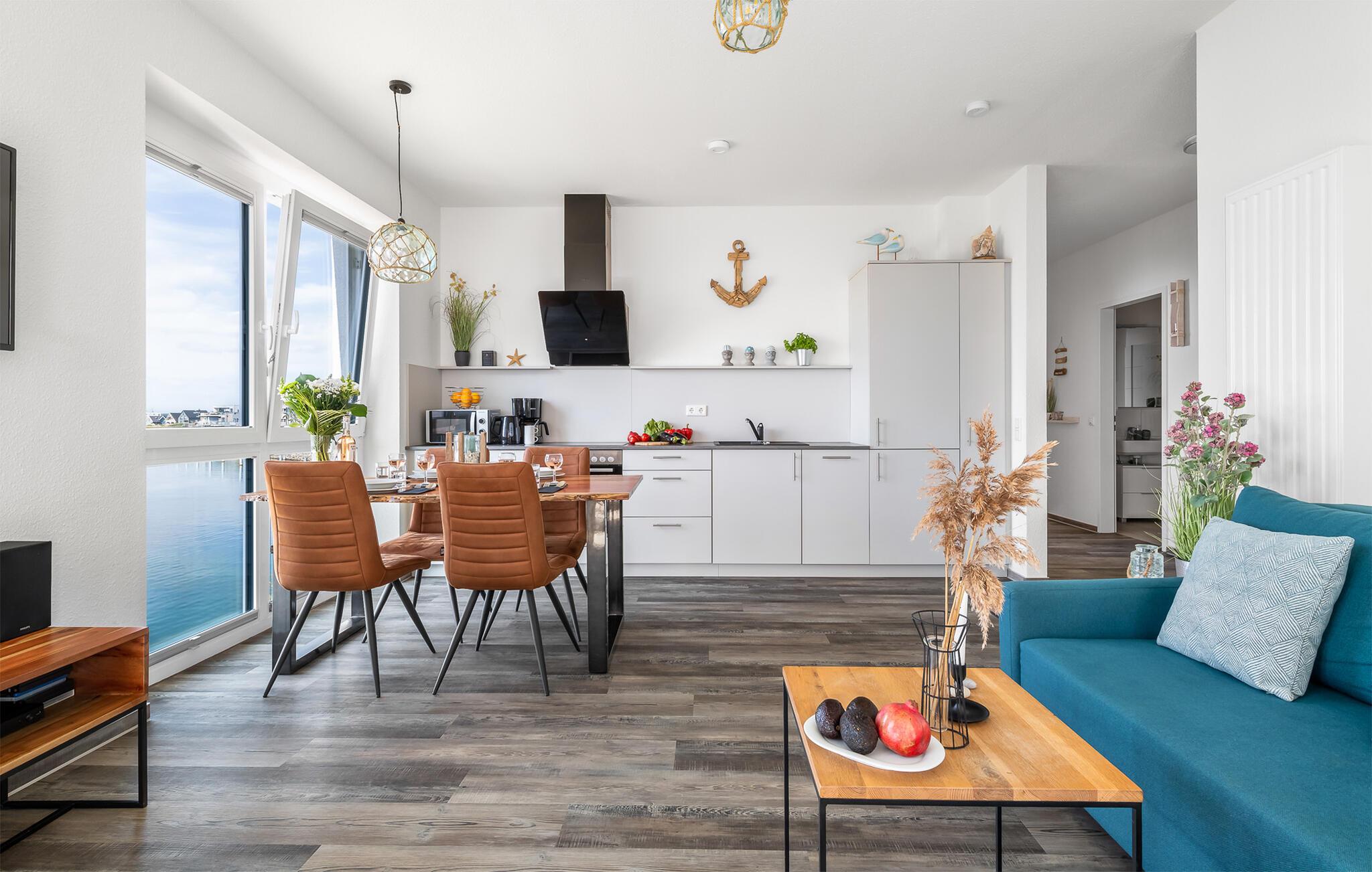 Det moderne og fuldt udstyrede køkken lader intet tilbage at ønske og inviterer til fælles madlavning. Uanset om morgenmad, frokost eller en festlig middag, her har I alt, hvad I behøver, direkte foran panoramavinduet. Til underholdning i nordisk regnvejr er der Wi-Fi og tre Smart-TV'er til rådighed i lejligheden.